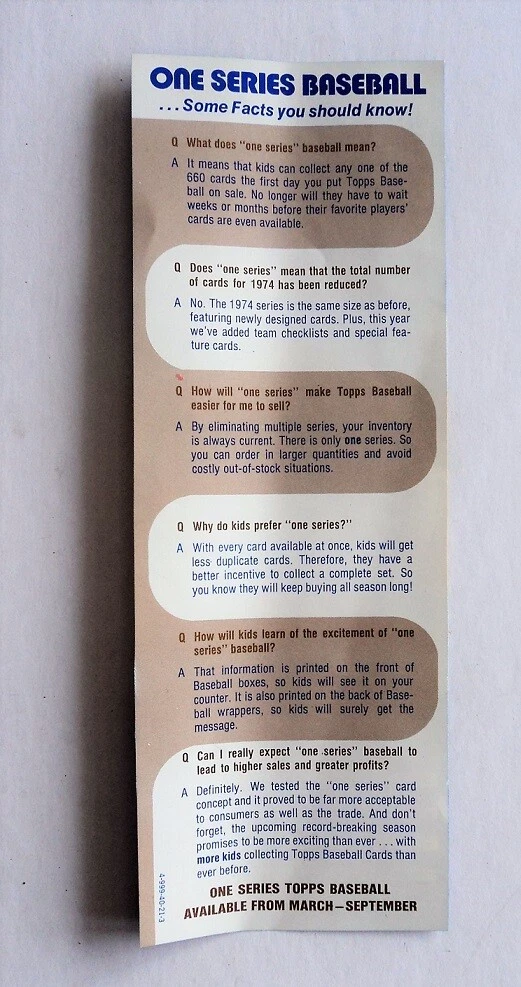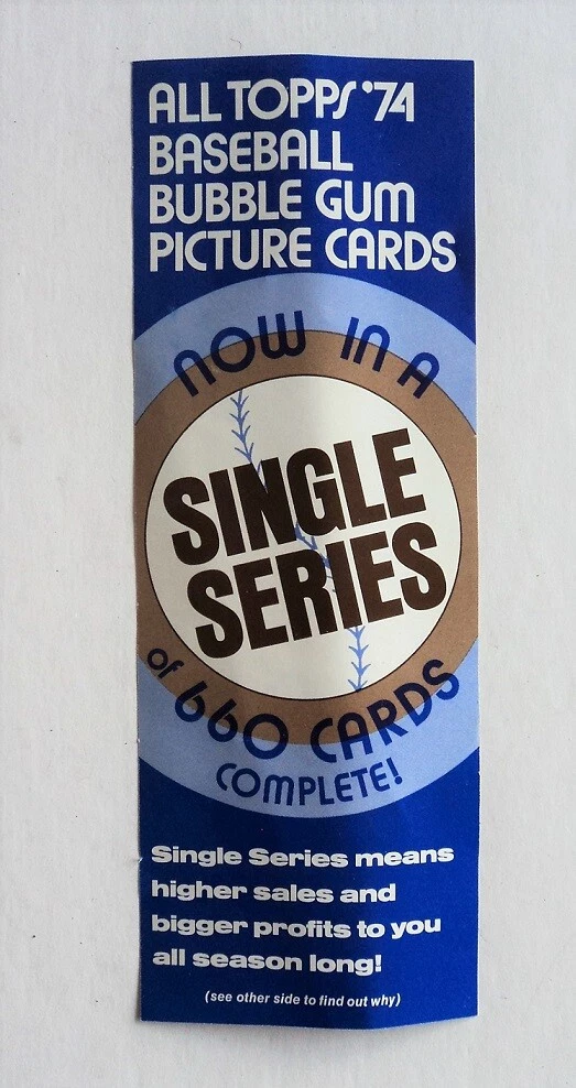 Super RARE Topps display box insert ad ..... only put into the wax pack boxes very early in the year of 1974 when they introduced the full set in the packs, doing away with issuing the cards in series. -- MINT condition. --- Check out our other oddball BB Collectibles in our ebay store "" Baseball Diamonds Are Forever "" .
