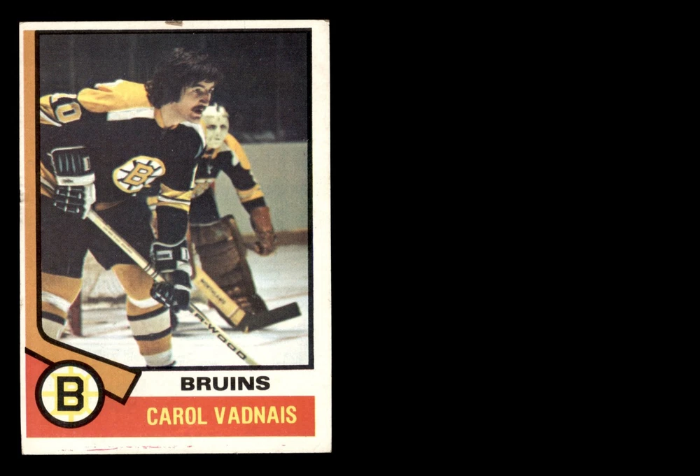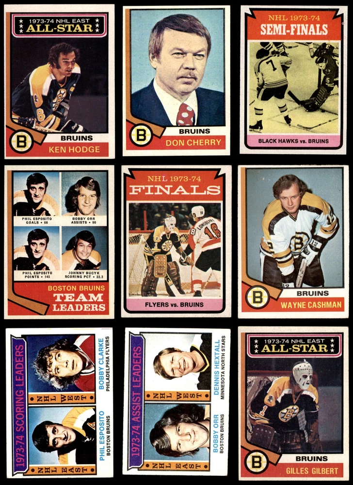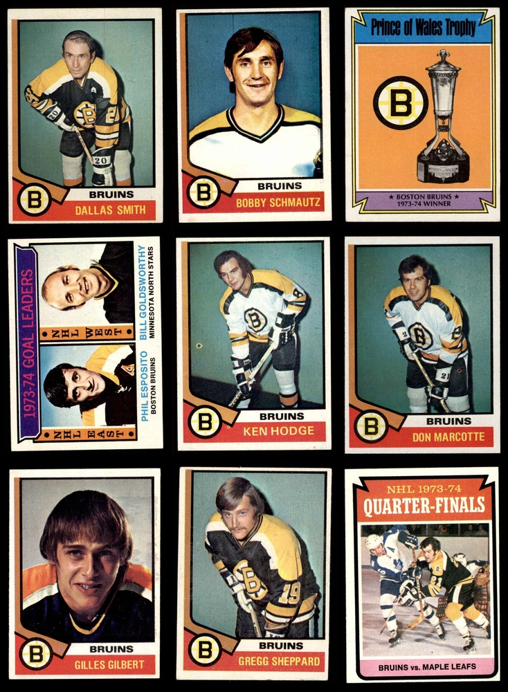 This set contains the following cards 1974 Topps #1 - Phil Esposito / Bill Goldsworthy Goals Leaders 4 - VG/EX Front Back 1974 Topps #2 - Bobby Orr / Dennis Hextall Assists Leaders 4 - VG/EX Front Back 1974 Topps #3 - Phil Esposito / Bobby Clarke Scoring Leaders 3 - VG Front Back 1974 Topps #10 Gilles Gilbert 4 - VG/EX Front Back 1974 Topps #27 Bobby Schmautz 4 - VG/EX Front Back 1974 Topps #28 - Phil Esposito / Bobby Orr / Johnny Bucyk Bruins Leaders 7 - NM Front Back 1974 Topps #100 Bobby Orr 5 - EX Front Back 1974 Topps #128 - Ken Hodge All-Star 4 - VG/EX Front Back 1974 Topps #129 - Phil Esposito All-Star 5 - EX Front Back 1974 Topps #130 - Bobby Orr All-Star 4 - VG/EX Front Back 1974 Topps #132 - Gilles Gilbert All-Star 4 - VG/EX Front Back 1974 Topps #146 Dallas Smith 4 - VG/EX Front Back 1974 Topps #161 Don Cherry 6 - EX/MT Front Back 1974 Topps #165 Carol Vadnais 4 - VG/EX Front Back 1974 Topps #184 Gregg Sheppard 4 - VG/EX Front Back 1974 Topps #200 Phil Esposito 5 - EX Front Back 1974 Topps #206 Wayne Cashman 4 - VG/EX Front Back 1974 Topps #211 Quarter Finals - Bruins vs. Maple Leafs 4 - VG/EX Front Back 1974 Topps #214 Semi-Finals - Bruins vs. Blackhawks 5 - EX Front Back 1974 Topps #215 Finals - Flyers vs. Bruins 5 - EX Front Back 1974 Topps #221 Don Marcotte 5 - EX Front Back 1974 Topps #230 Ken Hodge 4 - VG/EX Front Back 1974 Topps #239 Johnny Bucyk 5 - EX Front Back 1974 Topps #244 - Phil Esposito Hart Trophy 4 - VG/EX Front Back 1974 Topps #245 - Johnny Bucyk Byng Trophy 5 - EX Front Back 1974 Topps #246 Phil Esposito 5 - EX Front Back 1974 Topps #247 Prince of Wales Trophy 4 - VG/EX Front Back 1974 Topps #248 - Bobby Orr Norris Trophy 6 - EX/MT Front Back This 1974-75 Topps Boston Bruins Team Set contains Boston Bruins cards, and would make the perfect gift for any Boston Bruins fan. ?With an inventory of over 15,000 team sets, Dean's Cards has Team Sets & Near Team Sets for just about every team, in multiple conditions, for all sports, for most major sets issued between 1909 and 1979. Set breakdown by grade: Number of Cards in Set 28 Average Grade - Weighted by Value 5.18 - EX Average Grade - Unweighted 4.54 - VG/EX+ Grade Breakdown 7 - NM 1 6 - EX/MT 2 5 - EX 9 4 - VG/EX 15 3 - VG 1 Dean's Cards offers a 100% Money Back Satisfaction Guarantee on all purchases. Just contact us within 10 days of the purchase date and we will refund your money or, when possible, replace the cards. 1974-75 Topps Boston Bruins Team Set 5 - EX 6900127 If the scan in the listing says ACTUAL IMAGE, you will receive the card pictured. For cards issued after 1983, we will often use representative images and you will not receive the exact card pictured. Shipping Policy You only pay shipping on the first item. If you order multiple items on the same order, you will only be charged once for shipping. We do not combine shipping on multiple orders. To avoid multiple shipping charges we recommend using eBay's "Add to Cart" feature to check out multiple items in one transaction, or please request and allow for us to send an invoice to reflect the combined shipping charges. Canadian customers - We send all of our Canadian/International packages with tracking and cannot make any exceptions to this policy. Negotiating Prices All prices are final and we do not negotiate. This policy is to ensure that everyone knows that they are getting our best possible price. So please do not ask us to negotiate on price. Return Policy Dean's Cards has a 100% Money Back Satisfaction Guarantee on all purchases, as long as the product is returned within 30 days of receiving the product. Card Grading Each card is first reviewed by a member of our team, in order to detect any flaws that may not be visible on a scan, such as wrinkles, creases, print spots, or light stains. The vast majority of our vintage cards are professionally graded by the Dean's Cards Grading Software and include a 100% satisfaction guarantee. Our grading is on par with PSA standards when it comes to corners, centering and flaws - and tends to grade a bit tougher than PSA, on cards with a tilted image or rough edges. This grading software was developed to provide far better grading and consistency than can be achieved using the human eye. Determining the card's grade The sharpness of the corners and the degree to which a card was cut off-center determines the maximum possible grade that the card can receive. The card's grade is further reduced by any flaws or blemishes that it may have. Each card is evaluated on the following characteristics and assigned a score. Corners - Each corner of a card is individually analyzed, and then assigned a score on how square, sharp, and flawless it appears. Centering - The borders are measured, at multiple points along the edge, to determine the horizontal and vertical centering and tilt. Defects - The card is examined for imperfections, such as: size, print flaws, dings, stains, creases, or other wear which could lower its grade. Bonus for Perfect Centering - A vintage card, with near perfect centering, is given a one-half grade bonus. So when you buy one of our cards with a half-grade (e.g. 3.5 or 6.5) it will appear perfectly centered, both vertically and horizontally. Grading Criteria Worst Corner - A card can grade only as high as the worst corner will allow. Average Corner Tilt - The difference in width of a card border near the top, compared to the bottom. OCT - The sum of how far a card is Off-Center, plus its Tilt. Minimum Centering Requirements Eye Appeal - The combination of a card's centering, corners and tilt. Well-Centered - Cards that appear perfectly centered receive a bonus of one-half grade. Flaws, defects and other imperfections - can lower a card's grade. Card Backs - the above criteria is also considered, for the back of the cards, but does not inflict as severe of a penalty to its grade. Packaging Once scanned, the cards are placed in "soft" sleeves, which have an open top for easy removal. The De