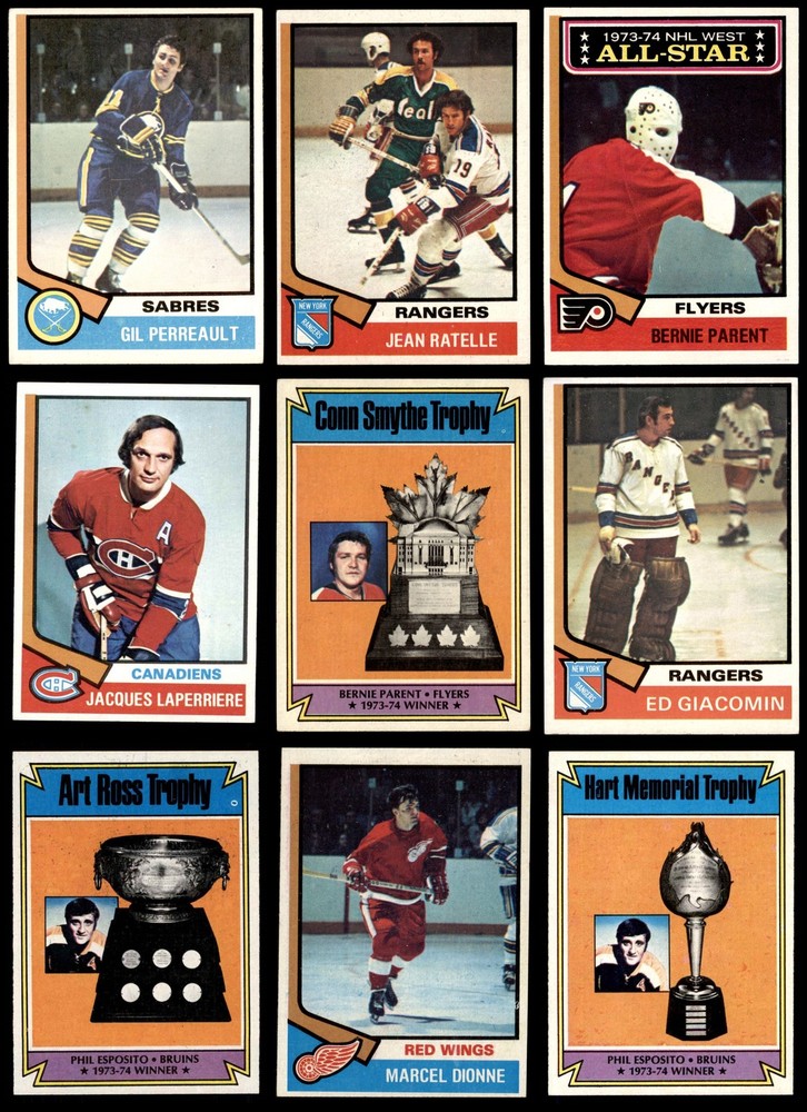 This set contains the following cards 1974 Topps #1 - Phil Esposito / Bill Goldsworthy Goals Leaders 5 - EX Front Back 1974 Topps #2 - Bobby Orr / Dennis Hextall Assists Leaders 4 - VG/EX Front Back 1974 Topps #3 - Phil Esposito / Bobby Clarke Scoring Leaders 5 - EX Front Back 1974 Topps #4 - Doug Favell / Bernie Parent Goals Against Leaders 5 - EX Front Back 1974 Topps #5 - Bryan Watson / Dave Schultz Penalty Minute Leaders 7 - NM Front Back 1974 Topps #6 - Mickey Redmond / Rick MacLeish Power Play Goal Leaders 6 - EX/MT Front Back 1974 Topps #7 Gary Bromley 5 - EX Front Back 1974 Topps #8 Bill Barber 5 - EX Front Back 1974 Topps #9 Emile Francis 5 - EX Front Back 1974 Topps #10 Gilles Gilbert 5 - EX Front Back 1974 Topps #11 John Davidson 6 - EX/MT Front Back 1974 Topps #12 Ron Ellis 5 - EX Front Back 1974 Topps #13 Syl Apps 5 - EX Front Back 1974 Topps #14 - Jacques Richard / Tom Lysiak / Keith McCreary Flames Leaders 5 - EX Front Back 1974 Topps #15 Dan Bouchard 6 - EX/MT Front Back 1974 Topps #16 Ivan Boldirev 5 - EX Front Back 1974 Topps #17 Gary Coalter 4 - VG/EX Front Back 1974 Topps #18 Bob Berry 5 - EX Front Back 1974 Topps #19 Red Berenson 6 - EX/MT Front Back 1974 Topps #20 Stan Mikita 5 - EX Front Back 1974 Topps #21 Fred Shero 6 - EX/MT Front Back 1974 Topps #22 Gary Smith 5 - EX Front Back 1974 Topps #23 Bill Mikkelson 5 - EX Front Back 1974 Topps #24 Jacques Lemaire 3 - VG Front Back 1974 Topps #25 Gilbert Perreault 5 - EX Front Back 1974 Topps #26 Cesare Maniago 5 - EX Front Back 1974 Topps #27 Bobby Schmautz 5 - EX Front Back 1974 Topps #28 - Phil Esposito / Bobby Orr / Johnny Bucyk Bruins Leaders 6 - EX/MT Front Back 1974 Topps #29 Steve Vickers 5 - EX Front Back 1974 Topps #30 Lowell MacDonald 6 - EX/MT Front Back 1974 Topps #31 Fred Stanfield 6 - EX/MT Front Back 1974 Topps #32 Ed Westfall 6 - EX/MT Front Back 1974 Topps #33 Curt Bennett 5 - EX Front Back 1974 Topps #34 Bep Guidolin 5 - EX Front Back 1974 Topps #35 Cliff Koroll 5 - EX Front Back 1974 Topps #36 Gary Croteau 4 - VG/EX Front Back 1974 Topps #37 Mike Corrigan 5 - EX Front Back 1974 Topps #38 Henry Boucha 4 - VG/EX Front Back 1974 Topps #39 Ron Low 5 - EX Front Back 1974 Topps #40 Darryl Sittler 6 - EX/MT Front Back 1974 Topps #41 Tracy Pratt 5 - EX Front Back 1974 Topps #42 - Richard Martin / Rene Robert Sabres Leaders 5 - EX Front Back 1974 Topps #43 Larry Carriere 6 - EX/MT Front Back 1974 Topps #44 Gary Dornhoefer 3 - VG Front Back 1974 Topps #45 Denis Herron 6 - EX/MT Front Back 1974 Topps #46 Doug Favell 6 - EX/MT Front Back 1974 Topps #47 Dave Gardner 5 - EX Front Back 1974 Topps #48 Morris Mott 5 - EX Front Back 1974 Topps #49 Marc Boileau 6 - EX/MT Front Back 1974 Topps #50 Brad Park 5 - EX Front Back 1974 Topps #51 Bob Leiter 5 - EX Front Back 1974 Topps #52 Tom Reid 5.5 - EX+ Front Back 1974 Topps #53 Serge Savard 6 - EX/MT Front Back 1974 Topps #54 Checklist PSA 7 - NM Front Back 1974 Topps #55 Terry Harper 5.5 - EX+ Front Back 1974 Topps #56 - Joey Johnston / Walt McKechnie Seals Leaders 5 - EX Front Back 1974 Topps #57 Guy Charron 6 - EX/MT Front Back 1974 Topps #58 Pit Martin 5 - EX Front Back 1974 Topps #59 Chris Evans 5 - EX Front Back 1974 Topps #60 Bernie Parent 5.5 - EX+ Front Back 1974 Topps #61 Jim Lorentz 5 - EX Front Back 1974 Topps #62 Dave Kryshow 5 - EX Front Back 1974 Topps #63 Lou Angotti 5 - EX Front Back 1974 Topps #64 Bill Flett 5 - EX Front Back 1974 Topps #65 Vic Hadfield 5 - EX Front Back 1974 Topps #66 Wayne Merrick 4 - VG/EX Front Back 1974 Topps #67 Andre Dupont 4 - VG/EX Front Back 1974 Topps #68 Tom Lysiak 5 - EX Front Back 1974 Topps #69 - Jim Pappin / Stan Mikita / J.P. Bordeleau Blackhawks Leaders 5 - EX Front Back 1974 Topps #70 Guy Lapointe 5 - EX Front Back 1974 Topps #71 Gerry O'Flaherly 5 - EX Front Back 1974 Topps #72 Marcel Dionne 6 - EX/MT Front Back 1974 Topps #73 Butch Deadmarsh 5 - EX Front Back 1974 Topps #74 Butch Goring 5 - EX Front Back 1974 Topps #75 Keith Magnuson 5 - EX Front Back 1974 Topps #76 Red Kelly 5 - EX Front Back 1974 Topps #77 Pete Stemkowski 6 - EX/MT Front Back 1974 Topps #78 Jim Roberts 5 - EX Front Back 1974 Topps #79 Don Luce 5 - EX Front Back 1974 Topps #80 Don Awrey 7 - NM Front Back 1974 Topps #81 Rick Kehoe 5 - EX Front Back 1974 Topps #82 Billy Smith 6 - EX/MT Front Back 1974 Topps #83 Jean Parise 4 - VG/EX Front Back 1974 Topps #84 - Mickey Redmond / Marcel Dionne / Bill Hogaboam Red Wings Leaders 5 - EX Front Back 1974 Topps #85 Ed Van Impe 6 - EX/MT Front Back 1974 Topps #86 Randy Manery 5 - EX Front Back 1974 Topps #87 Barclay Plager 5 - EX Front Back 1974 Topps #88 Inge Hammarstrom 6 - EX/MT Front Back 1974 Topps #89 Ab DeMarco 5 - EX Front Back 1974 Topps #90 Bill White 6.5 - EX/MT+ Front Back 1974 Topps #91 Al Arbour 4 - VG/EX Front Back 1974 Topps #92 Bob Stewart 5 - EX Front Back 1974 Topps #93 Jack Egers 6 - EX/MT Front Back 1974 Topps #94 Don Lever 5 - EX Front Back 1974 Topps #95 Reggie Leach 5.5 - EX+ Front Back 1974 Topps #96 Dennis O'Brien 5 - EX Front Back 1974 Topps #97 Peter Mahovlich 5 - EX Front Back 1974 Topps #98 - Butch Goring / Frank St. Marseille / Don Kozak Kings Leaders 5 - EX Front Back 1974 Topps #99 Gerry Meehan 5 - EX Front Back 1974 Topps #100 Bobby Orr 5 - EX Front Back 1974 Topps #101 Jean Potvin 5 - EX Front Back 1974 Topps #102 Rod Seiling 6 - EX/MT Front Back 1974 Topps #103 Keith McCreary 5 - EX Front Back 1974 Topps #104 Phil Maloney 6 - EX/MT Front Back 1974 Topps #105 Denis Dupere 5 - EX Front Back 1974 Topps #106 Steve Durbano 5 - EX Front Back 1974 Topps #107 Bob Plager 5 - EX Front Back 1974 Topps #108 Chris Oddleifson 5 - EX Front Back 1974 Topps #109 Jim Neilson 5 - EX Front Back 1974 Topps #110 Jean Pronovost 5 - EX Front Back 1974 Topps #111 Don Kozak 5 - EX Front Back 1974 Topps #112 - Bill Goldsworthy / Dennis Hextall / Danny Grant North Stars Leaders 5 - EX Front Back 1974 Topps #113 Jim Pappin 6 - EX/MT Front Back 1974 Topps #114 Richard Lemieux 5 - EX Front Back 1974 Topps