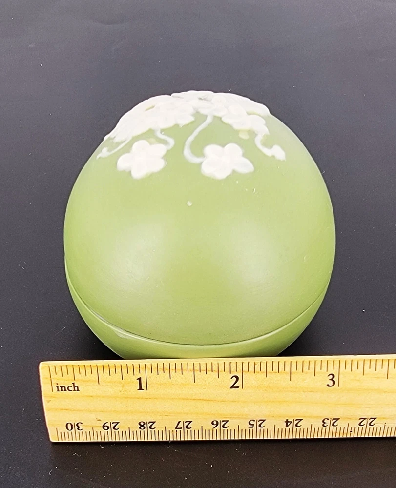 BRAND: 1975 Bell Porcelain Handmade Two Piece Egg/Easter with Raised White Violet Bouquet. Satin Finish, excellent condition! COLORWAY: White, Sage Green. SIZE: Approximately 5" Long, 3" Wide and 3" Tall. CONDITION: Beautiful Sage Green satin finished ceramic egg by Chatham Pottery 1975. It is just lovely with raised white violet bouquet, very romantic. There are no signs of chips, cracks, or damage on this charming trinket dish. It would also make a perfect Easter gift filled with surprises. The finish is very smooth and satiny to the touch. Please see my photos for exact detail. Thank you so much for visiting my store today and please come again!