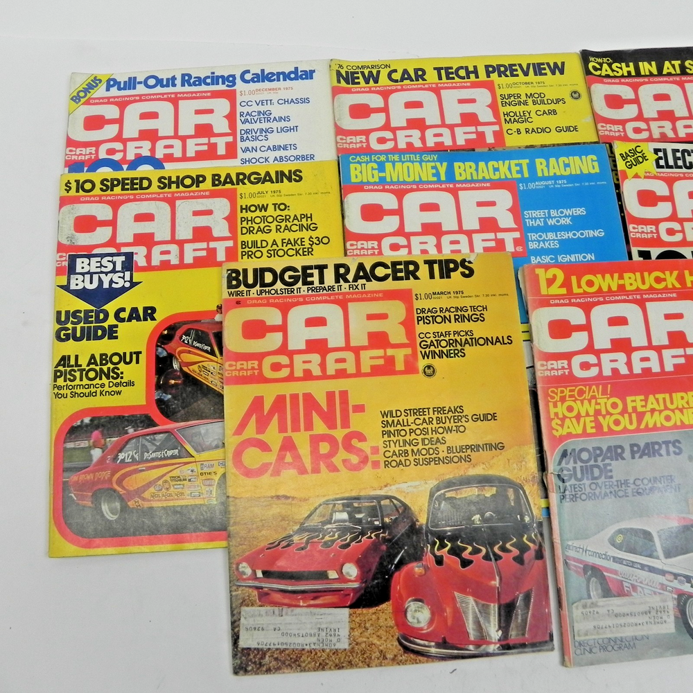 This lot of 8 Car Craft magazine issues from 1975 is a valuable collection for fans of hot rods, drag racing, and automotive performance. Featuring a mix of informative articles, expert advice, and captivating imagery, these magazines provide a comprehensive look at the car enthusiast culture of the era. With a focus on showcasing the latest trends and techniques in modifying and enhancing vehicles, this set is perfect for collectors and enthusiasts looking to expand their knowledge and appreciation for classic cars.