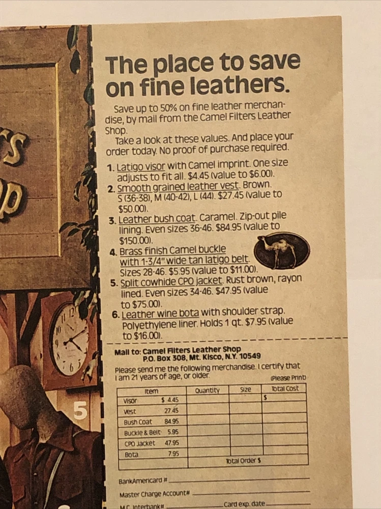 1975 Camel Filters Cigarettes PRINT AD Leather Shop Mail Order Promo VTG 1970s