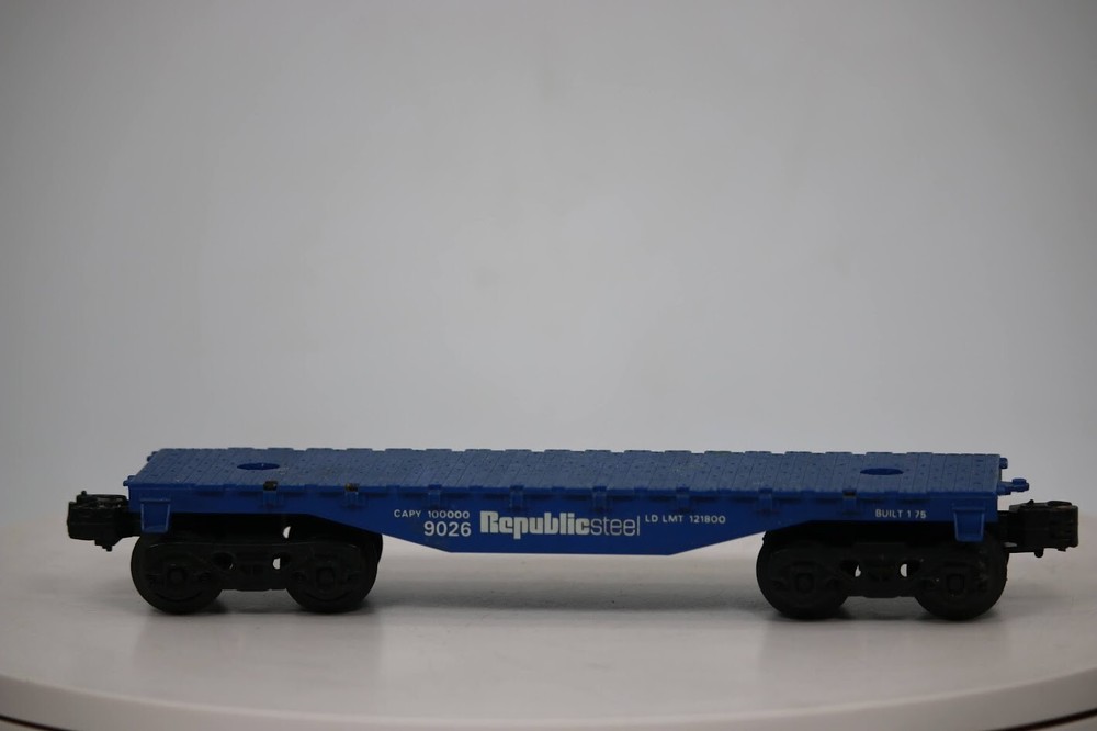 Vintage 1975 LIONEL Republic Steel 9026 Blue Flat Car SKU#008286 Look closely at the pictures to see further details. PLEASE see photos for detailed condition!! PLEASE LOOK AT THE PHOTOS CAREFULLY BEFORE PURCHASING!! If you are purchasing more than one item from us and would like combined shipping, PLEASE request an adjusted invoice from us while still in the cart and BEFORE paying. eBay does not usually calculate combined shipping accurately and you might get overcharged. Please be aware that when we photograph items, we use lighting that will show the details well. Although we try to present the product as accurately as possible, the lighting may affect the overall look of the item by appearing lighter/darker or possibly a different hue than the actual item. Depending on the type of lighting you have in your home, there may be some differences between the photos and the actual item. If this is a concern of yours, please feel free to request additional photos made in natural lighting or ask for a more detailed description of the item PRIOR TO PURCHASE! There may be pieces that are missing or broken including, but not limited to, couplers, brake wheels, steps, ladders, railings, etc. May need detailed cleaning. PLEASE NOTE: We greatly appreciate your interest in our item for sale. We look forward to a pleasant, quick and satisfying transaction for everybody, so please note the following information before bidding. Thank you! ITEM DESCRIPTIONS: * We will try to describe items well and provide plenty of photos. Please review these carefully before bidding or purchasing. * Only the items pictured and described are what you will receive when purchased. * We will occasionally offer an item clearly marked "AS-IS". This means that we are not sure if it works because we are unable to test it for whatever reason. We will offer these at a discounted price then a similar "working" item. It is possible that these items will work fine, but it also is possible that these items are more useful for their parts. Please only bid on or purchase these items if you are well aware of this, as we will only provide refunds of actual item price (no shipping cost refunds) for these items. * If you have any questions that aren't addressed by the descriptions or photos, please feel free to ask before you bid. SHIPPING: * We offer international shipping, please feel free to contact us if you have any questions. * We try to pack items as carefully as possible, but damage may occur during shipping. If you receive an item that was damaged in shipping, please contact us and we will work with you to resolve the problem. * We will combine shipping costs for all items the same buyer purchases from us within 2 days. Please wait to pay for items until you're done shopping with us. Please contact us if you're expecting to buy more items from us, or to have us adjust the shipping costs. * We will usually ship items out within 24 hours of payment being received Sunday through Friday at noon. We will notify the buyer if there will be a delay in shipping for some reason. Please allow additional time for holidays and weekends when the post office is closed. If payment is received after noon (EST) on Friday, the item might not be shipped until the following Monday Or Later If Monday Is Holiday. * We do try to recycle shipping materials as much as possible. RETURNS: We abide by eBay's Money Back Guarantee. We definitely want our customers to be happy with their purchase! You may return an item within 30 days of receiving it with the following guidelines: * If the item is defective or damaged (unless we clearly marked the listing "AS-IS"), the buyer will receive a full refund after the buyer returns it and it is received by us. Customers who falsely claim their item is defective, damaged, or not as described in order to receive a full refund and free return shipping will be permanently blocked from making future purchases from us. * If the item is as described (including "AS-IS" items) and the buyer decides for any other reason than defective/damaged to return it, only the actual price of the item will be refunded once it has been returned and it is received by us. The buyer will be asked to pay all original and return shipping charges. This includes all reasons other than defective/damaged, including wrong size, wrong type, changed mind, etc. All "AS-IS" items will fall into this category of return. Please make sure the item is what you want before purchasing it. * Please contact us before initiating a refund request, issues, questions or concerns. We will do our best to get back to you as quickly as we can. Thank you and if you read this far... you are awesome and we hope you have a great day!! FEEDBACK: We always leave feedback at the end of transaction. We consider the transaction to be over when we receive feedback from the buyer confirming the item arrived satisfactorily. If you are unsatisfied with your purchase please contact us before leaving neutral or negative feedback. WE APPRECIATE POSITIVE FEEDBACK IF YOU ARE SATISFIED WITH YOUR PURCHASE! THANK YOU FOR YOUR INTEREST IN THIS ITEM!