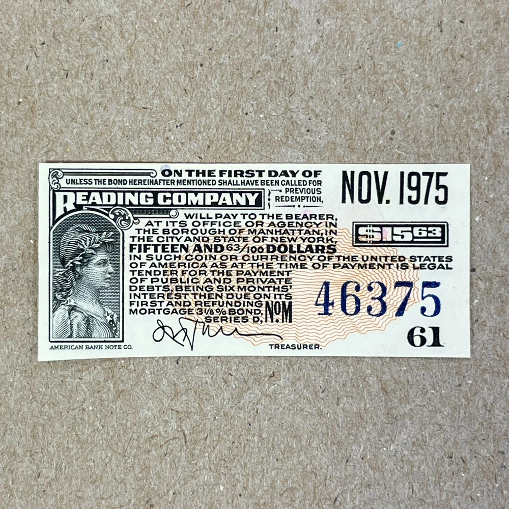 Vintage $15.63 bond coupon from Reading (railroad) Company. This particular coupon was redeemable on November 1975. Measures about 2 1/8" x 15/16". It features a printed signature and the serial number 46375. Coupon number is 61. This bond certificate is a great addition to any collection of obsolete currency, paper money or railroad memorabilia from Pennsylvania. It's ungraded and uncertified, in its raw and original condition. We strongly encourage you to thoroughly read the condition details above and to view all of the photos before purchasing, as these photos describe the item most accurately. If you have any questions or concerns, please do not hesitate to contact us and we will get back to you as soon as we can. All orders are packaged properly and promptly shipped from Las Vegas, NV, USA. Thank you for your interest; please take the time to view all of the items within our Curioddities eBay store, as we have a wide variety of items including antiques, books and magazines, collectibles, music, toys, and many other vintage rarities and obscurities. We will combine shipping costs, just ask!