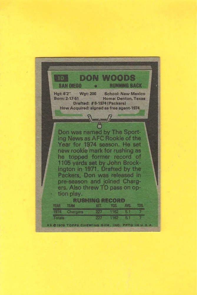 Manufacturer:ToppsSeason:1975Vintage:YesSport:FootballTeam:Atlanta Falcons, Buffalo Bills, Chicago Bears, Green Bay Packers, Kansas City Chiefs, New York Giants, New York Jets, Oakland Raiders, Philadelphia EaglesYear Manufactured:1975Player/Athlete:Chester Marcol, Don Woods, Emmitt Thomas, George Blanda, Lydell Mitchell, Otis Armstrong, Ralph Baker, Sonny Jurgensen, Tom BlanchardOriginal/Licensed Reprint:OriginalLeague:National Football League (NFL)Card Size:StandardCountry/Region of Manufacture:United StatesCard Number:10Set:1975 ToppsType:Sports Trading Card