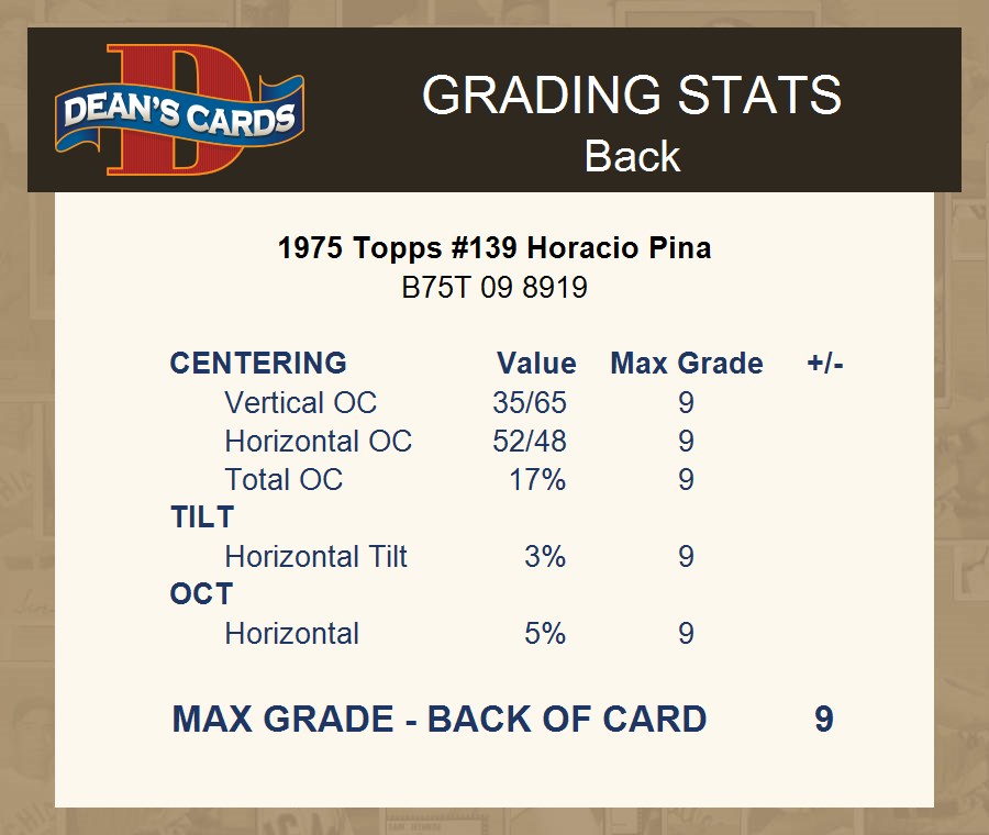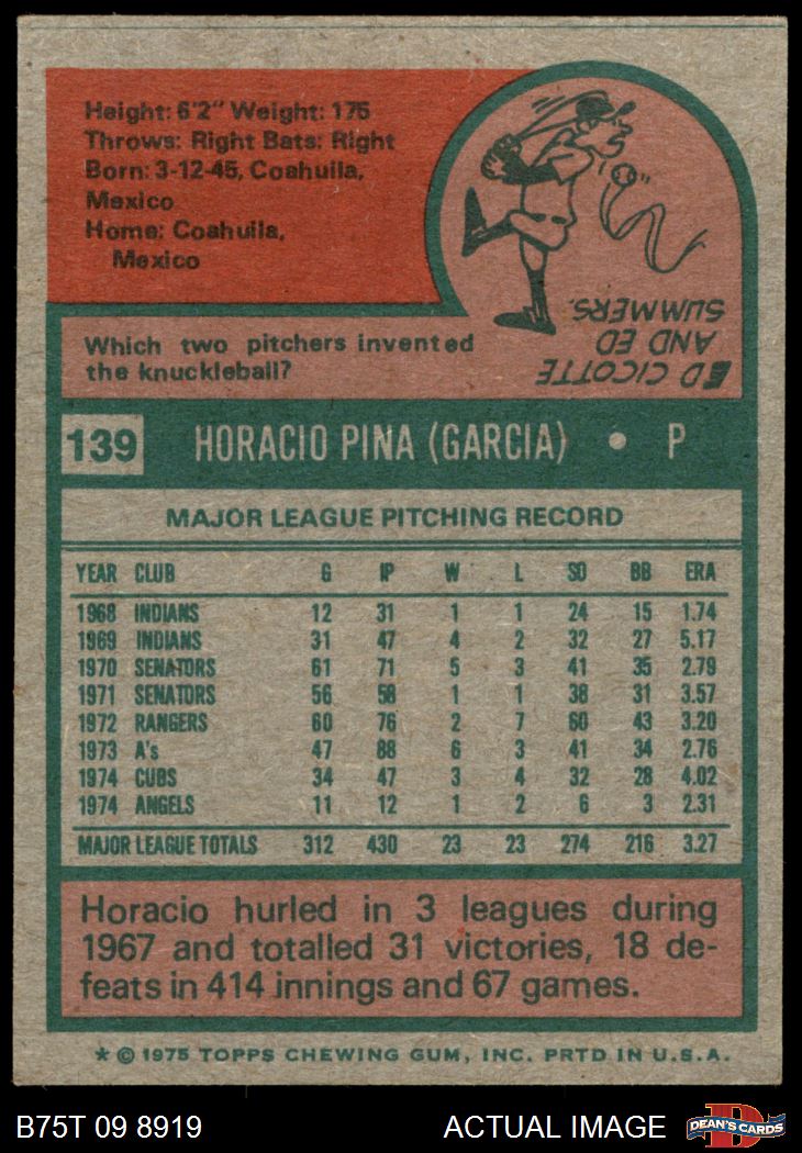 1975 Topps #139 Horacio Pina Angels 6 - EX/MT If the scan in the listing says ACTUAL IMAGE, you will receive the card pictured. For cards issued after 1983, we will often use representative images and you will not receive the exact card pictured. Shipping Policy You only pay shipping on the first item. If you order multiple items on the same order, you will only be charged once for shipping. We do not combine shipping on multiple orders. To avoid multiple shipping charges we recommend using eBay's "Add to Cart" feature to check out multiple items in one transaction, or please request and allow for us to send an invoice to reflect the combined shipping charges. Canadian customers - We send all of our Canadian/International packages with tracking and cannot make any exceptions to this policy. Negotiating Prices All prices are final and we do not negotiate. This policy is to ensure that everyone knows that they are getting our best possible price. So please do not ask us to negotiate on price. Return Policy Dean's Cards has a 100% Money Back Satisfaction Guarantee on all purchases, as long as the product is returned within 30 days of receiving the product. Card Grading Each card is first reviewed by a member of our team, in order to detect any flaws that may not be visible on a scan, such as wrinkles, creases, print spots, or light stains. The vast majority of our vintage cards are professionally graded by the Dean's Cards Grading Software and include a 100% satisfaction guarantee. Our grading is on par with PSA standards when it comes to corners, centering and flaws - and tends to grade a bit tougher than PSA, on cards with a tilted image or rough edges. This grading software was developed to provide far better grading and consistency than can be achieved using the human eye. Determining the card's grade The sharpness of the corners and the degree to which a card was cut off-center determines the maximum possible grade that the card can receive. The card's grade is further reduced by any flaws or blemishes that it may have. Each card is evaluated on the following characteristics and assigned a score. Corners - Each corner of a card is individually analyzed, and then assigned a score on how square, sharp, and flawless it appears. Centering - The borders are measured, at multiple points along the edge, to determine the horizontal and vertical centering and tilt. Defects - The card is examined for imperfections, such as: size, print flaws, dings, stains, creases, or other wear which could lower its grade. Bonus for Perfect Centering - A vintage card, with near perfect centering, is given a one-half grade bonus. So when you buy one of our cards with a half-grade (e.g. 3.5 or 6.5) it will appear perfectly centered, both vertically and horizontally. Grading Criteria Worst Corner - A card can grade only as high as the worst corner will allow. Average Corner Tilt - The difference in width of a card border near the top, compared to the bottom. OCT - The sum of how far a card is Off-Center, plus its Tilt. Minimum Centering Requirements Eye Appeal - The combination of a card's centering, corners and tilt. Well-Centered - Cards that appear perfectly centered receive a bonus of one-half grade. Flaws, defects and other imperfections - can lower a card's grade. Card Backs - the above criteria is also considered, for the back of the cards, but does not inflict as severe of a penalty to its grade. Packaging Once scanned, the cards are placed in "soft" sleeves, which have an open top for easy removal. The Dean's Cards label is placed on the top back of the card sleeve. Every card you buy features a QR Code that you can scan to see your ACTUAL CARD and its grading statistics. Please note that when images are enlarged there may be instances of vertical lines running through the scans. This was caused by a "dust speck" on the scanner and can be verified by the vertical lines running into the black margins on the top and bottom of the image. About Dean and Dean's Cards Dean's Cards Makes Card Collecting - Fast, Easy And Fun. Dean's Cards was founded in 2002 and has become the leading online seller of vintage sports cards and non-sports cards. Our inventory has grown to more than a million vintage cards and we have a staff of 15-20 employees and a 8500 sq. ft. office space in Cincinnati, Ohio.