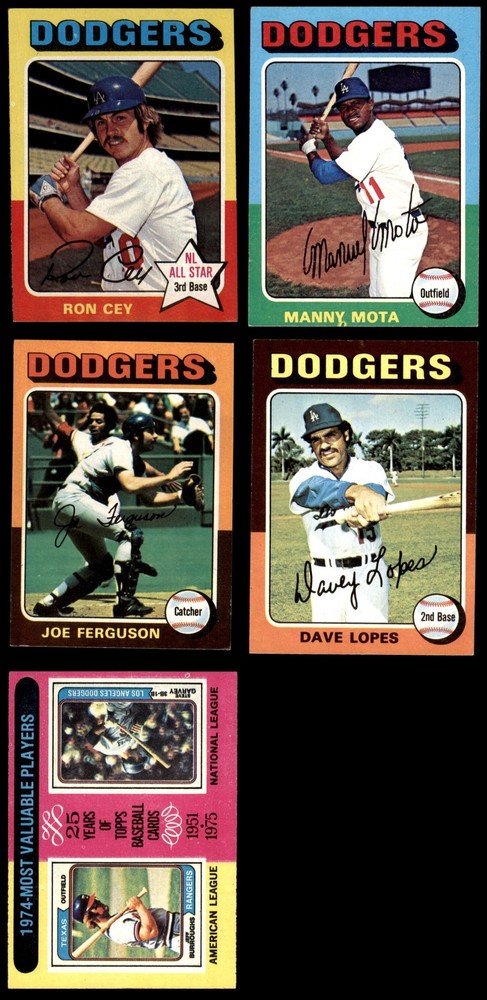 This set contains the following cards 1975 Topps #6 - Mike Marshall Marshall Hurls In 106 Games 3 - VG Front Back 1975 Topps #23 Bill Russell 6 - EX/MT Front Back 1975 Topps #93 Davey Lopes 7 - NM Front Back 1975 Topps #115 Joe Ferguson 7 - NM Front Back 1975 Topps #163 Jim Brewer 6 - EX/MT Front Back 1975 Topps #186 Willie Crawford 5 - EX Front Back 1975 Topps #212 - Jeff Burroughs / Steve Garvey 1974 MVPs 5 - EX Front Back 1975 Topps #220 Don Sutton 3 - VG Front Back 1975 Topps #269 Doug Rau 3 - VG Front Back 1975 Topps #294 Geoff Zahn 6 - EX/MT Front Back 1975 Topps #313 - Mike Marshall / Terry Forster Leading Firemen 4 - VG/EX Front Back 1975 Topps #330 Mike Marshall 6 - EX/MT Front Back 1975 Topps #361 - Walter Alston Dodgers Team Checklist 6 - EX/MT Front Back 1975 Topps #376 Steve Yeager 7 - NM Front Back 1975 Topps #390 Ron Cey 5 - EX Front Back 1975 Topps #414 Manny Mota 6.5 - EX/MT+ Front Back 1975 Topps #440 Andy Messersmith 3 - VG Front Back 1975 Topps #460 - Steve Garvey / Frank Taveras 1974 NL Championships 5 - EX Front Back 1975 Topps #473 Ken McMullen 5 - EX Front Back 1975 Topps #498 Al Downing 4.5 - VG/EX+ Front Back 1975 Topps #523 Tom Paciorek 3 - VG Front Back 1975 Topps #547 Von Joshua 3 - VG Front Back 1975 Topps #570 Jim Wynn 5 - EX Front Back 1975 Topps #588 Rick Auerbach 6 - EX/MT Front Back 1975 Topps #631 Lee Lacy 5 - EX Front Back This is a 1975 Topps Los Angeles Dodgers Near Team Set. Included are the 1974 World Series cards. Set breakdown by grade: Number of Cards in Set 25 Average Grade - Weighted by Value 5.47 - EX+ Average Grade - Unweighted 5.00 - EX Grade Breakdown 7 - NM 3 6.5 - EX/MT+ 1 6 - EX/MT 6 5 - EX 7 4.5 - VG/EX+ 1 4 - VG/EX 1 3 - VG 6 . This near team set contains 25 cards out of the possible 44 cards. This is not a complete set. "The following cards are omitted, in order to keep the cost of the set reasonable: "#189 1951 MVPs - Yogi Berra / Roy Campanella, #191 1953 MVPs - Roy Campanella / Al Rosen, #193 1955 MVPs - Yogi Berra / Roy Campanella, #194 1956 MVPs - Mickey Mantle / Don Newcombe, #200 1962 MVPs - Mickey Mantle / Maury Wills, #201 1963 MVPs - Sandy Koufax / Elston Howard, #310 Pitching Leaders - Catfish Hunter / Ferguson Fergie Jenkins / Andy Messersmith / Phil Niekro, #461 1974 World Series - Game #1 - Reggie Jackson, #462 1974 World Series - Game #2 - Walter Alston / Joe Ferguson, #463 1974 World Series - Game #3 - Rollie Fingers, #464 1974 World Series - Game #4 - Ken Holtzman / Steve Yeager, #465 1974 World Series - Game #5 - Joe Rudi / Ron Cey, #466 1974 World Series - Summary - A's Do it Again - Rollie Fingers / Reggie Jackson / Dick Williams, #618 Rookie Pitchers - Scott McGregor / Rick Rhoden / Jamie Easterly / Tom Johnson and #624 Rookie Pitchers - Gary Lavelle / Doug Konieczny / Jim Otten / Eddie Solomon This set does not include the following cards: #47 Tommy John, #71 Charlie Hough, #140 Steve Garvey, #244 Bill Buckner Dean's Cards offers a 100% Money Back Satisfaction Guarantee on all purchases. Just contact us within 10 days of the purchase date and we will refund your money or, when possible, replace the cards. 1975 Topps Los Angeles Dodgers Near Team Set 5.5 - EX+ 6902023 (25 / 44 cards) If the scan in the listing says ACTUAL IMAGE, you will receive the card pictured. For cards issued after 1983, we will often use representative images and you will not receive the exact card pictured. Shipping Policy You only pay shipping on the first item. If you order multiple items on the same order, you will only be charged once for shipping. We do not combine shipping on multiple orders. To avoid multiple shipping charges we recommend using eBay's "Add to Cart" feature to check out multiple items in one transaction, or please request and allow for us to send an invoice to reflect the combined shipping charges. Canadian customers - We send all of our Canadian/International packages with tracking and cannot make any exceptions to this policy. Negotiating Prices All prices are final and we do not negotiate. This policy is to ensure that everyone knows that they are getting our best possible price. So please do not ask us to negotiate on price. Return Policy Dean's Cards has a 100% Money Back Satisfaction Guarantee on all purchases, as long as the product is returned within 30 days of receiving the product. Card Grading Each card is first reviewed by a member of our team, in order to detect any flaws that may not be visible on a scan, such as wrinkles, creases, print spots, or light stains. The vast majority of our vintage cards are professionally graded by the Dean's Cards Grading Software and include a 100% satisfaction guarantee. Our grading is on par with PSA standards when it comes to corners, centering and flaws - and tends to grade a bit tougher than PSA, on cards with a tilted image or rough edges. This grading software was developed to provide far better grading and consistency than can be achieved using the human eye. Determining the card's grade The sharpness of the corners and the degree to which a card was cut off-center determines the maximum possible grade that the card can receive. The card's grade is further reduced by any flaws or blemishes that it may have. Each card is evaluated on the following characteristics and assigned a score. Corners - Each corner of a card is individually analyzed, and then assigned a score on how square, sharp, and flawless it appears. Centering - The borders are measured, at multiple points along the edge, to determine the horizontal and vertical centering and tilt. Defects - The card is examined for imperfections, such as: size, print flaws, dings, stains, creases, or other wear which could lower its grade. Bonus for Perfect Centering - A vintage card, with near perfect centering, is given a one-half grade bonus. So when you buy one of our cards with a half-grade (e.g. 3.5 or 6.5) it will appear perfectly centered, both vertically and horizontally. Grading Criteria Worst Corner - A ca