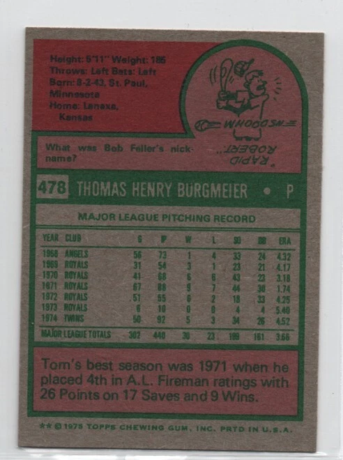 1975 Topps Mini SetBreak #478 Tom Burgmeier NM-MT OR BETTER