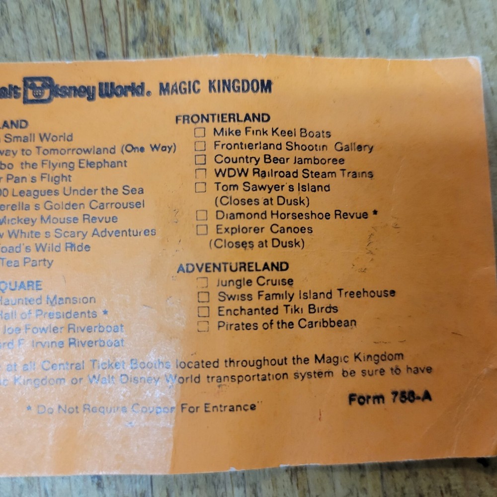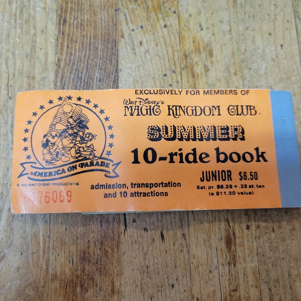 Here is a wonderful 1975 Disney World Junior ticket book for your Disney collection! It is a 10 Adventure ticket book with 5 tickets - 1 E, 1 D, 1 C, 1 B and 1 A ticket. The D, C and A tickets with the same serial number are attached to the ticket book. The E and B tickets with a different serial number are loose in the ticket book. The loose, added E ticket is an Adult ticket from the same era while the loose, added B ticket is a Junior ticket from the same era. The ticket book is in good condition with creases, folds, wrinkling, indentations, surface wear, edge wear, edge tears, scratches, scuffing, stains and some marks. It has lots of curving to the ticket book and does not lay flat. There is a line mark on the D ticket. Item is sold “as is”. I try to describe my items as accurately as possible. Please email me with any questions before bidding. NO INTERNATIONAL BIDDERS PLEASE Winning bidder to pay by PayPal within 3 days after the end of the auction. Buyer must have a confirmed PayPal shipping address. Shipment will take place after receipt of cleared payment. I will package your item carefully for shipment. THANK YOU FOR LOOKING! PLEASE LOOK FOR MY OTHER DISNEYLAND AUCTIONS! I AM ALWAYS HAPPY TO COMBINE ITEMS FOR SHIPMENT TO SAVE YOU MONEY