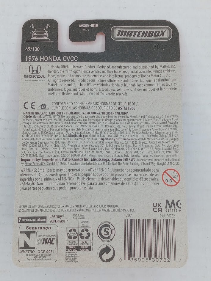 1976 Honda CVCC #49 * WHITE * 2021 Matchbox Case U * ZB11 SKU#101174 Look closely at the pictures to see further details. We ships USPS PLEASE see photos for detailed condition!! AC PLEASE LOOK AT THE PHOTOS CAREFULLY BEFORE PURCHASING!! If you are purchasing more than one item from us and would like combined shipping, PLEASE request an adjusted invoice from us while still in the cart and BEFORE paying. eBay does not usually calculate combined shipping accurately and you might get overcharged. Please be aware that when we photograph items, we use lighting that will show the details well. Although we try to present the product as accurately as possible, the lighting may affect the overall look of the item by appearing lighter/darker or possibly a different hue than the actual item. Depending on the type of lighting you have in your home, there may be some differences between the photos and the actual item. If this is a concern of yours, please feel free to request additional photos made in natural lighting or ask for a more detailed description of the item PRIOR TO PURCHASE! PLEASE NOTE: We greatly appreciate your interest in our item for sale. We look forward to a pleasant, quick and satisfying transaction for everybody, so please note the following information before bidding. Thank you! ITEM DESCRIPTIONS: * We will try to describe items well and provide plenty of photos. Please review these carefully before bidding or purchasing. * Only the items pictured and described are what you will receive when purchased. * We will occasionally offer an item clearly marked "AS-IS". This means that we are not sure if it works because we are unable to test it for whatever reason. We will offer these at a discounted price then a similar "working" item. It is possible that these items will work fine, but it also is possible that these items are more useful for their parts. Please only bid on or purchase these items if you are well aware of this, as we will only provide refunds of actual item price (no shipping cost refunds) for these items. * If you have any questions that aren't addressed by the descriptions or photos, please feel free to ask before you bid. * There may be bends, dents or parts of the blister that have minor issues due to long term storage. Such things will be pointed out under the description, please look closely at the pictures for further details. SHIPPING: * We usually do not offer shipping to international addresses, but ARE WILLING TO TAKE CONSIDERATIONS. * We try to pack items as carefully as possible, but damage may occur during shipping. If you receive an item that was damaged in shipping, please contact us and we will work with you to resolve the problem. * We will combine shipping costs for all items the same buyer purchases from us within 2 days. Please wait to pay for items until you're done shopping with us. Please contact us if you're expecting to buy more items from us, or to have us adjust the shipping costs. * We will usually ship items out within 24 hours of payment being received Sunday through Friday at noon. We will notify the buyer if there will be a delay in shipping for some reason. Please allow additional time for holidays and weekends when the post office is closed. If payment is received after noon (EST) on Friday, the item might not be shipped until the following Monday. * We do try to recycle shipping materials as much as possible. RETURNS: We abide by eBay's Money Back Guarantee. We definitely want our customers to be happy with their purchase! You may return an item within 30 days of receiving it with the following guidelines: * If the item is defective or damaged (unless we clearly marked the listing "AS-IS"), the buyer will receive a full refund after the buyer returns it and it is received by us. Customers who falsely claim their item is defective, damaged, or not as described in order to receive a full refund and free return shipping will be permanently blocked from making future purchases from us. * If the item is as described (including "AS-IS" items) and the buyer decides for any other reason than defective/damaged to return it, only the actual price of the item will be refunded once it has been returned and it is received by us. The buyer will be asked to pay all original and return shipping charges. This includes all reasons other than defective/damaged, including wrong size, wrong type, changed mind, etc. All "AS-IS" items will fall into this category of return. Please make sure the item is what you want before purchasing it. * Please contact us before initiating a refund request. FEEDBACK: We always leave feedback at the end of transaction. We consider the transaction to be over when we receive feedback from the buyer confirming the item arrived satisfactorily. If you are unsatisfied with your purchase please contact us before leaving neutral or negative feedback. WE APPRECIATE POSITIVE FEEDBACK IF YOU ARE SATISFIED WITH YOUR PURCHASE! THANK YOU FOR YOUR INTEREST IN THIS ITEM! !
