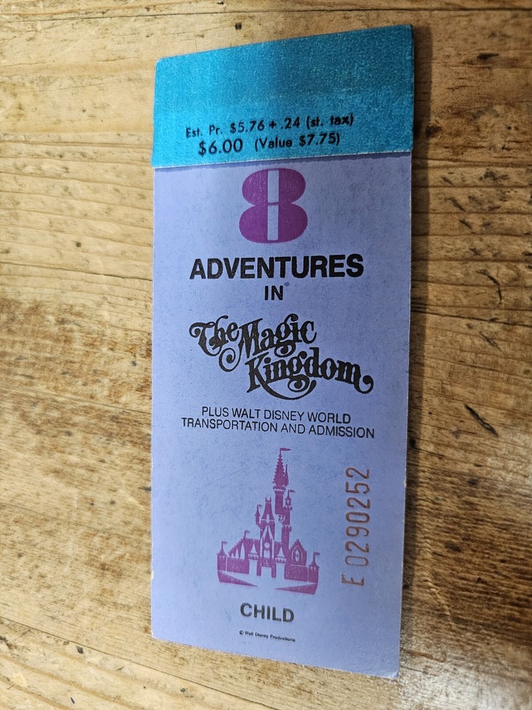 Here is a wonderful 1976 Walt Disney World Child ticket book for your early Disney collection! It is the smaller sized ticket book with tickets printed on that wonderful Globe paper. It is an 8 Adventure ticket book with 5 tickets . This book contains the following tickets: Blue Welcome ticket Yellow Walt Disney Story ticket E ticket – 1 D ticket - 1 C ticket - 1 B ticket - 1 A ticket - 1 The E, D, C and A tickets with the same serial number are attached to the ticket book. The B ticket with a different serial number is loose in the ticket book. The loose, added B ticket is an Child ticket from the same era. This ticket book is in good condition with bright colors. It has creases, edge wear, stains and marks. Item is sold “as is”. I try to describe my items as accurately as possible. Please email me with any questions before bidding. NO INTERNATIONAL BIDDERS PLEASE Winning bidder to pay by PayPal within 3 days after the end of the auction. Buyer must have a confirmed PayPal shipping address. Shipment will take place after receipt of cleared payment. I will package your item carefully for shipment.s THANK YOU FOR LOOKING! PLEASE LOOK FOR MY OTHER DISNEYLAND AUCTIONS! I AM ALWAYS HAPPY TO COMBINE ITEMS FOR SHIPMENT TO SAVE YOU MONEY!