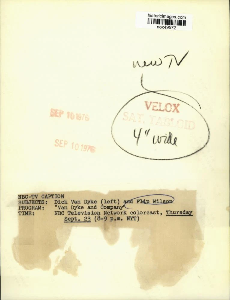 ebay template Note: Please study the images carefully to determine the condition of this vintage photograph, as it may not be in perfect condition. It may contain wrinkles, cracks, and possibly even tears due to its age and how it was handled before it got to us. A scanner may interpret colors and contrast differently than human eyes will, so it is possible that the actual photograph may be slightly darker or lighter in person. This vintage photograph is offered for sale as a collectible item and conveys no transfer of copyright. 1976 Press Photo Comedian Flip Wilson Appears With Dick Van Dyke On Comedy Show This is an original press photo. Dick Van Dyke (left) and Flip Wilson. Program: "Van Dyke and Company" NBC Television Network colorcast, Thursday, Sept. 23, 8-9 pm. Photo measures 7 x 9.25 inches. Photo is dated 09-10-1976. PHOTO FRONT PHOTO BACK Historic Images Part Number: nox49572 Sell Smarter with Kyozou. Inventory and Ecommerce Management
