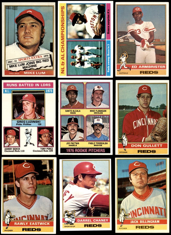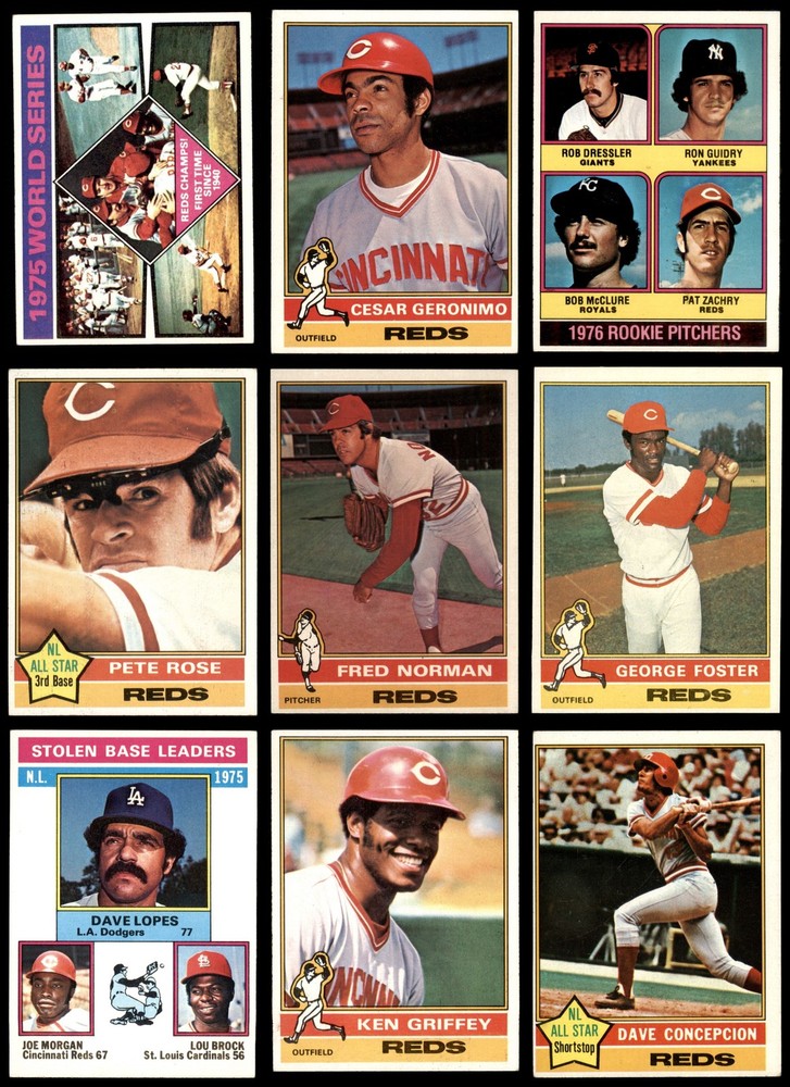 This set contains the following cards 1976 Topps #24 Cesar Geronimo 5 - EX Front Back 1976 Topps #48 Dave Concepcion 3 - VG Front Back 1976 Topps #66 - Gus Bell / Buddy Bell Father & Son 5 - EX Front Back 1976 Topps #77 Pedro Borbon 3 - VG Front Back 1976 Topps #104 - Sparky Anderson Reds Team Checklist 5 - EX Front Back 1976 Topps #128 Ken Griffey 5 - EX Front Back 1976 Topps #155 Jack Billingham 6 - EX/MT Front Back 1976 Topps #179 George Foster 5 - EX Front Back 1976 Topps #195 - Johnny Bench / Tony Perez / Greg Luzinski NL RBI Leaders 6 - EX/MT Front Back 1976 Topps #197 - Joe Morgan / Lou Brock / Dave Lopes NL SB Leaders 6 - EX/MT Front Back 1976 Topps Traded #208 T Mike Lum 5 - EX Front Back 1976 Topps #211 Clay Carroll 5 - EX Front Back 1976 Topps #240 Pete Rose 6 - EX/MT Front Back 1976 Topps #259 Darrel Chaney 5 - EX Front Back 1976 Topps #283 Merv Rettenmund 4 - VG/EX Front Back 1976 Topps #300 Johnny Bench 6 - EX/MT Front Back 1976 Topps #325 Tony Perez 5 - EX Front Back 1976 Topps Traded #338 T Bob Bailey 5 - EX Front Back 1976 Topps #362 Will McEnaney 5 - EX Front Back 1976 Topps #390 Don Gullett 4 - VG/EX Front Back 1976 Topps #420 Joe Morgan 6 - EX/MT Front Back 1976 Topps #444 Gary Nolan 5 - EX Front Back 1976 Topps #461 Luis Tiant NL & AL Championships 5 - EX Front Back 1976 Topps #462 1975 World Series - Reds Champs 4 - VG/EX Front Back 1976 Topps #469 Rawly Eastwick 5 - EX Front Back 1976 Topps #491 Terry Crowley 5 - EX Front Back 1976 Topps #514 Dan Driessen 5 - EX Front Back 1976 Topps #518 Doug Flynn 5 - EX Front Back 1976 Topps #538 Pat Darcy 5 - EX Front Back 1976 Topps #561 Tom Carroll 4 - VG/EX Front Back 1976 Topps #579 Clay Kirby 5 - EX Front Back 1976 Topps #589 - Santo Alcala / Mike Flanagan / Joe Pactwa / Pablo Torrealba Rookie Pitchers 5 - EX Front Back 1976 Topps #599 - Ron Guidry / Rob Dressler / Bob McClure / Pat Zachry Rookie Pitchers 5 - EX Front Back 1976 Topps #609 Fred Norman 5 - EX Front Back 1976 Topps #627 Bill Plummer 6 - EX/MT Front Back 1976 Topps #652 Ed Armbrister 5 - EX Front Back This 1976 Topps Cincinnati Reds Team Set Team Set contains Reds baseball cards and makes a great gift for any fan. ?With an inventory of over 15,000 team sets, Dean's Cards has Team Sets & Near Team Sets for just about every team, in multiple conditions, for all sports, for most major sets issued between 1909 and 1979. There is also a 1976 Team Set available from SSPC. Set breakdown by grade: Number of Cards in Set 36 Average Grade - Weighted by Value 5.49 - EX+ Average Grade - Unweighted 4.97 - EX Grade Breakdown 6 - EX/MT 7 5 - EX 23 4 - VG/EX 4 3 - VG 2 Dean's Cards offers a 100% Money Back Satisfaction Guarantee on all purchases. Just contact us within 10 days of the purchase date and we will refund your money or, when possible, replace the cards. 1976 Topps Cincinnati Reds Team Set 1976 World Series Champs! - 1975 World Series Champs! 5.5 - EX+ 6908786 If the scan in the listing says ACTUAL IMAGE, you will receive the card pictured. For cards issued after 1983, we will often use representative images and you will not receive the exact card pictured. Shipping Policy You only pay shipping on the first item. If you order multiple items on the same order, you will only be charged once for shipping. We do not combine shipping on multiple orders. To avoid multiple shipping charges we recommend using eBay's "Add to Cart" feature to check out multiple items in one transaction, or please request and allow for us to send an invoice to reflect the combined shipping charges. Canadian customers - We send all of our Canadian/International packages with tracking and cannot make any exceptions to this policy. Negotiating Prices All prices are final and we do not negotiate. This policy is to ensure that everyone knows that they are getting our best possible price. So please do not ask us to negotiate on price. Return Policy Dean's Cards has a 100% Money Back Satisfaction Guarantee on all purchases, as long as the product is returned within 30 days of receiving the product. Card Grading Each card is first reviewed by a member of our team, in order to detect any flaws that may not be visible on a scan, such as wrinkles, creases, print spots, or light stains. The vast majority of our vintage cards are professionally graded by the Dean's Cards Grading Software and include a 100% satisfaction guarantee. Our grading is on par with PSA standards when it comes to corners, centering and flaws - and tends to grade a bit tougher than PSA, on cards with a tilted image or rough edges. This grading software was developed to provide far better grading and consistency than can be achieved using the human eye. Determining the card's grade The sharpness of the corners and the degree to which a card was cut off-center determines the maximum possible grade that the card can receive. The card's grade is further reduced by any flaws or blemishes that it may have. Each card is evaluated on the following characteristics and assigned a score. Corners - Each corner of a card is individually analyzed, and then assigned a score on how square, sharp, and flawless it appears. Centering - The borders are measured, at multiple points along the edge, to determine the horizontal and vertical centering and tilt. Defects - The card is examined for imperfections, such as: size, print flaws, dings, stains, creases, or other wear which could lower its grade. Bonus for Perfect Centering - A vintage card, with near perfect centering, is given a one-half grade bonus. So when you buy one of our cards with a half-grade (e.g. 3.5 or 6.5) it will appear perfectly centered, both vertically and horizontally. Grading Criteria Worst Corner - A card can grade only as high as the worst corner will allow. Average Corner Tilt - The difference in width of a card border near the top, compared to the bottom. OCT - The sum of how far a card is Off-Center, plus its Tilt. Minimum Centering Requirements Eye Appeal - The combination of