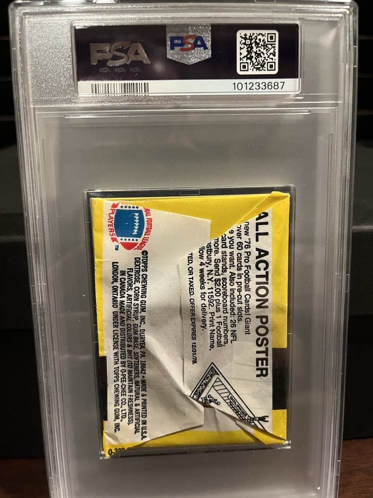 This unopened wax pack contains a 1976 Topps football sports trading card. The pack features an iconic player from the NFL, WALTER PAYTON, who played during the 1976 season and even made an appearance at the SUPERBOWL. The card size is standard and manufactured by Topps. The pack is in PSA EX-MT 8 grade, making it a great addition to any football card collection. Get your hands on this rare find and relive the exciting moments of the past NFL seasons!