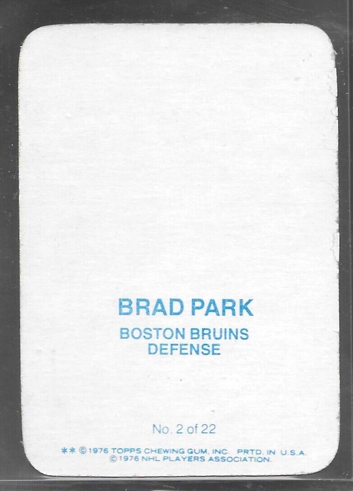 1976-77 Topps - Glossy Inserts #2 Brad Park Centering is good, color, and gloss, corners are excellent. Edges on back of card show some light wear or chipping in isolated areas. I do my best to evaluate each card carefully but please examine high resolution photo as price of card is determined by that pic. All cards are shipped in a brand new Ultra-Pro Premium top loader with an Ultra-Pro premium plastic sleeve to protect your card for years. Please read our reviews. Customers are pleased with their card purchases from NMMT Vintage. We are different! Tired of getting horrible packaging of your cards by lazy dealers? Customers rave about our care in shipping and handling your treasure regardless of its value. eBay Standard envelope shipping will have a cardboard support as well as the Ultra-Pro Premium top loader. First class shipping will have two cardboard backers as well as the Ultra-Pro Premium top loader and will be mailed in a bubble envelope.