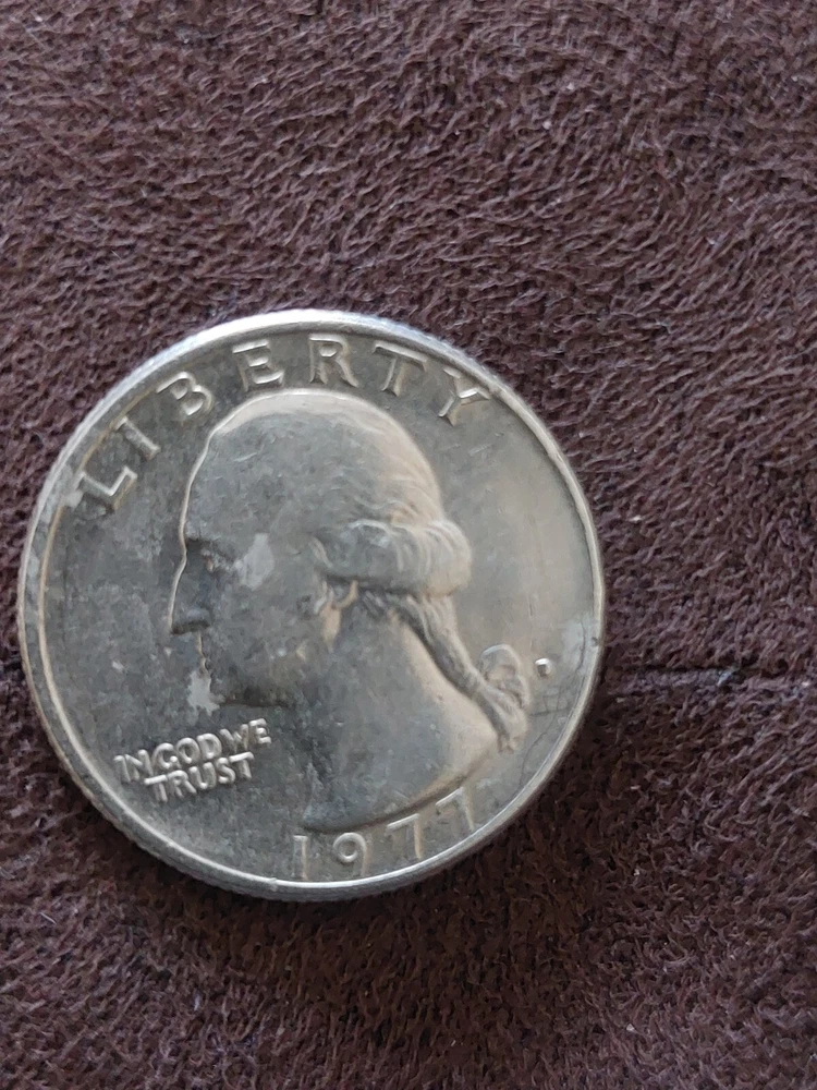 The 1977 D Washington quarter is a circulated coin from the United States, featuring the iconic profile of George Washington on the obverse side. This specific quarter was minted in Denver, as indicated by the "D" mint mark. The coin is composed of clad materials and has not been graded or certified by a grading agency. It holds numismatic value as a part of the Washington quarter series minted from 1932 to 1998. The distinguishing feature of this coin is a filled mint mark on the reverse side, which adds uniqueness to its appearance.
