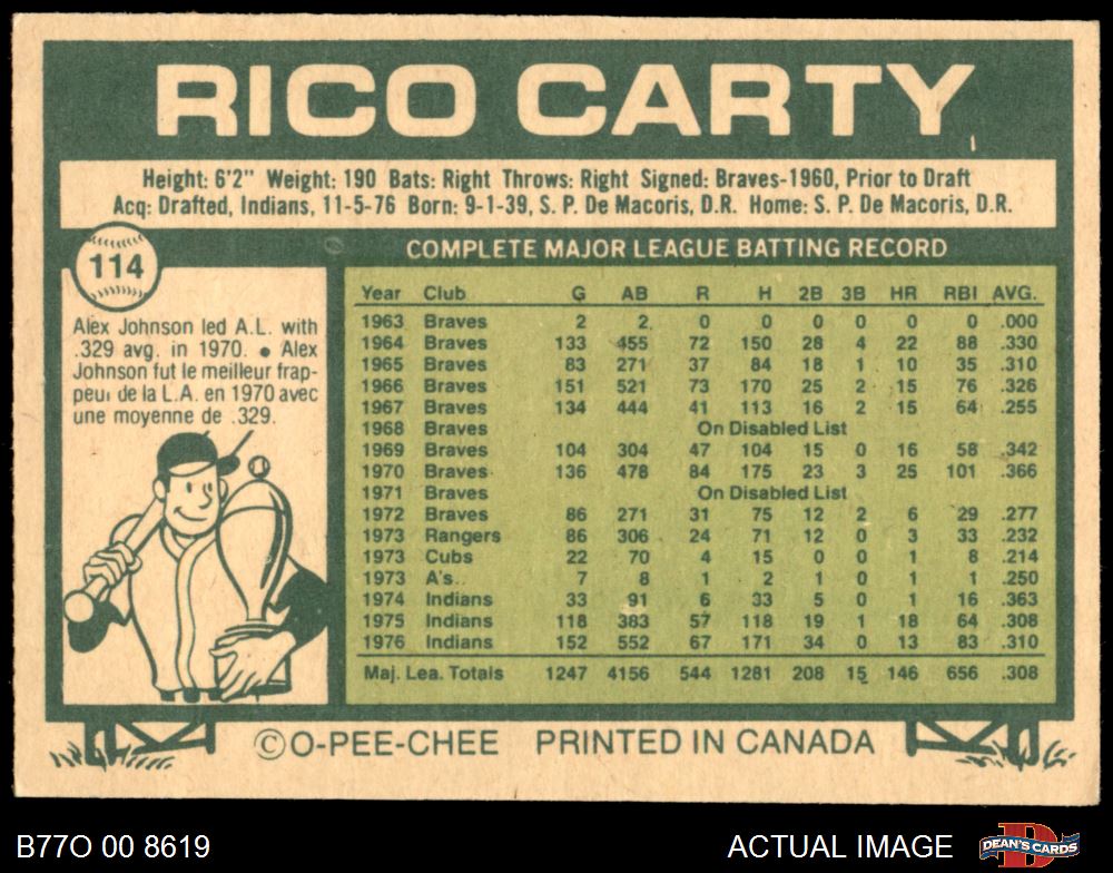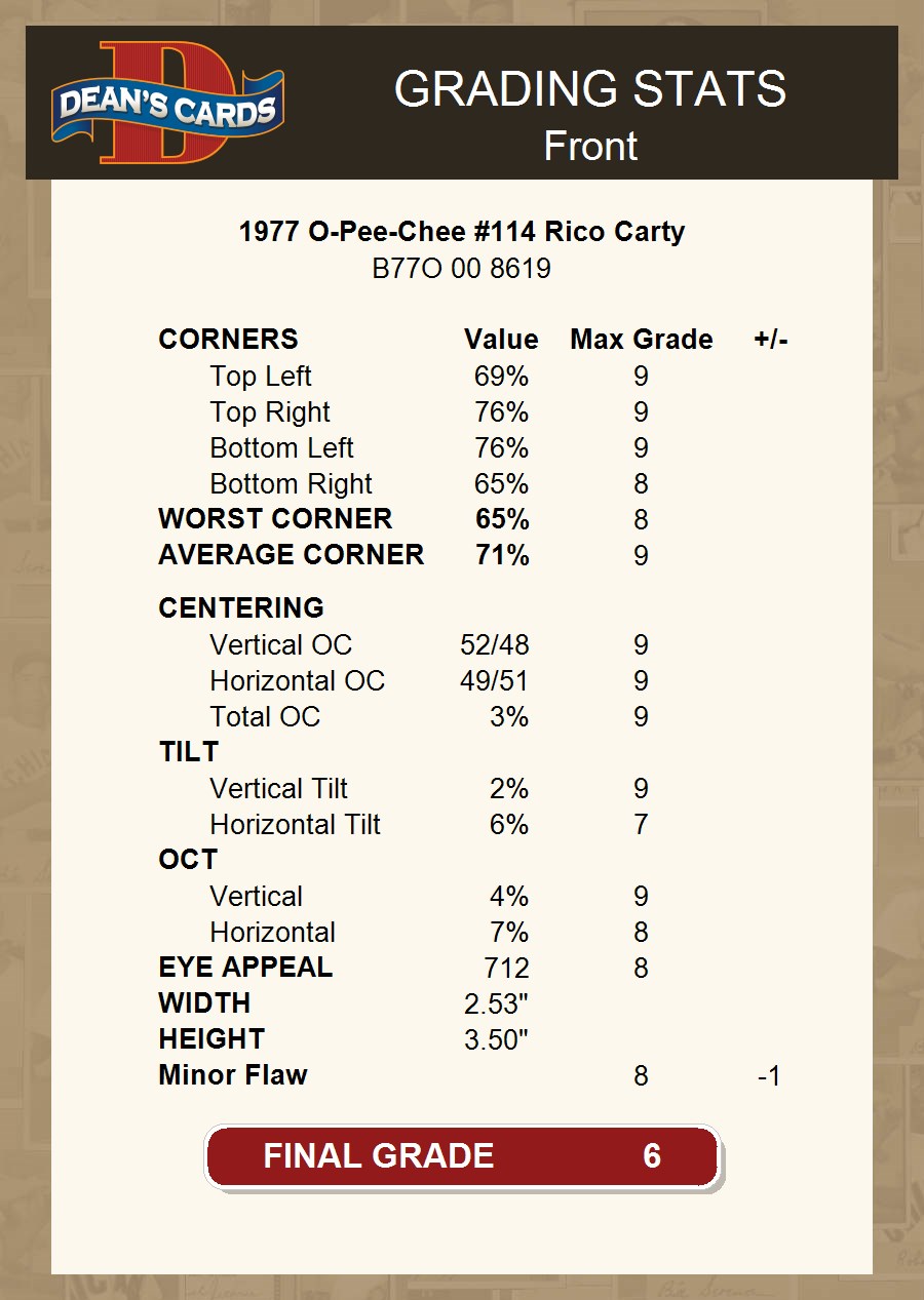 1977 O-Pee-Chee #114 Rico Carty Indians UNIQUE 6 - EX/MT If the scan in the listing says ACTUAL IMAGE, you will receive the card pictured. For cards issued after 1983, we will often use representative images and you will not receive the exact card pictured. Shipping Policy You only pay shipping on the first item. If you order multiple items on the same order, you will only be charged once for shipping. We do not combine shipping on multiple orders. To avoid multiple shipping charges we recommend using eBay's "Add to Cart" feature to check out multiple items in one transaction, or please request and allow for us to send an invoice to reflect the combined shipping charges. Canadian customers - We send all of our Canadian/International packages with tracking and cannot make any exceptions to this policy. Negotiating Prices All prices are final and we do not negotiate. This policy is to ensure that everyone knows that they are getting our best possible price. So please do not ask us to negotiate on price. Return Policy Dean's Cards has a 100% Money Back Satisfaction Guarantee on all purchases, as long as the product is returned within 30 days of receiving the product. Card Grading Each card is first reviewed by a member of our team, in order to detect any flaws that may not be visible on a scan, such as wrinkles, creases, print spots, or light stains. The vast majority of our vintage cards are professionally graded by the Dean's Cards Grading Software and include a 100% satisfaction guarantee. Our grading is on par with PSA standards when it comes to corners, centering and flaws - and tends to grade a bit tougher than PSA, on cards with a tilted image or rough edges. This grading software was developed to provide far better grading and consistency than can be achieved using the human eye. Determining the card's grade The sharpness of the corners and the degree to which a card was cut off-center determines the maximum possible grade that the card can receive. The card's grade is further reduced by any flaws or blemishes that it may have. Each card is evaluated on the following characteristics and assigned a score. Corners - Each corner of a card is individually analyzed, and then assigned a score on how square, sharp, and flawless it appears. Centering - The borders are measured, at multiple points along the edge, to determine the horizontal and vertical centering and tilt. Defects - The card is examined for imperfections, such as: size, print flaws, dings, stains, creases, or other wear which could lower its grade. Bonus for Perfect Centering - A vintage card, with near perfect centering, is given a one-half grade bonus. So when you buy one of our cards with a half-grade (e.g. 3.5 or 6.5) it will appear perfectly centered, both vertically and horizontally. Grading Criteria Worst Corner - A card can grade only as high as the worst corner will allow. Average Corner Tilt - The difference in width of a card border near the top, compared to the bottom. OCT - The sum of how far a card is Off-Center, plus its Tilt. Minimum Centering Requirements Eye Appeal - The combination of a card's centering, corners and tilt. Well-Centered - Cards that appear perfectly centered receive a bonus of one-half grade. Flaws, defects and other imperfections - can lower a card's grade. Card Backs - the above criteria is also considered, for the back of the cards, but does not inflict as severe of a penalty to its grade. Packaging Once scanned, the cards are placed in "soft" sleeves, which have an open top for easy removal. The Dean's Cards label is placed on the top back of the card sleeve. Every card you buy features a QR Code that you can scan to see your ACTUAL CARD and its grading statistics. Please note that when images are enlarged there may be instances of vertical lines running through the scans. This was caused by a "dust speck" on the scanner and can be verified by the vertical lines running into the black margins on the top and bottom of the image. About Dean and Dean's Cards Dean's Cards Makes Card Collecting - Fast, Easy And Fun. Dean's Cards was founded in 2002 and has become the leading online seller of vintage sports cards and non-sports cards. Our inventory has grown to more than a million vintage cards and we have a staff of 15-20 employees and a 8500 sq. ft. office space in Cincinnati, Ohio.