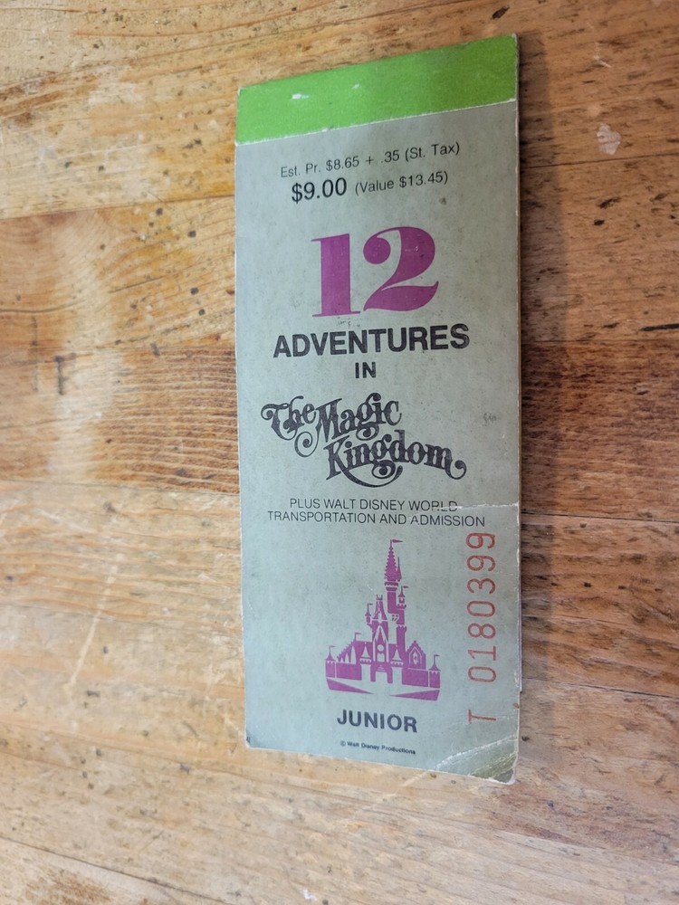 Here is a wonderful 1977 Disney World Junior ticket book for your Disney collection! It is a 12 Adventure ticket book with 5 tickets - 1 E, 1 D, 1 C, 1 B and 1 A ticket. The E, D, B and A tickets with the same serial number are attached to the ticket book. The C ticket with a different serial number is loose in the ticket book. The loose, added C ticket is an Adult ticket from the same era. The ticket book is in good condition with creases, folds, wrinkling, indentations, surface wear, edge wear, edge tears, scratches, scuffing, stains and some marks. Item is sold “as is”. I try to describe my items as accurately as possible. Please email me with any questions before bidding. NO INTERNATIONAL BIDDERS PLEASE Winning bidder to pay by PayPal within 3 days after the end of the auction. Buyer must have a confirmed PayPal shipping address. Shipment will take place after receipt of cleared payment. I will package your item carefully for shipment. THANK YOU FOR LOOKING! PLEASE LOOK FOR MY OTHER DISNEYLAND AUCTIONS! I AM ALWAYS HAPPY TO COMBINE ITEMS FOR SHIPMENT TO SAVE YOU MONEY