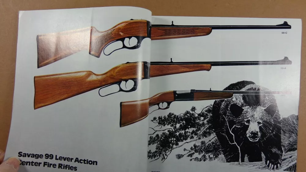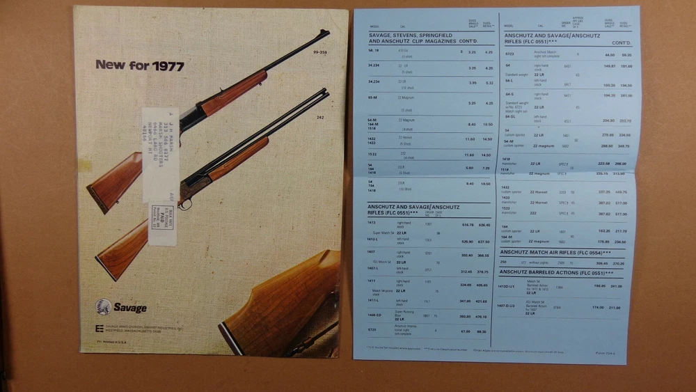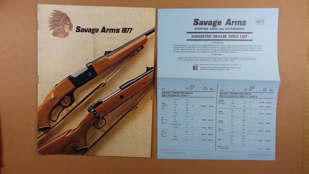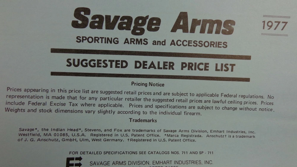 1977 SAVAGE FIREARMS GUN CATALOG - rifles, shotguns and access. DEALER PRICES 32 pages illustrated about 8.5 x 11 DEALER - RETAIL PRICE SHEET price list; 1 sheet price list ( the front page and the back page). see picture good condition - shows some wear aind use - sticker on BACK Cover - SMALL mailing tape on covers - indentation from mailing g61