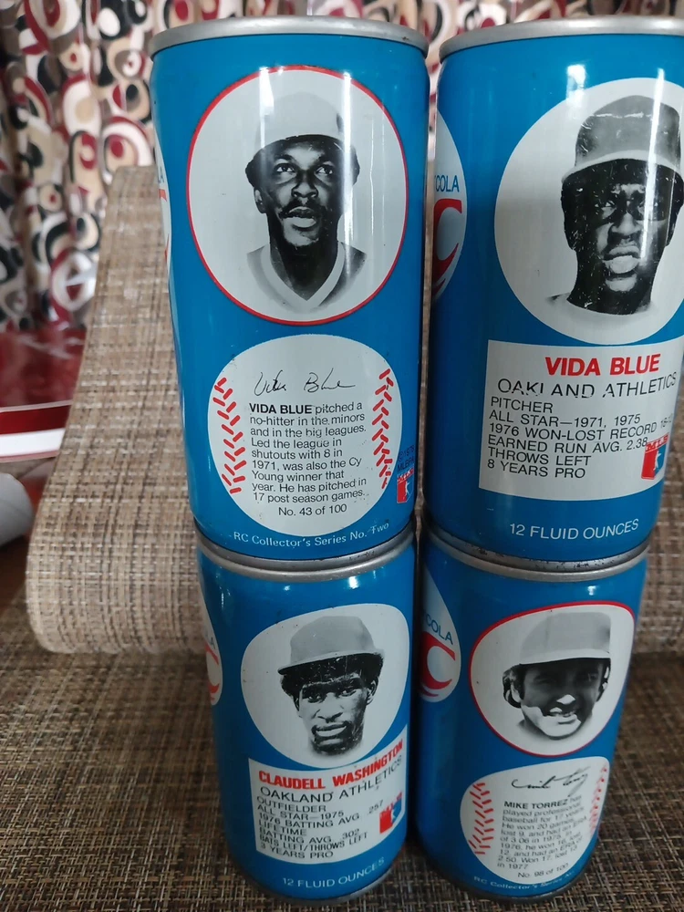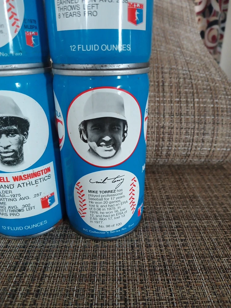 2 Vida Blue cans both have some surface rust in spots and few scratches. Claudell Washington can has surface rust on bottom of can and few scratches. Mike Torres can has a few spots of surface rust.nice can. These cans are not perfect. Been boxed up for years. Selling from my personal collection