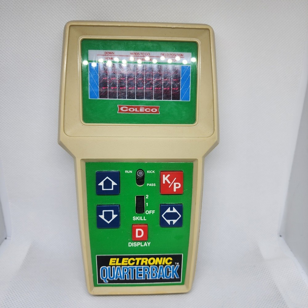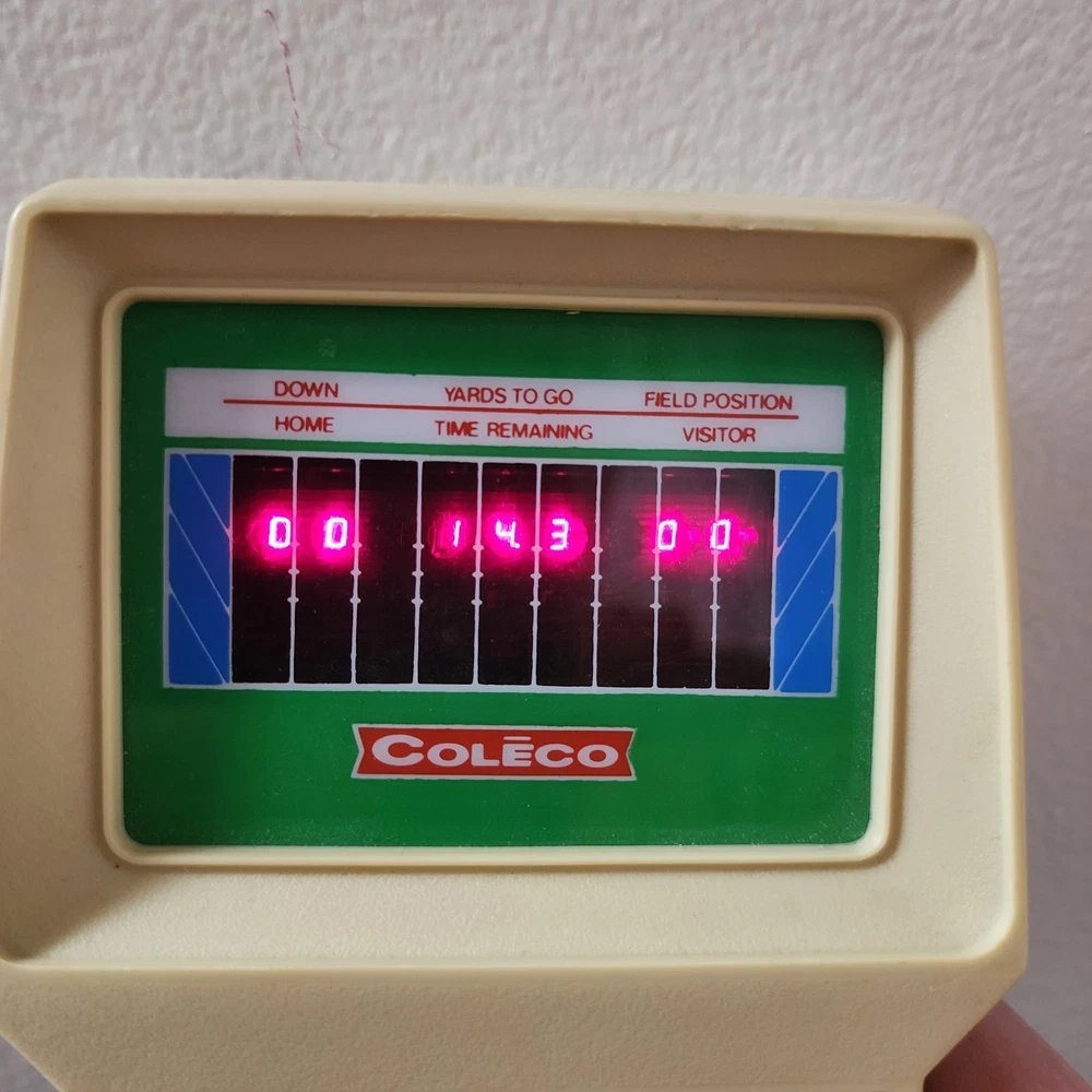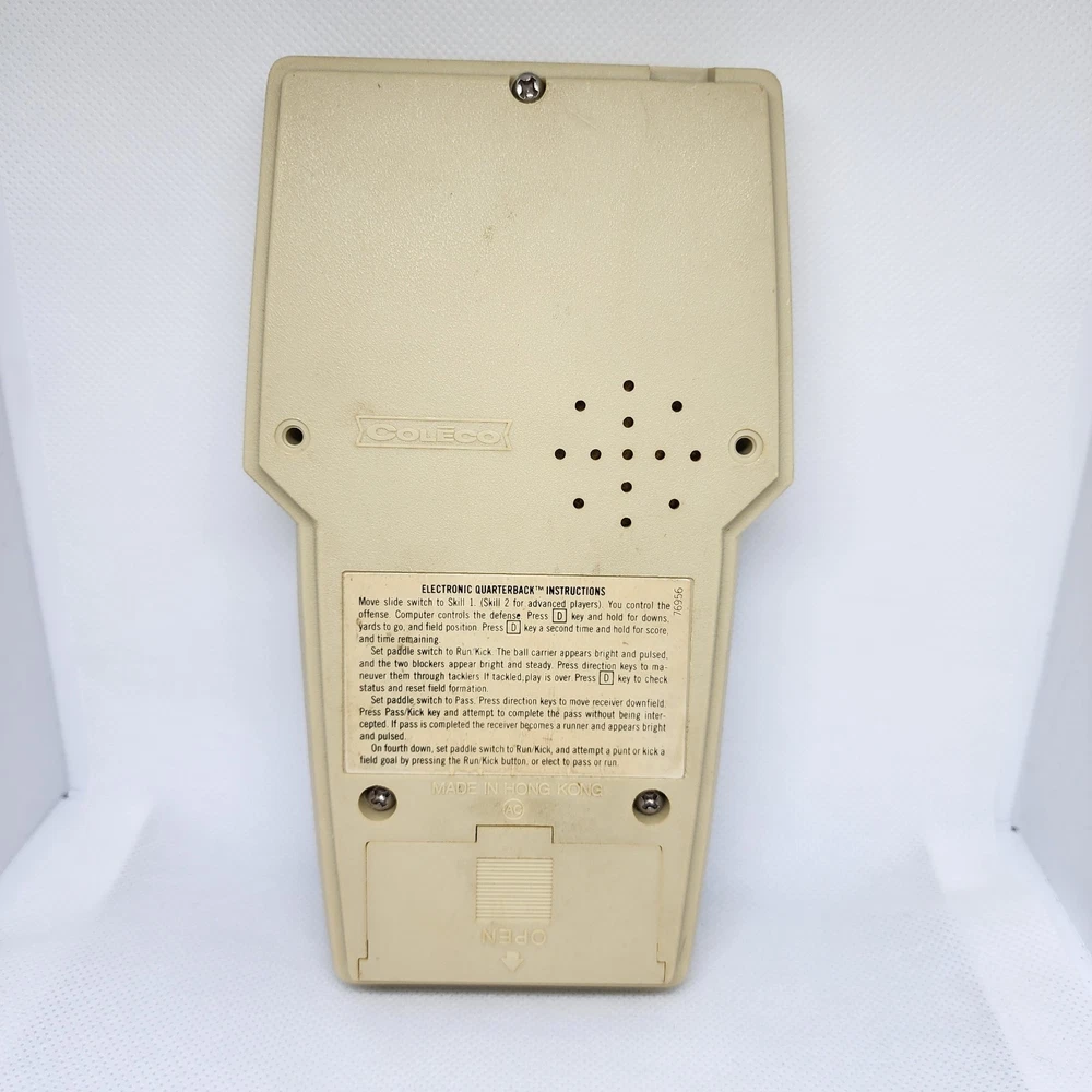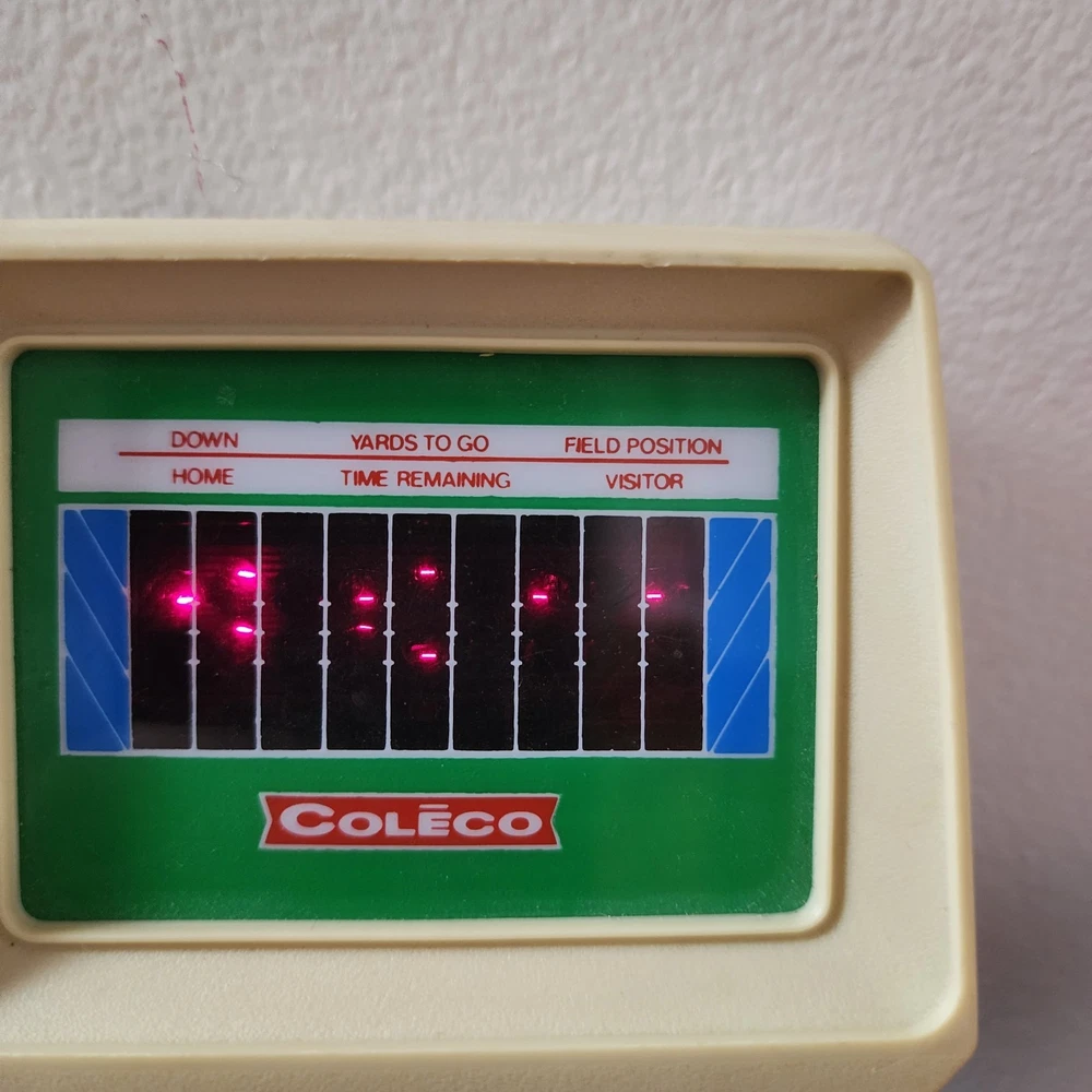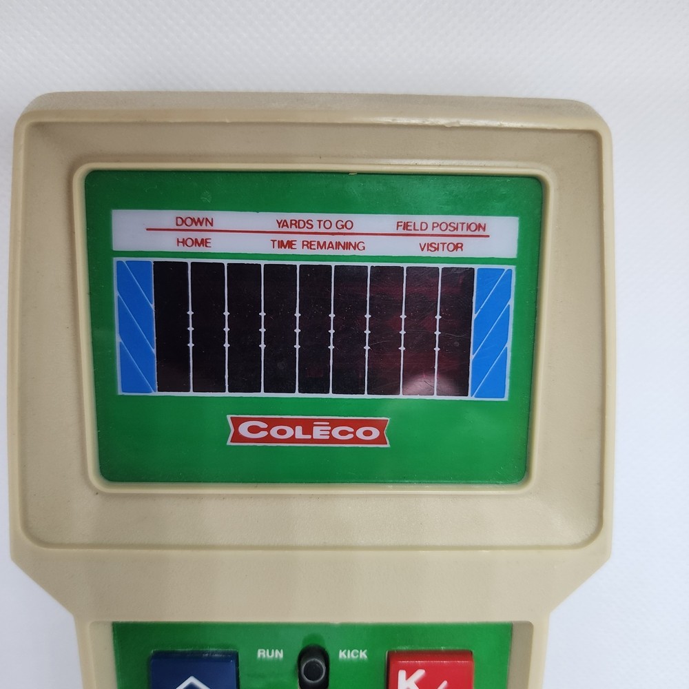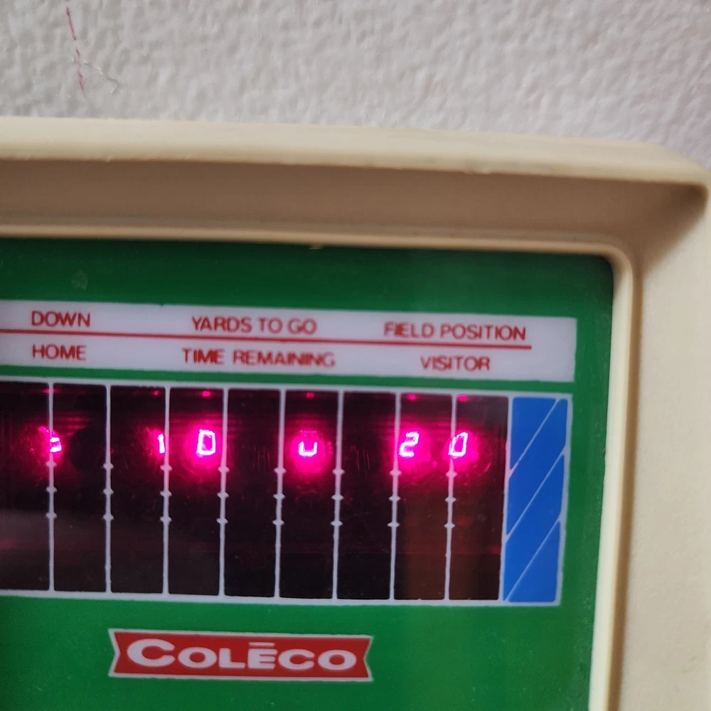 COLECO ELECTRONIC QUARTERBACK Tested working (see video) Hong Kong 1978 on the time remaining screen it sometimes won't fully show the 0 (see pictures) has a small amount of yellowing * the screen has a few small scratches but not very noticeable.