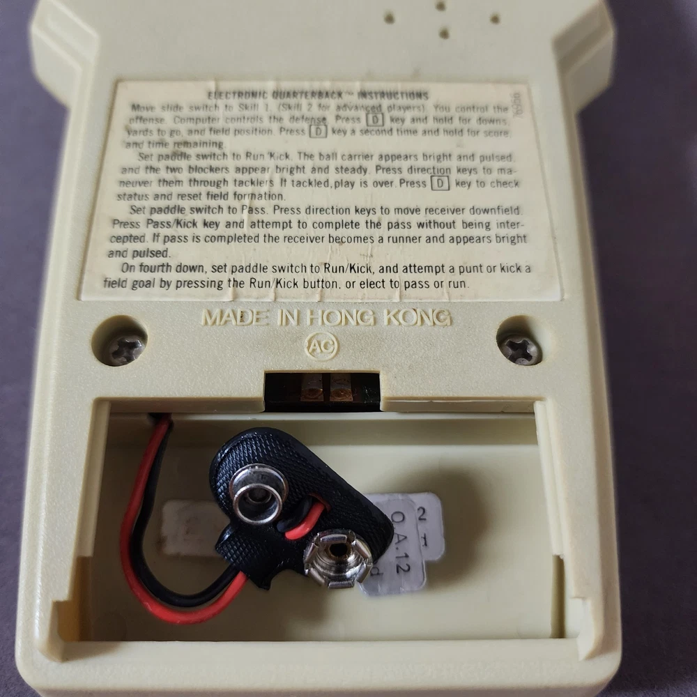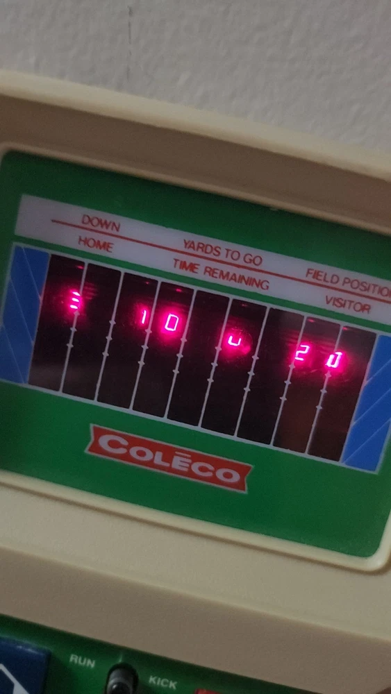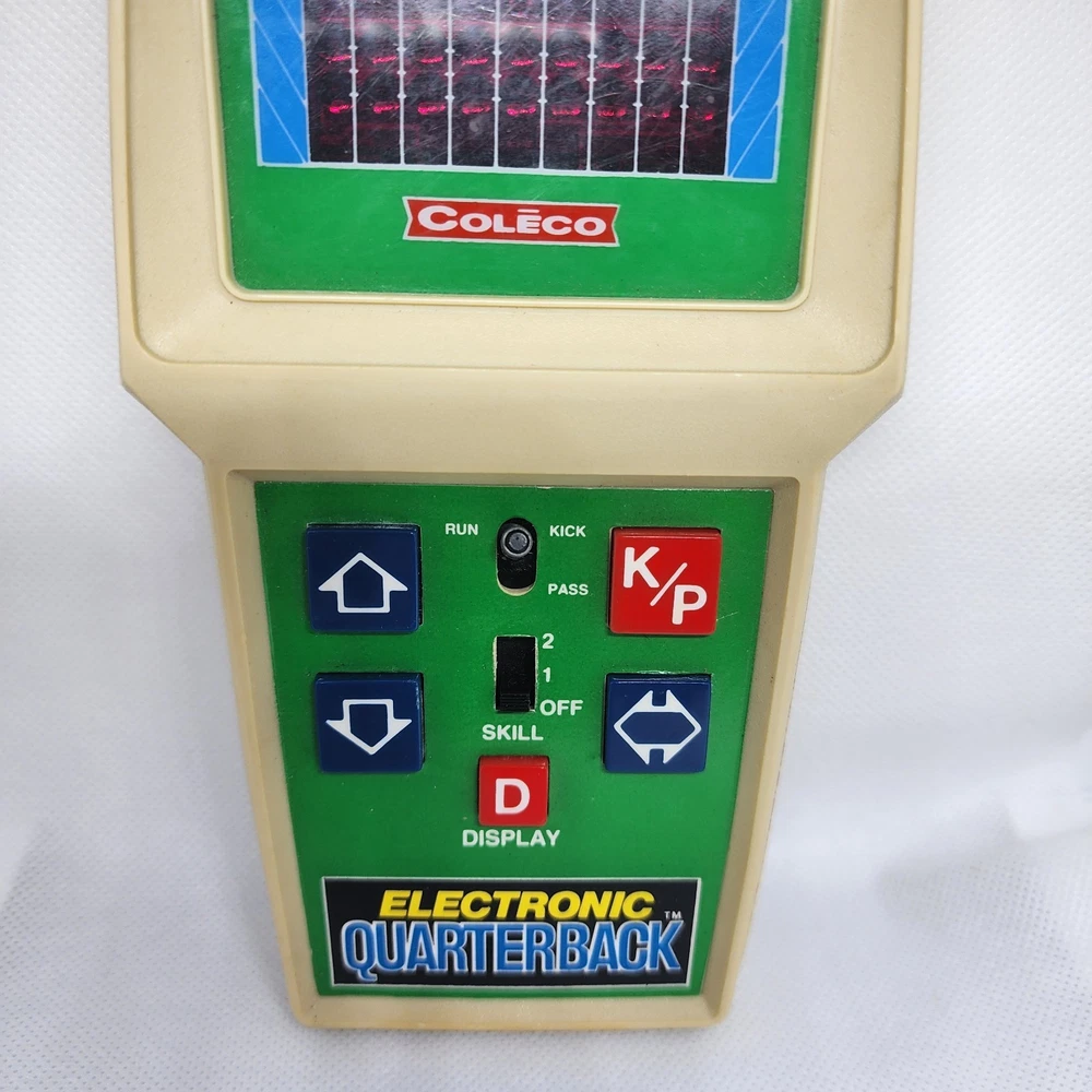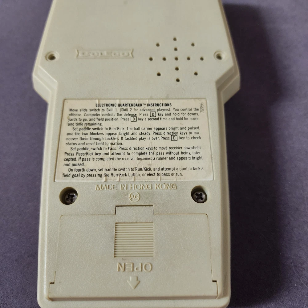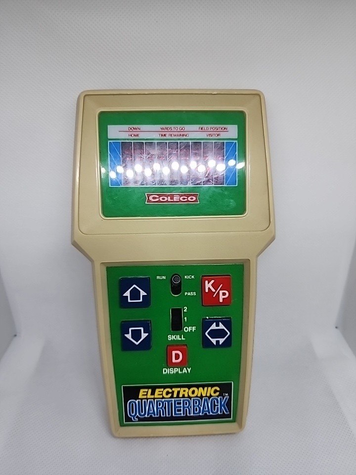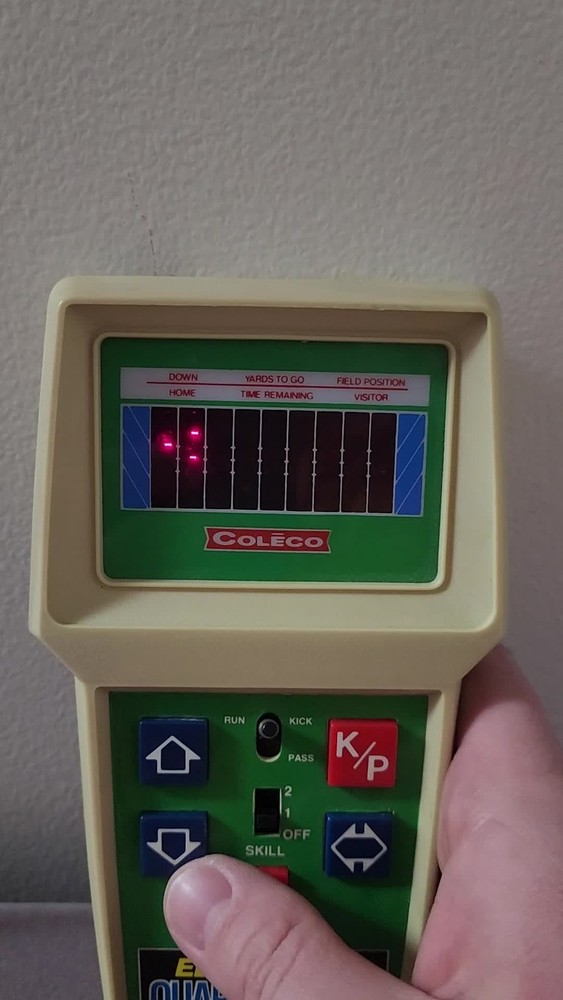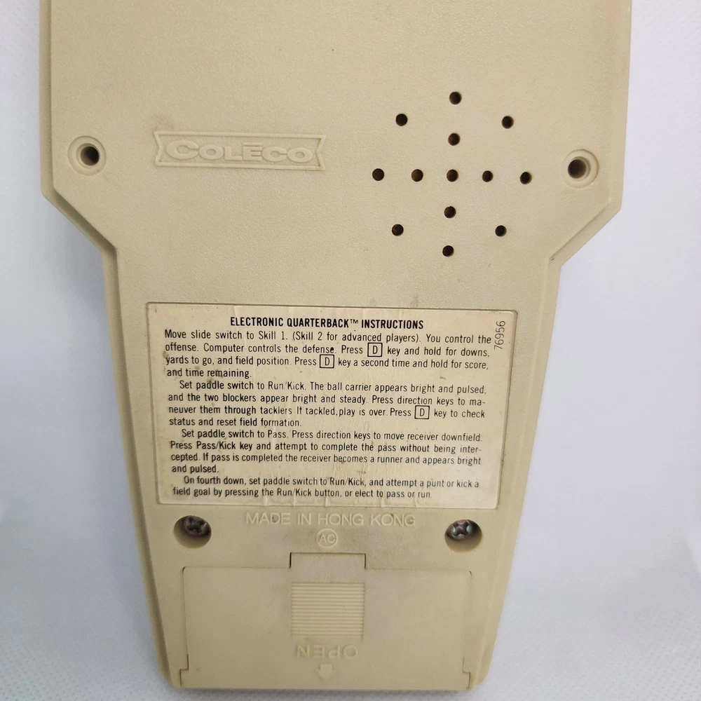 COLECO ELECTRONIC QUARTERBACK Tested working (see video) Hong Kong 1978 on the time remaining screen it sometimes won't fully show the 0 (see pictures) has a small amount of yellowing * the screen has a few small scratches but not very noticeable.