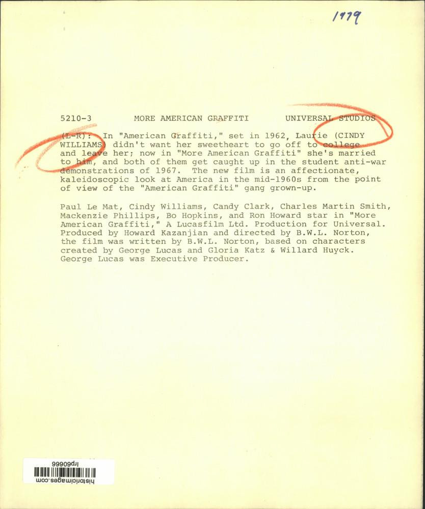 ebay template Note: Please study the images carefully to determine the condition of this vintage photograph, as it may not be in perfect condition. It may contain wrinkles, cracks, and possibly even tears due to its age and how it was handled before it got to us. A scanner may interpret colors and contrast differently than human eyes will, so it is possible that the actual photograph may be slightly darker or lighter in person. This vintage photograph is offered for sale as a collectible item and conveys no transfer of copyright. 1979 Press Photo Actress Cindy Williams in "More American Graffiti" - lrp60666 This is an original press photo. In American Graffiti, set in 1962, Laurie (Cindy Williams) didn't want her sweetheart to go off to college and leave her, now in "More American Graffiti," she's married to him and both of them get caught up in the student anti war demonstration of 1967. The new film is an affectionate, kaleidoscopic look at America in the mid-1960s from the point of view of the American Graffiti gang grown up. Photo measures 9.75 x 8.25inches. Photo is dated --1979. PHOTO FRONT PHOTO BACK Historic Images Part Number: lrp60666 FAQs Q: Can I just download a digital version instead? A: No, we sell only vintage originals and do not make or distribute any copies, including digital ones. Q: Do you combine shipping and invoices? A: Multiple photos won on the same seller ID combine automatically through the eBay checkout process. If you encounter problems with this, send us a message via eBay messaging and we will send you an invoice. Due to eBay limitations, we cannot combine items won on our different seller IDs for a single shipping charge. Q: How quickly do you ship the items once paid? A: We ship within one business day after your payment clears. If you do not receive an "order shipped" email from us by the close of the second business day from submitting payment, please e-mail us via eBay messaging. Q: How do you make sure my photograph arrives safely? A: We package each order between two cross-corrugated pieces of cardboard to ensure that the package is as difficult to bend as possible. We then wrap each order in a plastic sheet to help protect against moisture. We want you to rest assured that we take every precaution to ensure that the photograph you receive will be in the same condition in your care as it was in ours. Q: Will the "Historic Images" watermark be on my photo when I receive it? A: No. This is a digital watermark we use to protect our images. It is not printed on the photo. Q: What are your office hours? A: eBay for us is a business, and a very fun one to be in! We are open M-F 9 to 5 (CST). Therefore, we do not return e-mails and phone calls over the weekend. We observe the following holidays: New Years Day, Memorial Day, Fourth of July, Labor Day, Thanksgiving and the day after Thanksgiving, Christmas Eve and Christmas Day. Q: Where did all these vintage photos come from? A: These original vintage photographs are from various news service and newspaper photo archives from locations around the country including: Boston, Detroit, Tampa, Chicago, Denver, Seattle, New Orleans, Milwaukee, Portland, Spokane, and more. We do not copy or reproduce any photographs -- every item is a unique vintage piece that was housed in a news archive. Q: Can I use this photograph in my book/blog/website? A: The short answer is no. There is no transfer of copyright for republication or reproduction with these photographs when you purchase them, and only photographs taken before 1923 are currently automatically in the public domain. Permission from the copyright holder, which usually can be identified from the back of each photo, must be sought to republish or reproduce the image for any purpose. Q: Do you relist items (in case I miss an auction ending)? A: Auction items that receive no bids are relisted in our store (historicimages-store on eBay) as a fixed-price item and at a higher price than the starting auction price. Q: Do you leave feedback? A: Yes, we always leave feedback for buyers. Our software monitors when our buyers leave us feedback, then notifies us that we can leave feedback for the buyer. Rest assured, if you leave feedback, we will do the same! Check out our family of eBay IDs: historicimages01 Sports Photos historicimages02 Entertainment Photos historicimages03 Americana Photos historicimages04 International & War Photos historicimages05 Transportation Photos historicimages06 Photos of All Subjects historicimages07 Entertainment Photos historicimages08 Newsworthy Photos historicimages09 Entertainment Photos historicimages10 Sports Photos historicimages-store Our largest fixed-price selection historicimages-gallery Hand-picked photos Saturday night auctions About Us Historic Images was formed in September 2009, with a handful of scanners working out of a basement to digitize newspaper photo archives. We have since moved out of the basement, and we can now archive thousands of photos per day. Our company has worked with magazines and newspapers from Detroit, Boston, Denver, Seattle, Tampa, Chicago, and New Orleans, just to name a few. We are constantly adding to our inventory, and have assembled an archive of millions of photos to date. As our company evolved, we began our eBay business, which brings thousands of fresh auctions per week to the world's largest online auction marketplace. Our custom software systems and team of great employees allow us to efficiently scan and sell large photo archives online. At the very core of our company's DNA is a strong commitment to customer satisfaction and strict integrity for our product. Our promise to you is that we will do everything in our power to provide you a great buying experience. Copyright 2009 - Present, Historic Images, Inc. Sell Smarter with Kyozou. Inventory and Ecommerce Management