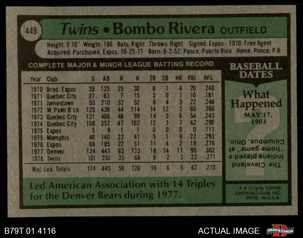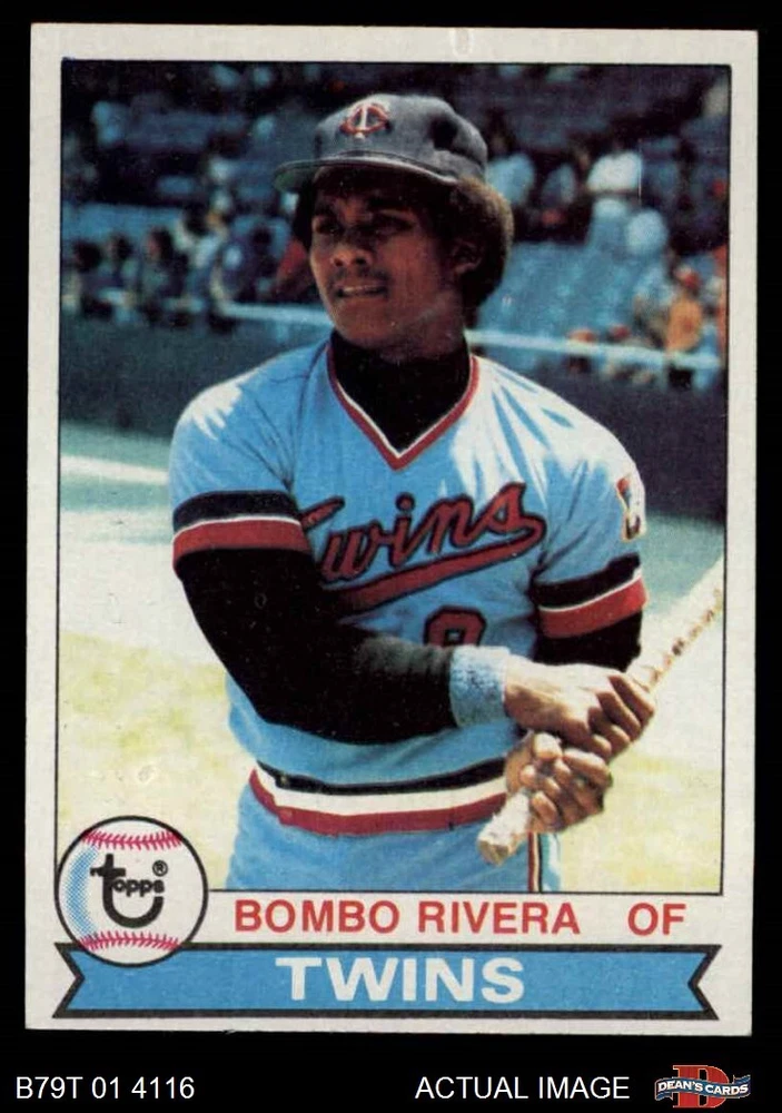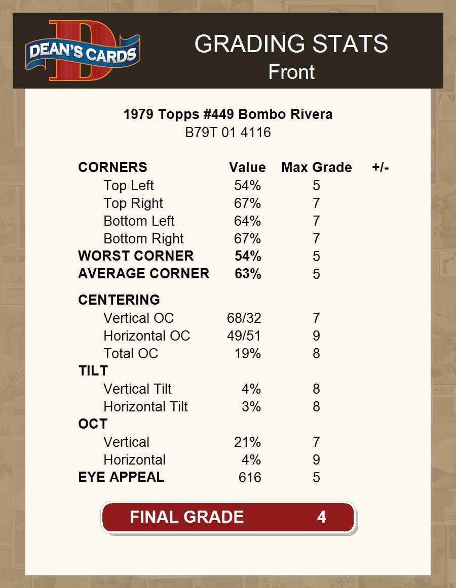 1979 Topps #449 Bombo Rivera Twins 4 - VG/EX If the scan in the listing says ACTUAL IMAGE, you will receive the card pictured. For cards issued after 1983, we will often use representative images and you will not receive the exact card pictured. Shipping Policy You only pay shipping on the first item. If you order multiple items on the same order, you will only be charged once for shipping. We do not combine shipping on multiple orders. To avoid multiple shipping charges we recommend using eBay's "Add to Cart" feature to check out multiple items in one transaction, or please request and allow for us to send an invoice to reflect the combined shipping charges. Canadian customers - We send all of our Canadian/International packages with tracking and cannot make any exceptions to this policy. Negotiating Prices All prices are final and we do not negotiate. This policy is to ensure that everyone knows that they are getting our best possible price. So please do not ask us to negotiate on price. Return Policy Dean's Cards has a 100% Money Back Satisfaction Guarantee on all purchases, as long as the product is returned within 30 days of receiving the product. Card Grading Each card is first reviewed by a member of our team, in order to detect any flaws that may not be visible on a scan, such as wrinkles, creases, print spots, or light stains. The vast majority of our vintage cards are professionally graded by the Dean's Cards Grading Software and include a 100% satisfaction guarantee. Our grading is on par with PSA standards when it comes to corners, centering and flaws - and tends to grade a bit tougher than PSA, on cards with a tilted image or rough edges. This grading software was developed to provide far better grading and consistency than can be achieved using the human eye. Determining the card's grade The sharpness of the corners and the degree to which a card was cut off-center determines the maximum possible grade that the card can receive. The card's grade is further reduced by any flaws or blemishes that it may have. Each card is evaluated on the following characteristics and assigned a score. Corners - Each corner of a card is individually analyzed, and then assigned a score on how square, sharp, and flawless it appears. Centering - The borders are measured, at multiple points along the edge, to determine the horizontal and vertical centering and tilt. Defects - The card is examined for imperfections, such as: size, print flaws, dings, stains, creases, or other wear which could lower its grade. Bonus for Perfect Centering - A vintage card, with near perfect centering, is given a one-half grade bonus. So when you buy one of our cards with a half-grade (e.g. 3.5 or 6.5) it will appear perfectly centered, both vertically and horizontally. Grading Criteria Worst Corner - A card can grade only as high as the worst corner will allow. Average Corner Tilt - The difference in width of a card border near the top, compared to the bottom. OCT - The sum of how far a card is Off-Center, plus its Tilt. Minimum Centering Requirements Eye Appeal - The combination of a card's centering, corners and tilt. Well-Centered - Cards that appear perfectly centered receive a bonus of one-half grade. Flaws, defects and other imperfections - can lower a card's grade. Card Backs - the above criteria is also considered, for the back of the cards, but does not inflict as severe of a penalty to its grade. Packaging Once scanned, the cards are placed in "soft" sleeves, which have an open top for easy removal. The Dean's Cards label is placed on the top back of the card sleeve. Every card you buy features a QR Code that you can scan to see your ACTUAL CARD and its grading statistics. Please note that when images are enlarged there may be instances of vertical lines running through the scans. This was caused by a "dust speck" on the scanner and can be verified by the vertical lines running into the black margins on the top and bottom of the image. About Dean and Dean's Cards Dean's Cards Makes Card Collecting - Fast, Easy And Fun. Dean's Cards was founded in 2002 and has become the leading online seller of vintage sports cards and non-sports cards. Our inventory has grown to more than a million vintage cards and we have a staff of 15-20 employees and a 8500 sq. ft. office space in Cincinnati, Ohio.