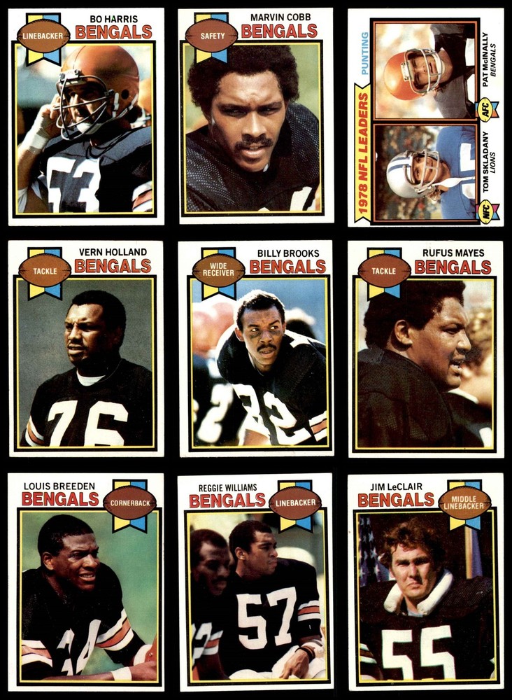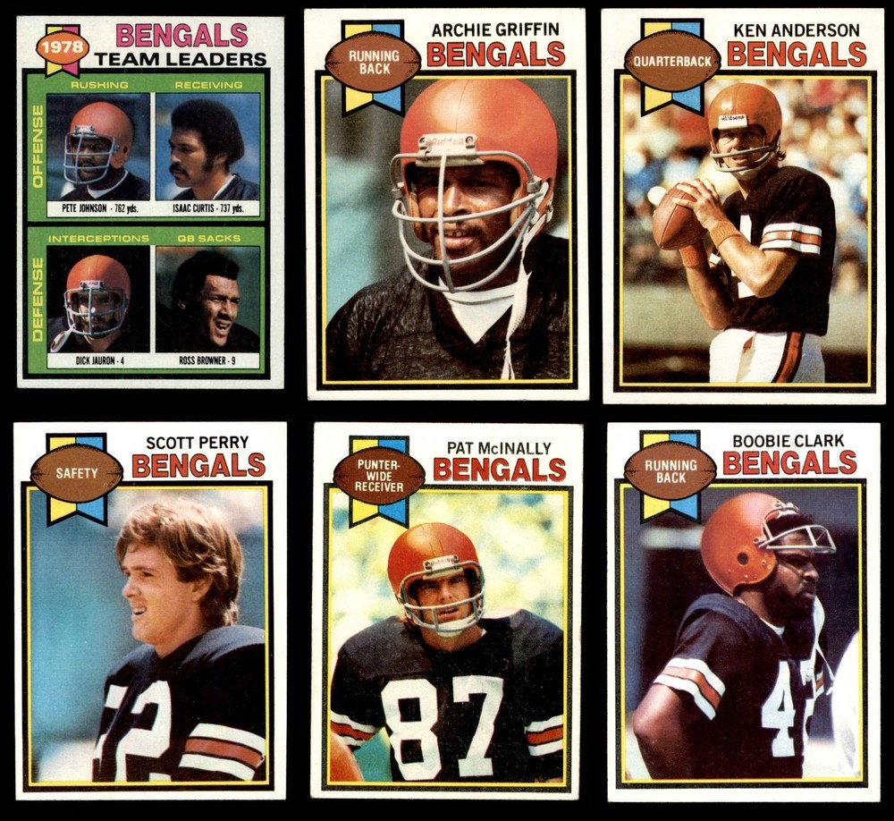 This set contains the following cards 1979 Topps #6 - Tom Skladany / Pat McInally Punting Leaders 3 - VG Front Back 1979 Topps #14 Bo Harris 4 - VG/EX Front Back 1979 Topps #34 Pete Johnson 4 - VG/EX Front Back 1979 Topps #74 Pat McInally 3 - VG Front Back 1979 Topps #94 - Pete Johnson / Isaac Curtis / Dick Jauron / Ross Browner Bengals Team Leaders & Checklist 4 - VG/EX Front Back 1979 Topps #115 Ken Anderson 5 - EX Front Back 1979 Topps #135 Ross Browner 5 - EX Front Back 1979 Topps #156 Marvin Cobb 4 - VG/EX Front Back 1979 Topps #184 Archie Griffin 4 - VG/EX Front Back 1979 Topps #205 Ken Riley 4 - VG/EX Front Back 1979 Topps #225 Chris Bahr 5 - EX Front Back 1979 Topps #245 Blair Bush 4 - VG/EX Front Back 1979 Topps #271 Vern Holland 4 - VG/EX Front Back 1979 Topps #289 Scott Perry 5 - EX Front Back 1979 Topps #309 Boobie Clark 4 - VG/EX Front Back 1979 Topps #328 Reggie Williams 5 - EX Front Back 1979 Topps #354 Billy Brooks 4 - VG/EX Front Back 1979 Topps #374 Rufus Mayes 4 - VG/EX Front Back 1979 Topps #395 Isaac Curtis 4 - VG/EX Front Back 1979 Topps #414 Don Bass 5 - EX Front Back 1979 Topps #434 Lenvil Elliott 5 - EX Front Back 1979 Topps #454 Jim LeClair 5 - EX Front Back 1979 Topps #474 Louis Breeden 4 - VG/EX Front Back 1979 Topps #505 Eddie Edwards 5 - EX Front Back This 1979 Topps Cincinnati Bengals Team Set contains the 1979 Topps Bengals football cards and makes a great gift for any Bengals fan. ?With an inventory of over 15,000 team sets, Dean's Cards has Team Sets & Near Team Sets for just about every team, in multiple conditions, for all sports, for most major sets issued between 1909 and 1979.