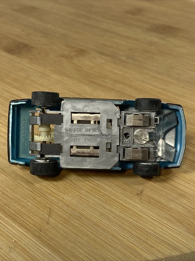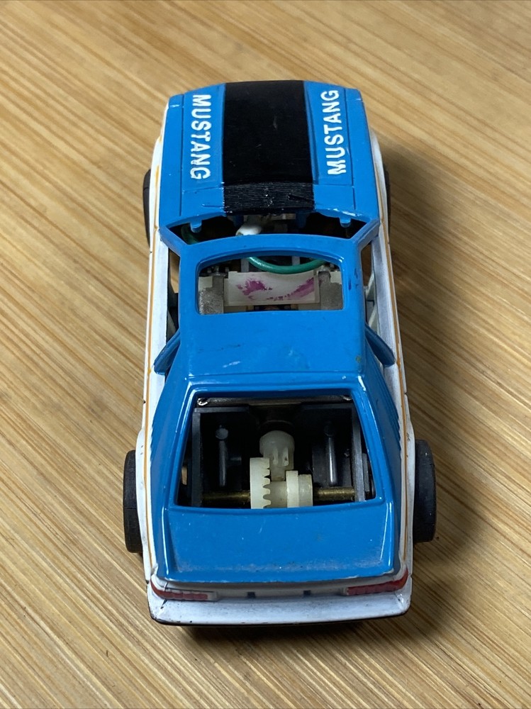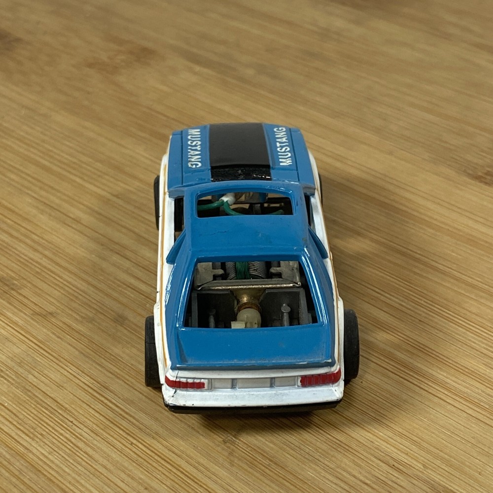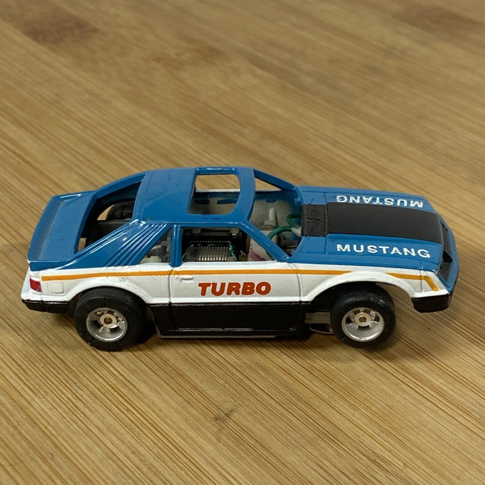 This Tyco '79 Mustang is a rare find for slot car enthusiasts. The car features a blue, black, and white turbo design, making it a standout addition to any collection. With its lighted body, this car is sure to impress on any track but is missing windows. The brand is TYCO, and this particular car type is a HO scale slot car. This is an original item, not a reproduction. Despite being used, this car is in excellent condition and has been well-maintained. Don't miss out on the chance to own this unique and exciting piece of slot car history.