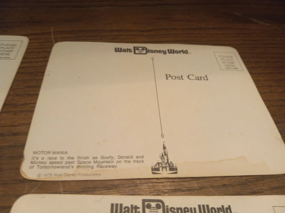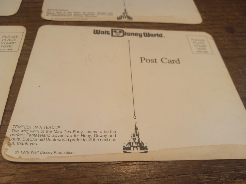 These vintage 1979 Disney postcards are a nostalgic treasure! Featuring classic characters like Mickey, Donald, and Goofy, they capture the magic of old-school Disney. The set includes fun scenes like "Motor Mania" and "Tempest in a Teacup." Though pre-loved with minor marks and stains, the charming artwork still shines. Perfect for collectors or Disney fans who appreciate retro memorabilia. The 5.5"x3" size makes them great for framing or displaying. A delightful piece of Disney history!