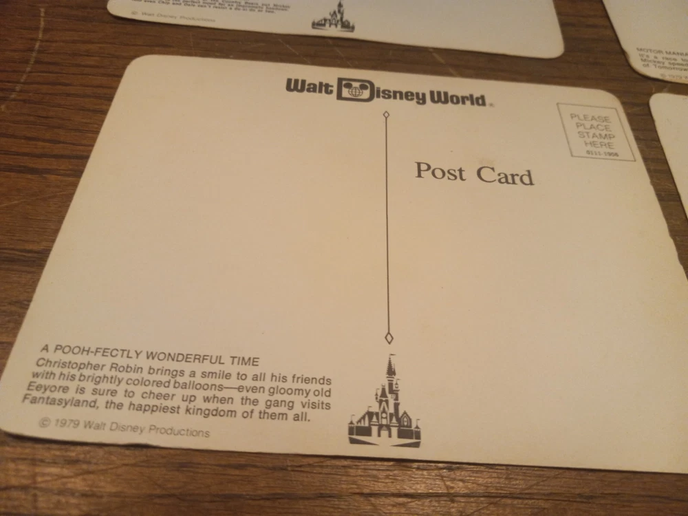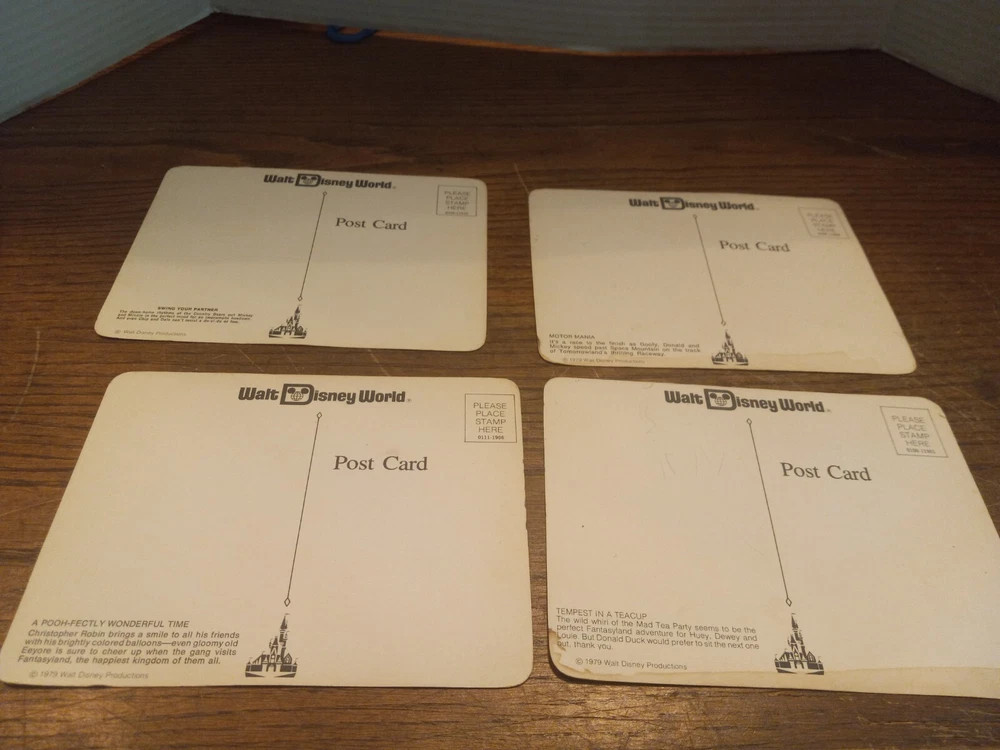 4 Walt Disney World PostCards Post Card 1979 Mickey, Donald Duck, Goofy Includes: 1- Swing Your Partner, Motor Mania, Tempest In A Teacup, A Pooh-Fectly Wonderful Time Measures Approx: 5.5"x3" Year: 3 Of Them Show 1979-- One Does Not Have A Year On It Used Condition Has Some Marks On Them There Are A Brown Stain On A Few Of Them