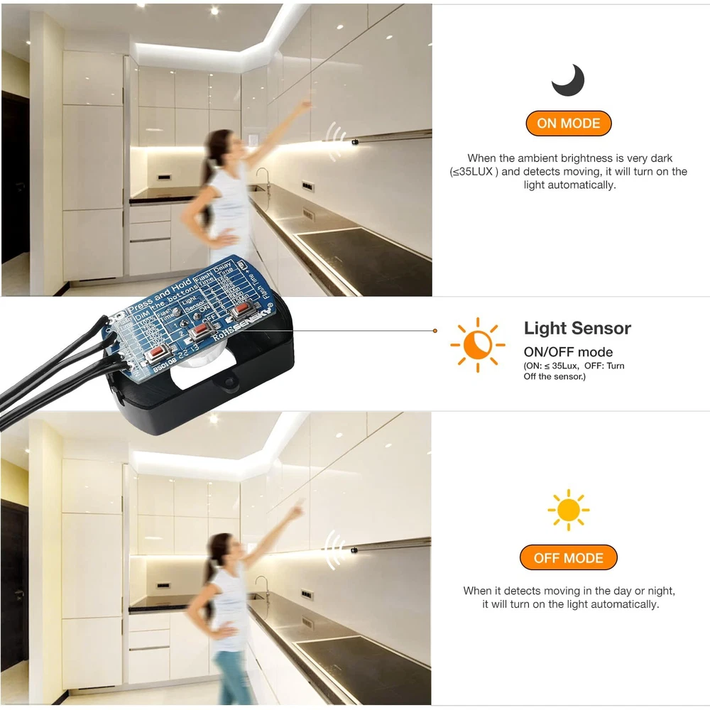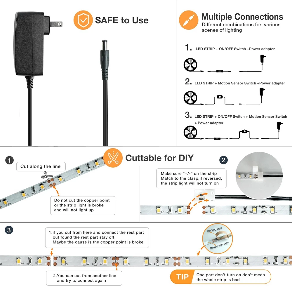 【Upgraded Motion Activated Strip Light】Motion Sensor switch turn light on or off by human induction.The latest PIR motion sensor can precisely adjust the light intensity(15% -100%), delay time(15s-30mins) and light sensor(ON/OFF mode) with just push of a button 【Power Adapter】: FCC listed power adapter run on DC 12V, safe to children, Efficiency Level V 【High Brightness and Long Life LED】: While normal LED brightness is 5-6 lm/LED, We use high brightness LED: 6-7lm/LED to ensure better lighting. 50000+ hours of long life 【Light Sensor Adjustable】ON/OFF mode (ON: 35Lux, OFF: Turn Off the sensor).If light sensor is on:only when the ambient brightness is ≤ 35Lux and detects moving,it will turn on the light automatically within the sensing range.If light sensor is off,whenever it detects motion,it will turn on the light automatically 【Customer Service】: You can enjoy worry-free shopping by our 12 months.Plus, we've a picture on how avoid the most common problem on using motion sensor switch and led strip light, please read it carefully before using