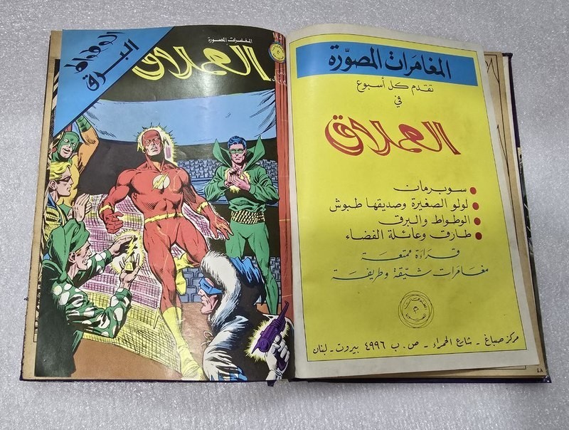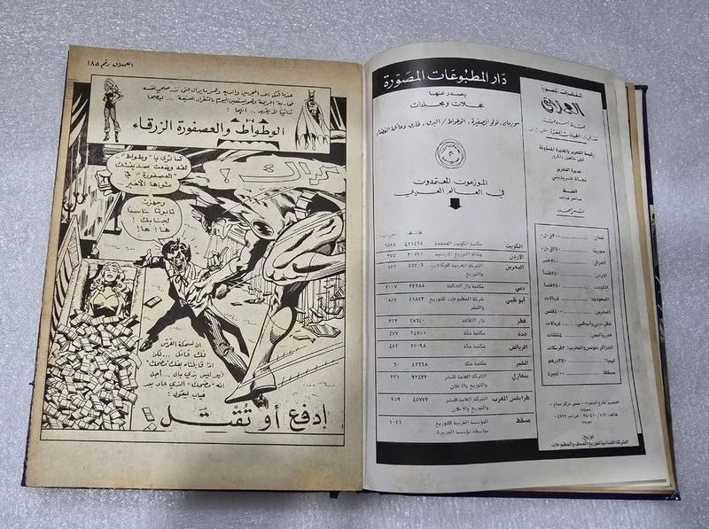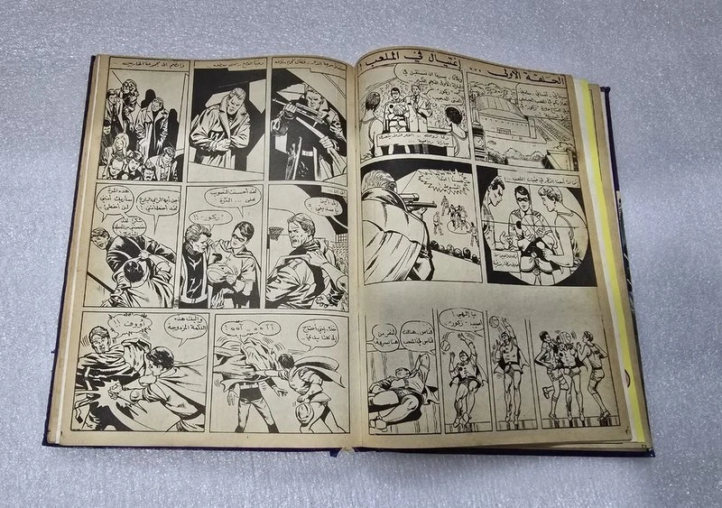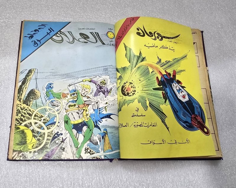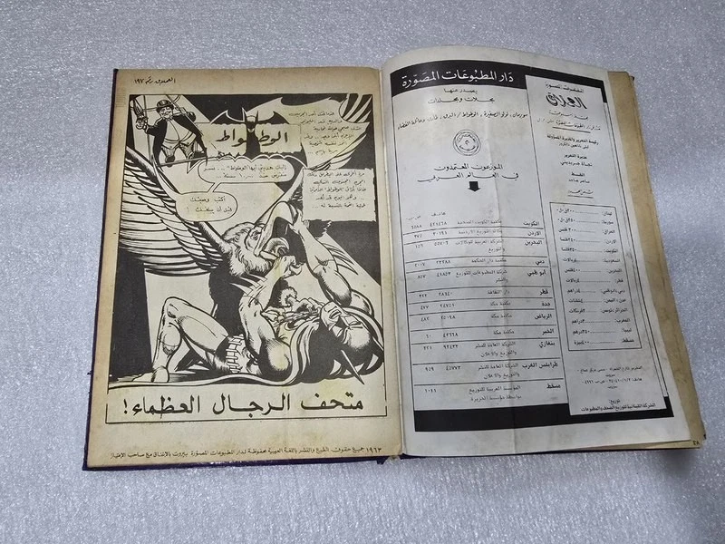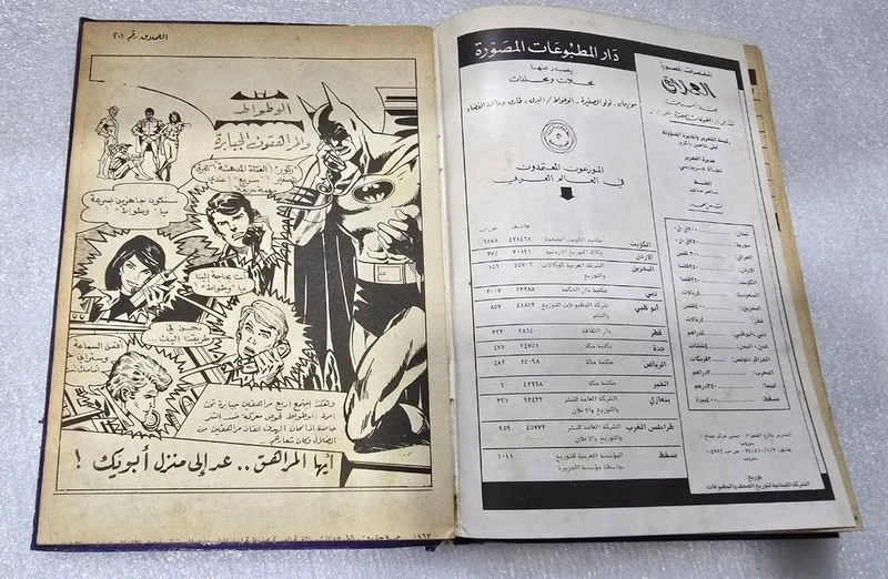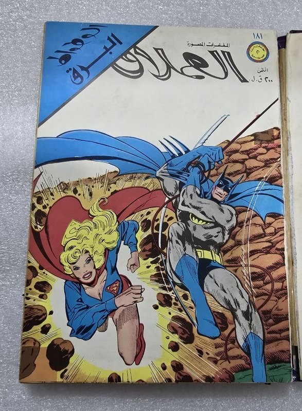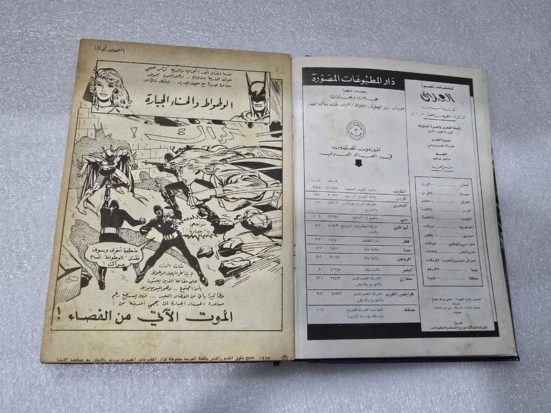 1980 Batman Lebanese Arabic Comics original Book No.18مجلد الوطواط العملاق المغامرات المصورة كومكس Title : Batman الوطواط Year: 1980 240 pages Lebanese Original Arabic Comics. Not a reprint. Volume No. 18 Comics #: 181, 185, 189, 193, 197, 201 Condition: Good , minimal Tape repair to spine. No text markings , Small tears on spine (check images).