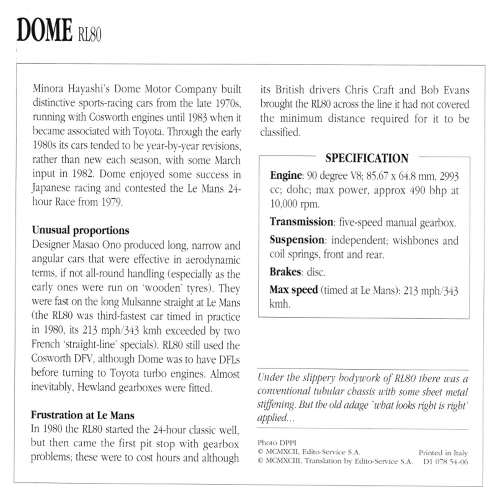 Collectors Club Classic Cars card. Dome RL80 1980 Competition category. Each card provides information and specifications of the featured car. Very good condition. Any scanning defects on the images, such as vertical lines, are not present on the actual card. Postage can be combined for multiple purchases. Cards will be protected, and sent in stiff cardboard envelopes.