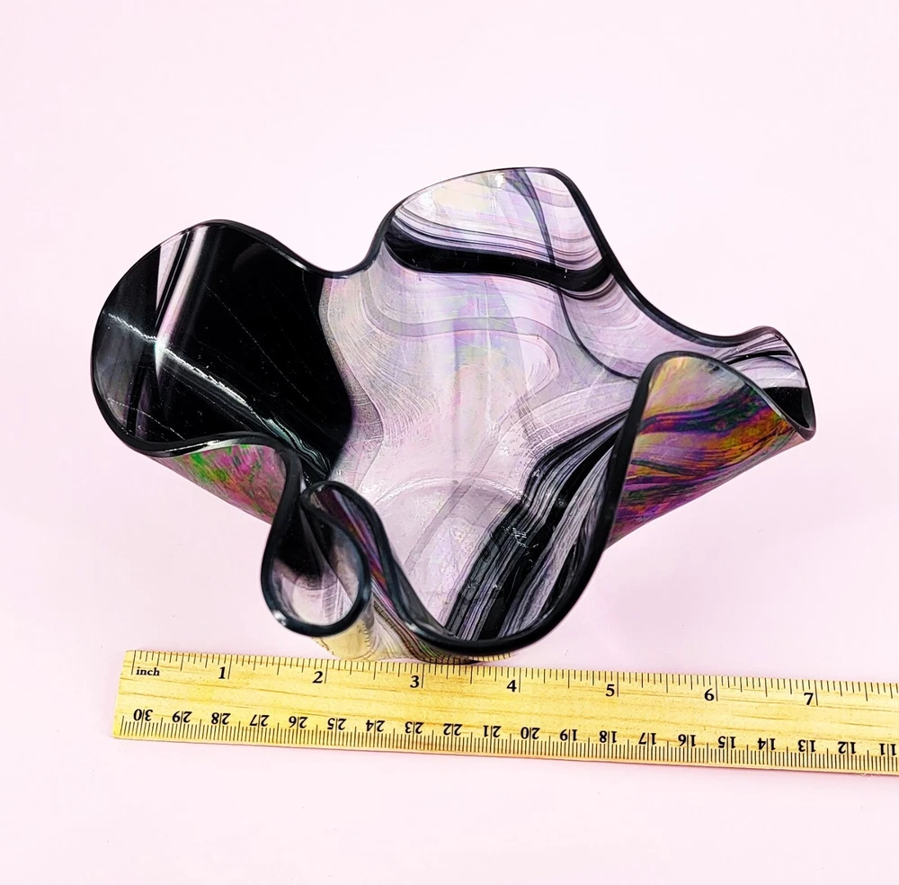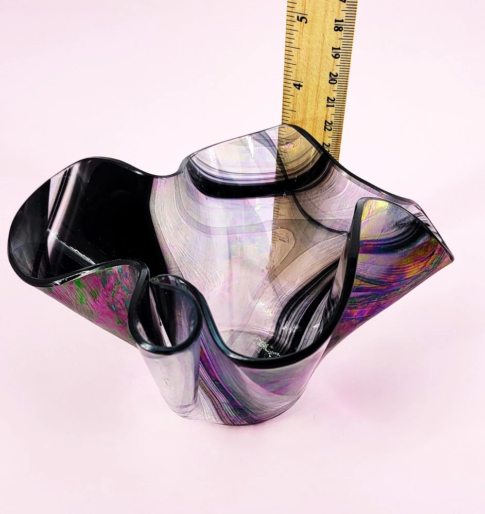 UNBRANDED: 1980s Hand Blown Art Glass with Iridescent Colors over Black and Silver Glass in the shape of a Handkerchief to hold Votive Candles. COLORWAY: Pastel Iridescent Color over Black and Silver finish. The color is stunning in the light! SIZE: Approximately 7" Wide and 3.5" High. CONDITION: Please see my photos for exact details. This is a rare find and beautifully made Art Glass 1980s votive handkerchief style holder. There are no signs of chipping or cracks. It is a perfect addition to your collection of contemporary art glass!! It makes a beautiful pop of color for any decor! Thank you for stopping by today, please come again!