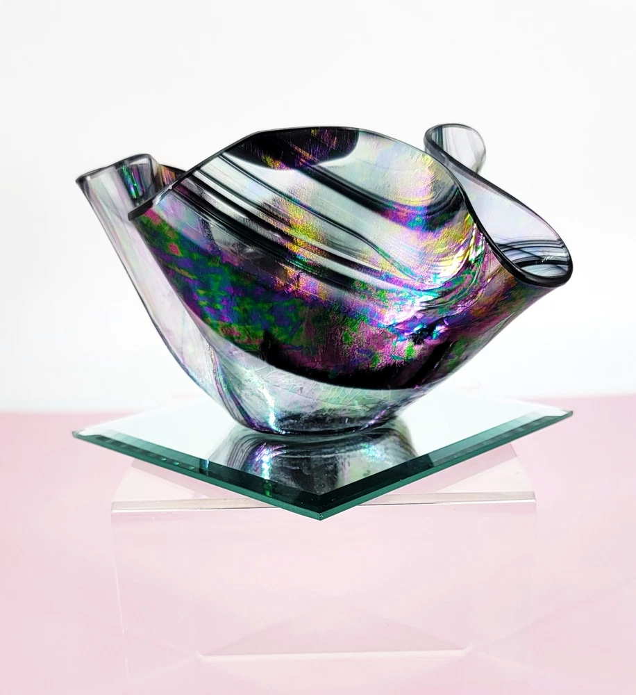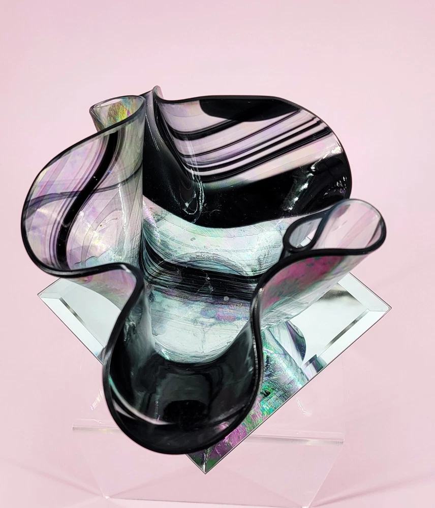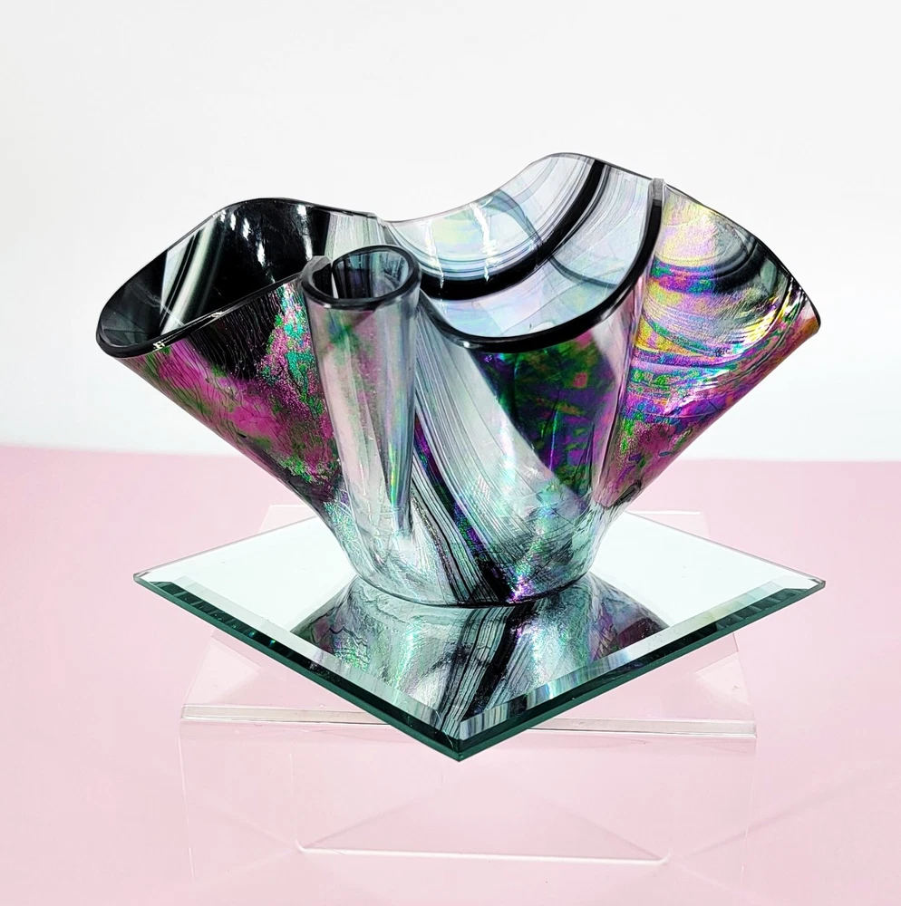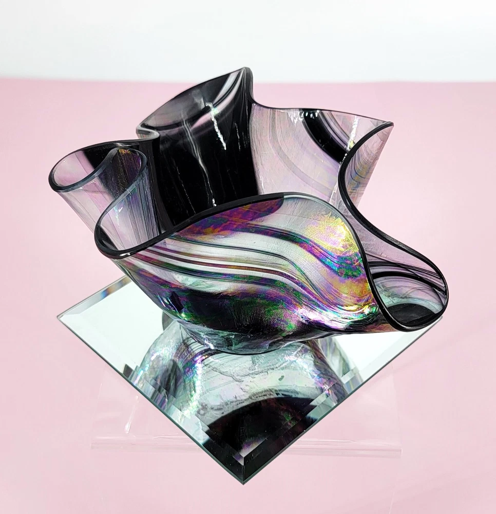 1980 Hand Blown Pastel Iridescent & Black Art Glass Handkerchief Votive Holder