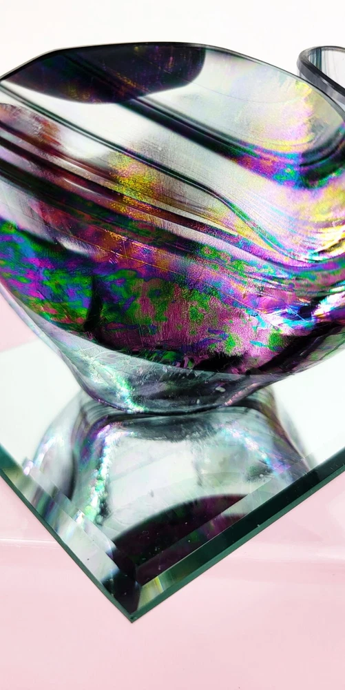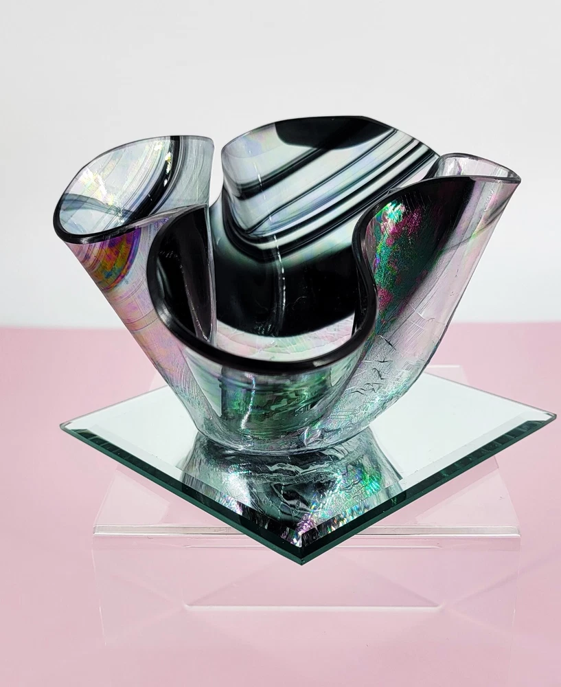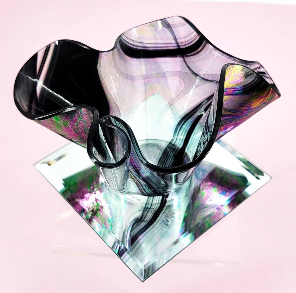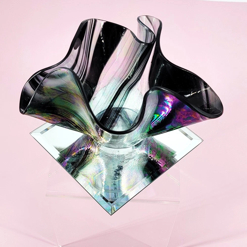 1980 Hand Blown Pastel Iridescent & Black Art Glass Handkerchief Votive Holder