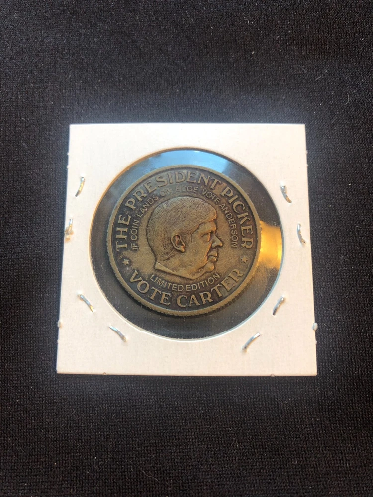 I have for sale a 1980 Presidential election flipping token for the undecided voters. The token is metal, it is 1 1/4 inch in diameter and in a high-grade circulated condition. On one side the token reads, THE PRESIDENT PICKER - 1980 - VOTE REAGAN. In the center it has the bust of Ronald Reagan and above the bust it reads IF THIS COIN LANDS ON EDGE, VOTE ANDERSON. On the other side it reads the same but reads VOTE CARTER with his bust in the center. Please see over 950 more collectibles for sale in my EBAY STORE at TE Collectables.