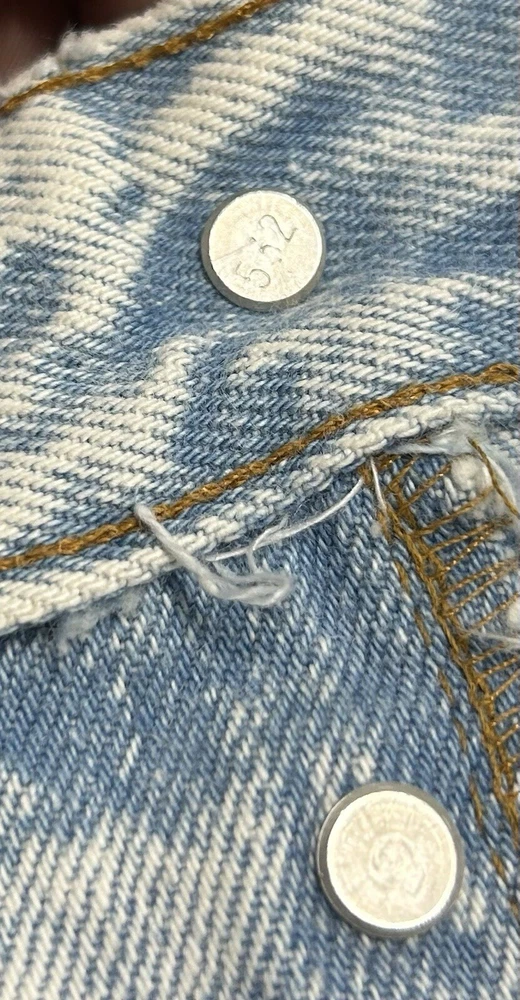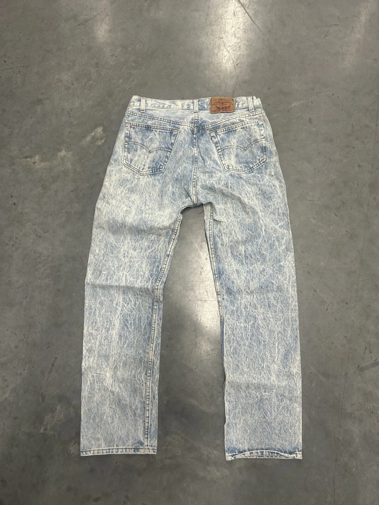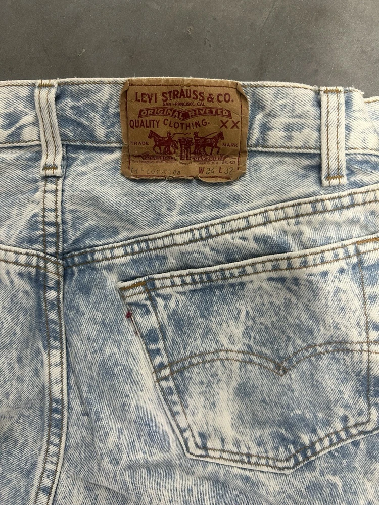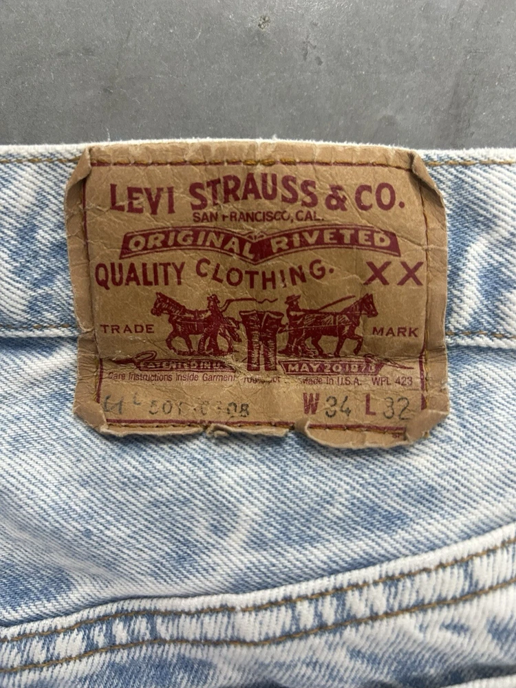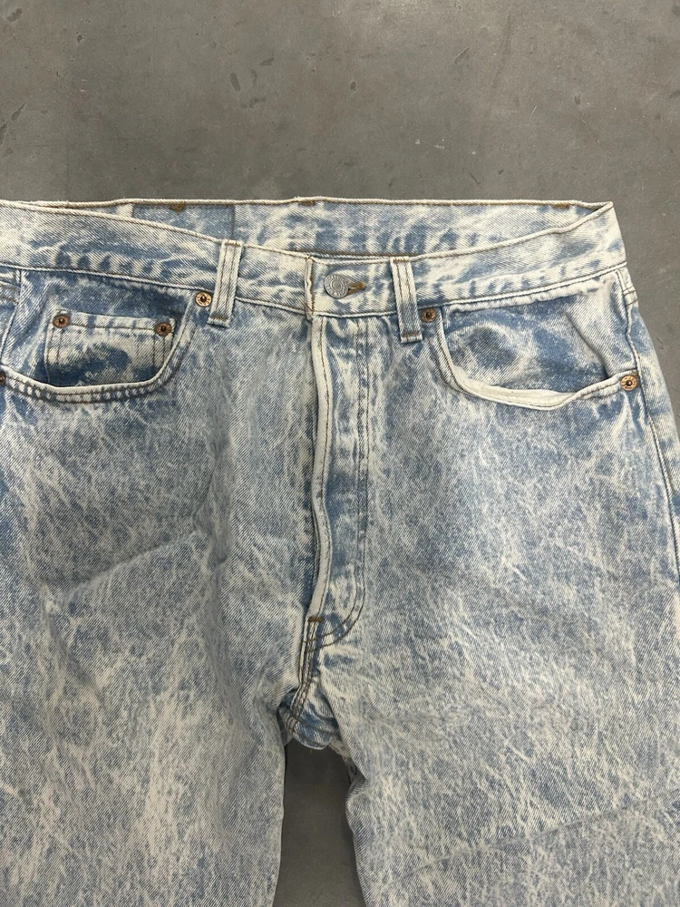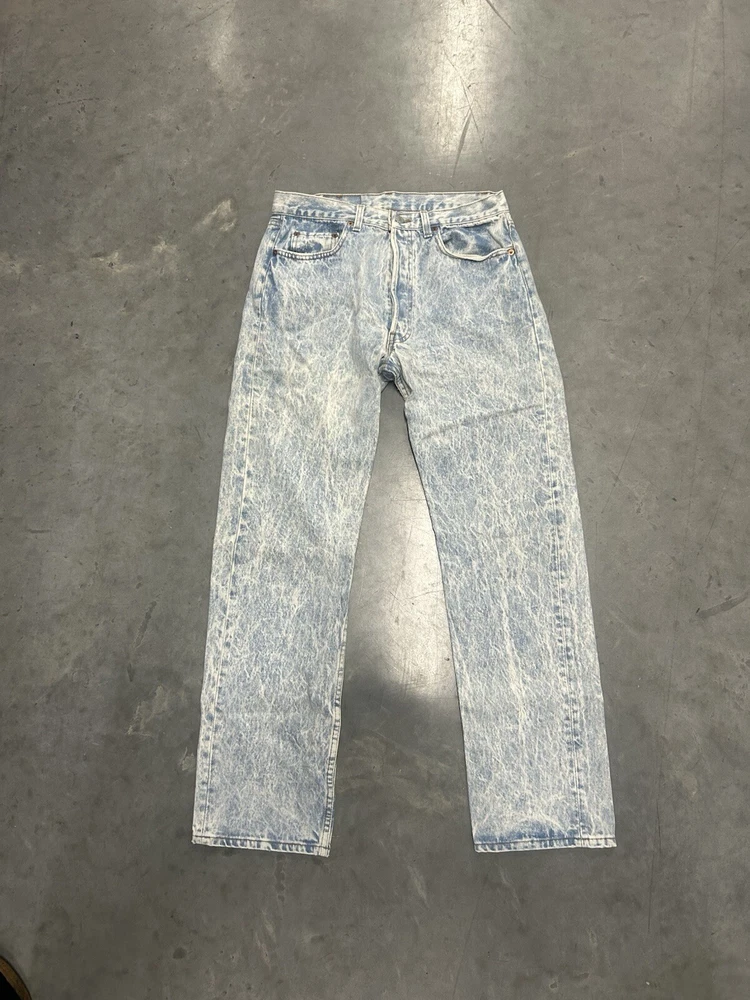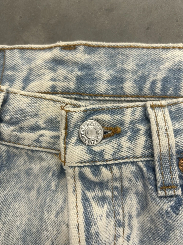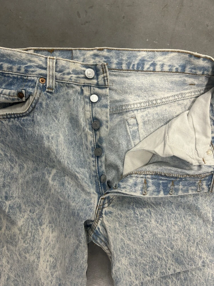 1980s Vintage Levi's 501 Button Fly Jeans in White Acid Wash, size 30x32. Made of denim, featuring a regular fit and a straight style. These distressed jeans have pockets, a vintage look, and a USA theme. The jeans are from the United States and are a unisex design.