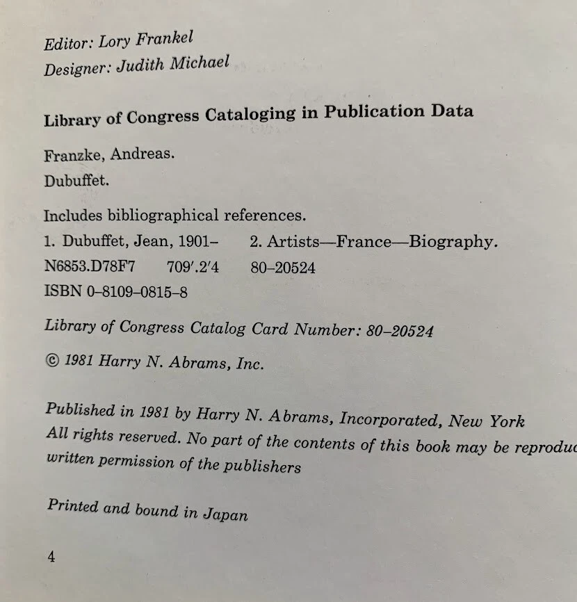 Genre: Art & Culture Author: Andreas Franzke Book Title: DUBUFFET Illustrator: Jean DUBUFFET Original Language: English Era: 1980s Seller Notes: “Excellent Condition on the Inside A small repair on the Back of the Dust Jack See Photo” Ex Libris: Yes Features: Dust Jacket, Illustrated Country of Origin: France Publisher: Harry N. Abrams Inc. Language: English Format: Hardcover Topic: ART Publication Year: 1981