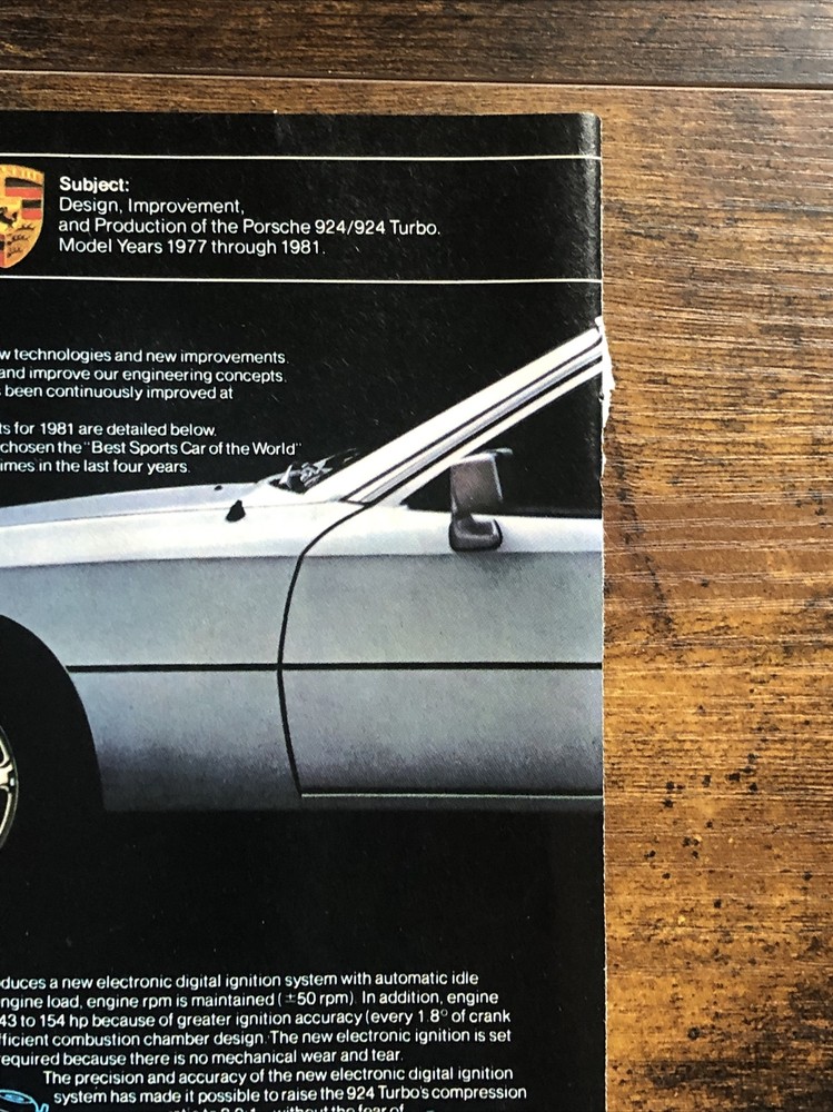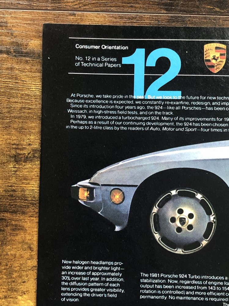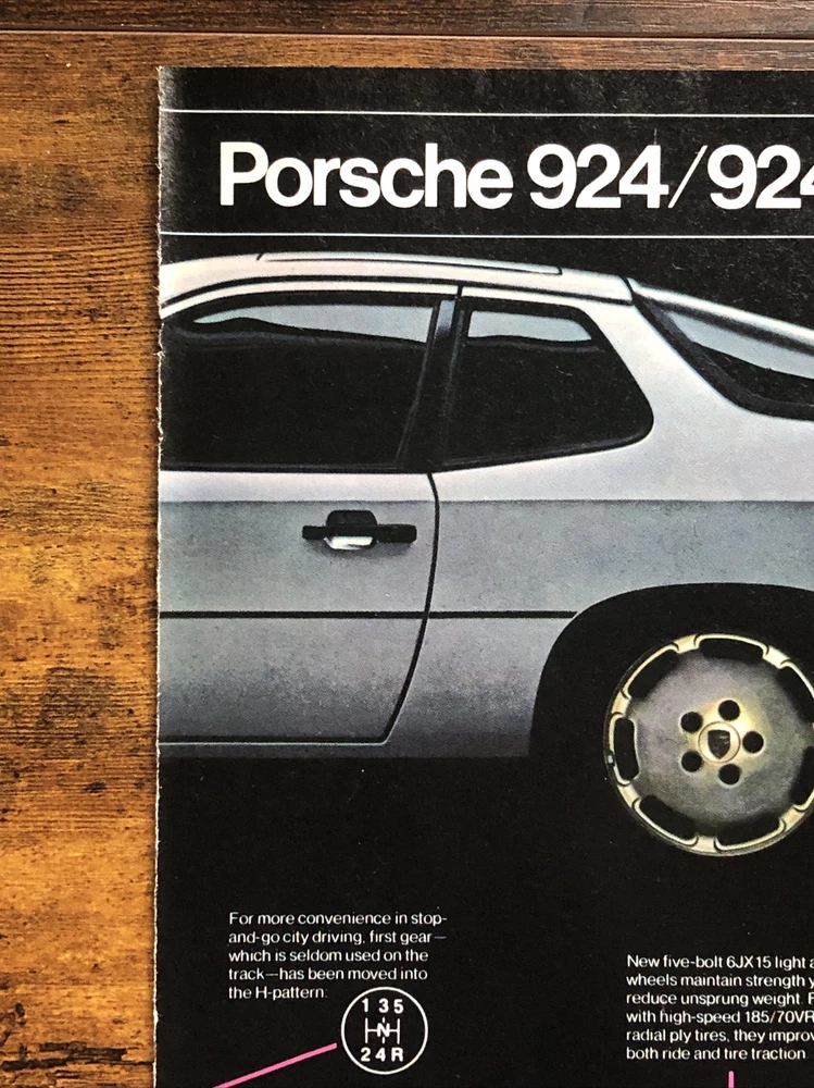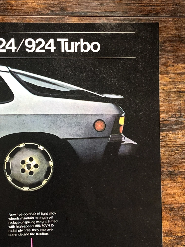 This vintage magazine print ad from the 1980s features a stunning 1981 Porsche 924 Turbo. The ad showcases the design improvements made to the model between 1977 and 1981, making it a must-have for any Porsche collector or enthusiast. The multi-color ad highlights the beauty of the automobile and its European origins, while also emphasizing its theme of automobiles. This original print ad is a rare find and perfect for anyone interested in vintage Porsche advertising. Original 2-page vintage magazine print ad. Each page measures approximately 8”x11”. The pages are not attached.