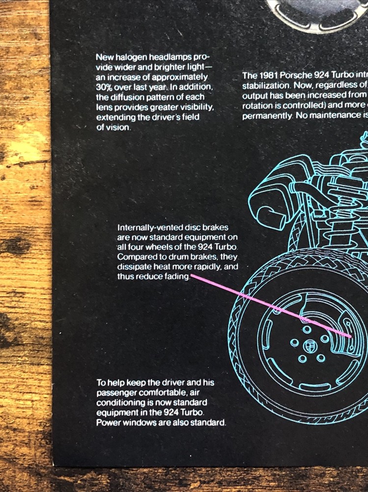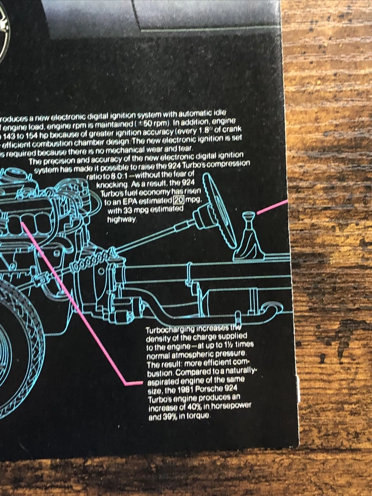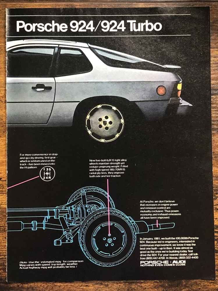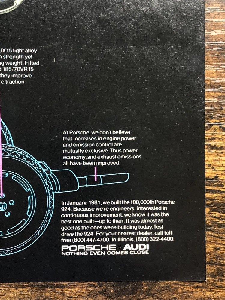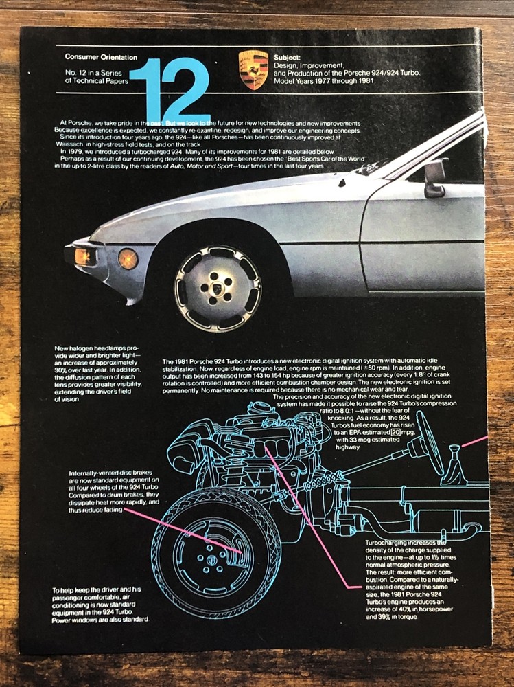 This vintage magazine print ad from the 1980s features a stunning 1981 Porsche 924 Turbo. The ad showcases the design improvements made to the model between 1977 and 1981, making it a must-have for any Porsche collector or enthusiast. The multi-color ad highlights the beauty of the automobile and its European origins, while also emphasizing its theme of automobiles. This original print ad is a rare find and perfect for anyone interested in vintage Porsche advertising. Original 2-page vintage magazine print ad. Each page measures approximately 8”x11”. The pages are not attached.