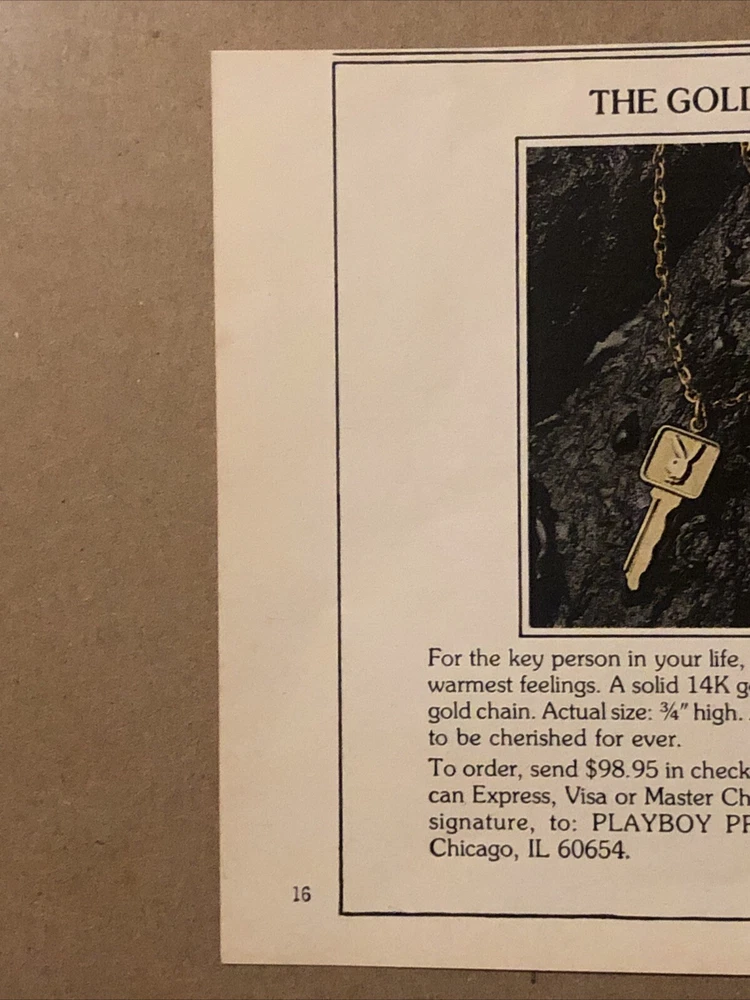 Add a touch of vintage glamour to your collection with this stunning 1981 Playboy magazine print ad featuring the iconic Bunny pendant. This original piece measures approximately 5.5"x5.5" and is a must-have for any fan of jewelry and is a perfect addition to any collection. Don't miss out on this unique and original piece of Playboy history.