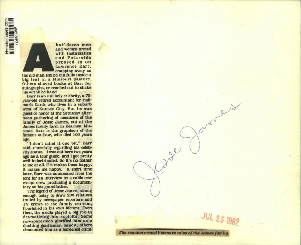 ebay template Note: Please study the images carefully to determine the condition of this vintage photograph, as it may not be in perfect condition. It may contain wrinkles, cracks, and possibly even tears due to its age and how it was handled before it got to us. A scanner may interpret colors and contrast differently than human eyes will, so it is possible that the actual photograph may be slightly darker or lighter in person. This vintage photograph is offered for sale as a collectible item and conveys no transfer of copyright. 1982 Press Photo Gathering of members of the family of Jesse James at their farm Jesse James - The reunion crowd listens to tales of the James family. A half dozen men and women armed with Instamatics and Polaroids pressed in on Lawrence Barr, snapping away as the old man smiled dutifully inside a big tent in a Missouri pasture. Other PHOTO FRONT PHOTO BACK Historic Images Part Number: nob93988 FAQs Q: Can I just download a digital version instead? A: No, we sell only vintage originals and do not make or distribute any copies, including digital ones. Q: Do you combine shipping and invoices? A: Multiple photos won on the same seller ID combine automatically through the eBay checkout process. If you encounter problems with this, send us a message via eBay messaging and we will send you an invoice. Due to eBay limitations, we cannot combine items won on our different seller IDs for a single shipping charge. Q: How quickly do you ship the items once paid? A: We ship within one business day after your payment clears. If you do not receive an "order shipped" email from us by the close of the second business day from submitting payment, please e-mail us via eBay messaging. Q: How do you make sure my photograph arrives safely? A: We package each order between two cross-corrugated pieces of cardboard to ensure that the package is as difficult to bend as possible. We then wrap each order in a plastic sheet to help protect against moisture. We want you to rest assured that we take every precaution to ensure that the photograph you receive will be in the same condition in your care as it was in ours. Q: Will the "Historic Images" watermark be on my photo when I receive it? A: No. This is a digital watermark we use to protect our images. It is not printed on the photo. Q: What are your office hours? A: eBay for us is a business, and a very fun one to be in! We are open M-F 9 to 5 (CST). Therefore, we do not return e-mails and phone calls over the weekend. We observe the following holidays: New Years Day, Memorial Day, Fourth of July, Labor Day, Thanksgiving and the day after Thanksgiving, Christmas Eve and Christmas Day. Q: Where did all these vintage photos come from? A: These original vintage photographs are from various news service and newspaper photo archives from locations around the country including: Boston, Detroit, Tampa, Chicago, Denver, Seattle, New Orleans, Milwaukee, Portland, Spokane, and more. We do not copy or reproduce any photographs -- every item is a unique vintage piece that was housed in a news archive. Q: Can I use this photograph in my book/blog/website? A: The short answer is no. There is no transfer of copyright for republication or reproduction with these photographs when you purchase them, and only photographs taken before 1923 are currently automatically in the public domain. Permission from the copyright holder, which usually can be identified from the back of each photo, must be sought to republish or reproduce the image for any purpose. Q: Do you relist items (in case I miss an auction ending)? A: Auction items that receive no bids are relisted in our store (historicimages-store on eBay) as a fixed-price item and at a higher price than the starting auction price. Q: Do you leave feedback? A: Yes, we always leave feedback for buyers. Our software monitors when our buyers leave us feedback, then notifies us that we can leave feedback for the buyer. Rest assured, if you leave feedback, we will do the same! Check out our family of eBay IDs: historicimages01 Sports Photos historicimages02 Entertainment Photos historicimages03 Americana Photos historicimages04 International & War Photos historicimages05 Transportation Photos historicimages06 Photos of All Subjects historicimages07 Entertainment Photos historicimages08 Newsworthy Photos historicimages09 Entertainment Photos historicimages10 Sports Photos historicimages-store Our largest fixed-price selection historicimages-gallery Hand-picked photos Saturday night auctions About Us Historic Images was formed in September 2009, with a handful of scanners working out of a basement to digitize newspaper photo archives. We have since moved out of the basement, and we can now archive thousands of photos per day. Our company has worked with magazines and newspapers from Detroit, Boston, Denver, Seattle, Tampa, Chicago, and New Orleans, just to name a few. We are constantly adding to our inventory, and have assembled an archive of millions of photos to date. As our company evolved, we began our eBay business, which brings thousands of fresh auctions per week to the world's largest online auction marketplace. Our custom software systems and team of great employees allow us to efficiently scan and sell large photo archives online. At the very core of our company's DNA is a strong commitment to customer satisfaction and strict integrity for our product. Our promise to you is that we will do everything in our power to provide you a great buying experience. Copyright 2009 - Present, Historic Images, Inc. Sell Smarter with Kyozou. Inventory and Ecommerce Management