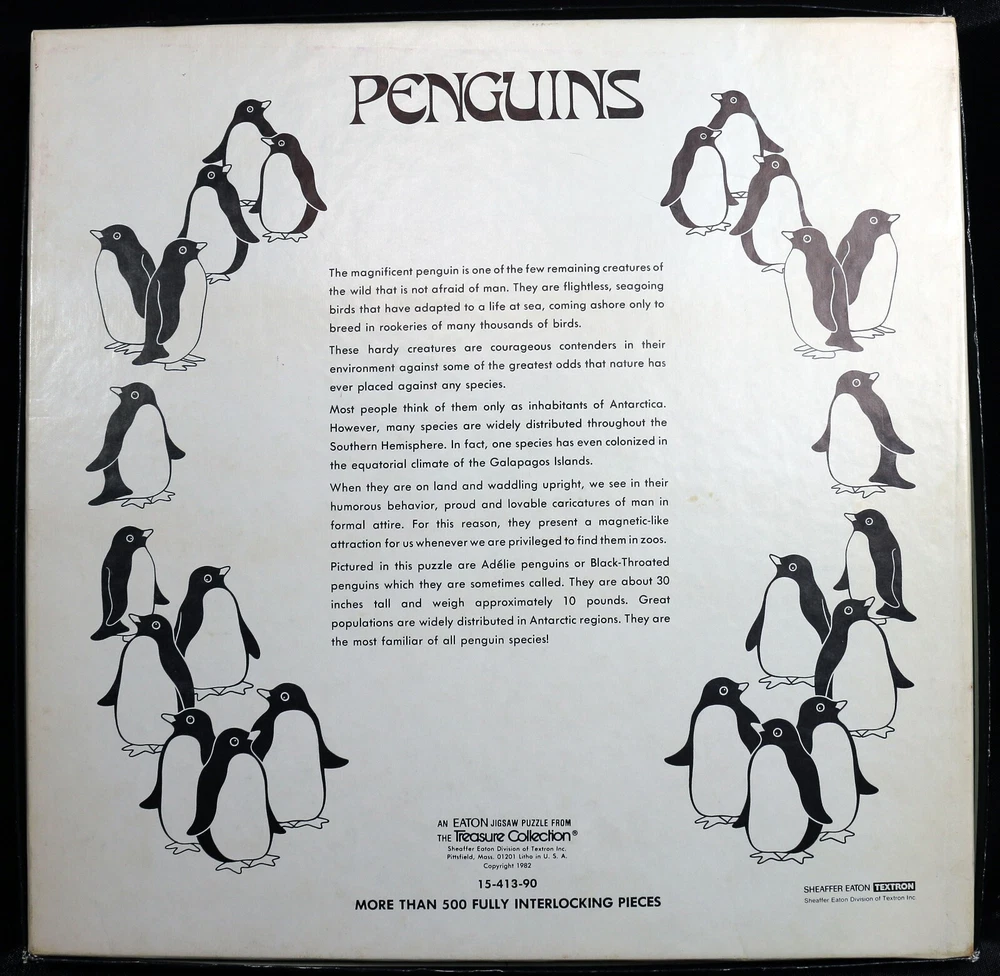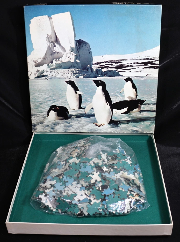 This vintage Eaton jigsaw puzzle from 1982 features adorable penguins and measures 20.5" x 20.5". With over 500 pieces, this puzzle is perfect for puzzle enthusiasts of all ages and skill levels. The puzzle is made of high-quality cardboard and is interlocking, making it easy to assemble. In addition, this puzzle is from a smoke-free home and comes complete with all pieces included. It is recommended for ages 10+ and has been manufactured in the United States. This puzzle is a great addition to any collection or a fun activity for anyone who loves puzzles or penguins. Doing puzzles has some hidden benefits Excellent qualities : Cultivate concentration, patience, and temper your will Movement development : Train hand-eye coordination and precise small movements Spatial intelligence : Improve visual discrimination of colors and shapes Critical thinking ability : Understand the relationship between parts and the whole, and draw inferences from one example to explore the future Relaxes your mind : Relieve work pressure and release yourself Brain development : Enhance memory and may help prevent or slow brain degeneration Puzzle pieces are all bagged. Each item we ship is carefully packaged to prevent any damage and is shipped immediately with tracking. Anticipated Benefits of Puzzles for Children Overcoming attention deficit Strengthening visual memory Improving problem solving skills Strengthening hand-eye coordination Improve fine motor skills Improve gross motor skills Shape recognition ability Gain the ability of setting goals Learning patience