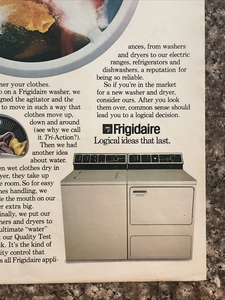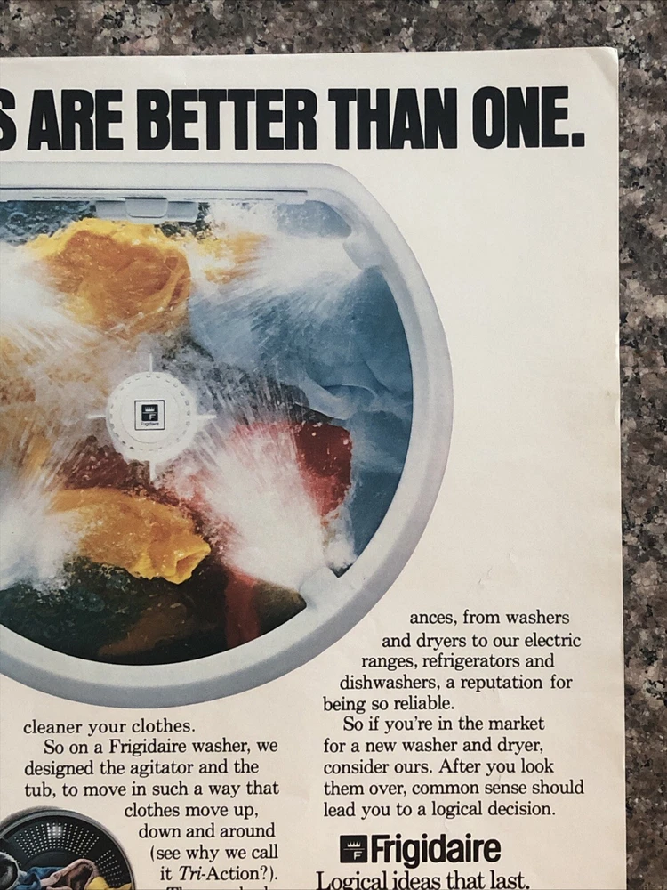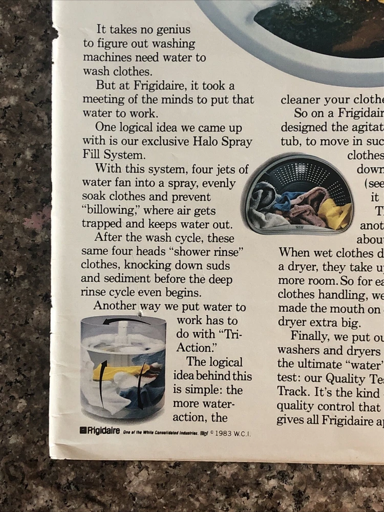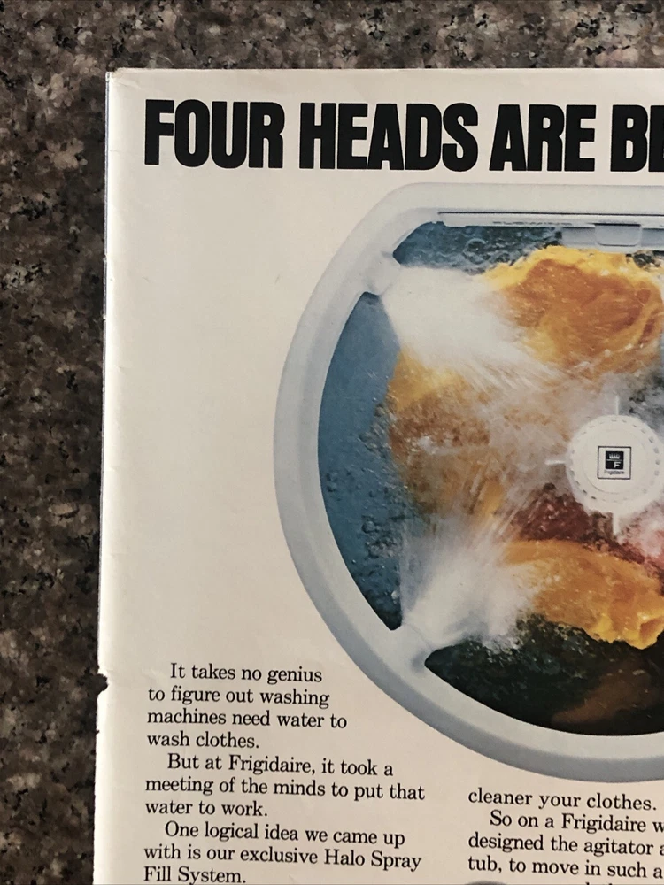 The product is a vintage 1983 Frigidaire Washer magazine print ad featuring the Halo Spray Fill System with four heads. The ad showcases the appliance in a multi-color design and promotes its features. It was created in the United States and measures approximately 10"x12". The ad highlights the innovative technology of the washer and is a collectible piece from the 1980s.