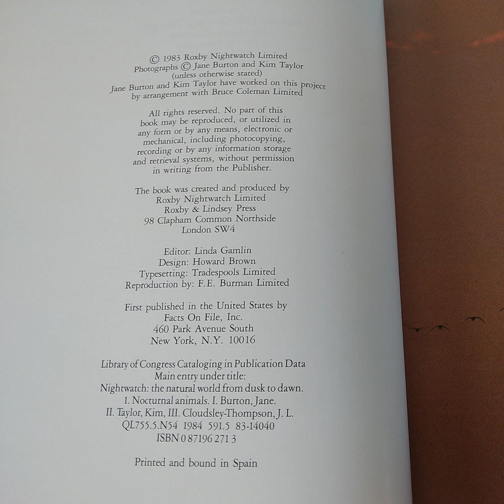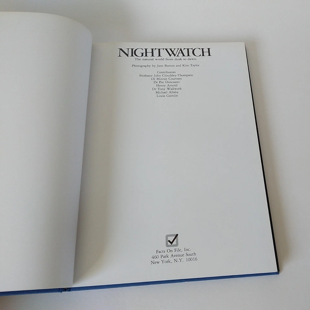 Country/Region of Manufacture: United States gtin13: Does not apply Topic: Nocturnal Animals Publication Year: 1983 Publisher: Facts On File Inc. Title: Nightwatch Custom Bundle: No Subjects: Nocturnal Animals Ex Libris: No Edition: First Edition Special Attributes: 1st Edition Book Series: Nightwatch Signed: No Features: Dust Jacket, Illustrated, 1st Edition Era: 1980s Format: Hardcover Series: N/A Regional Cuisine: N/A Cookery Topic: Not Applicable Book Title: Nightwatch Vintage: Yes Modified Item: No Age Level: Adults, Young Adults ISBN: Does not apply Number of Pages: 190 Narrative Type: Nonfiction Country: United States City: N/A Item Weight: 2 lb 4 oz Literary Movement: Modernism Item Width: 3/4" Genre: Nature, Animals Region: United States Type: Picture Book Item Height: 11-1/2" Original Language: English Personalized: No Inscribed: No Language: English Signed By: N/A Personalize: No Intended Audience: Ages 4-8, Ages 9-12, Young Adults, Adults Item Length: 8-1/2" Author: Various