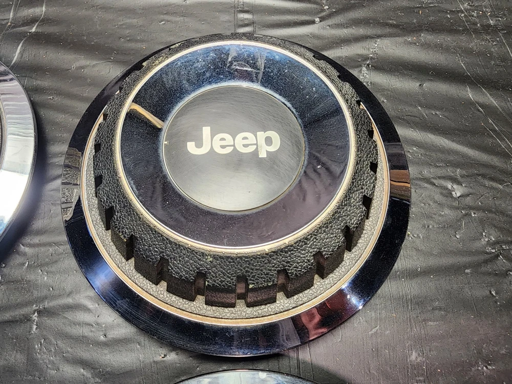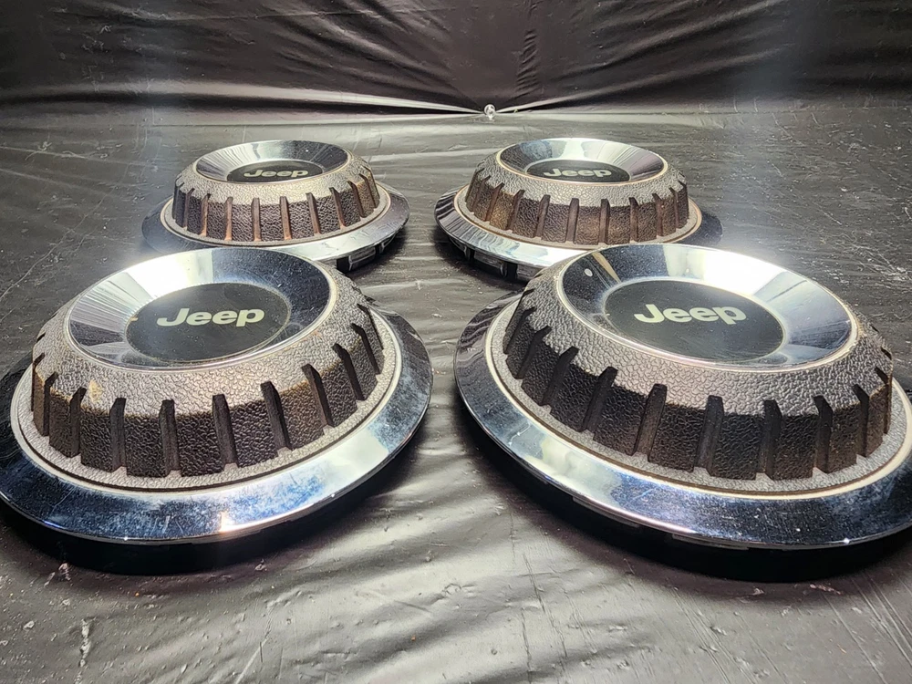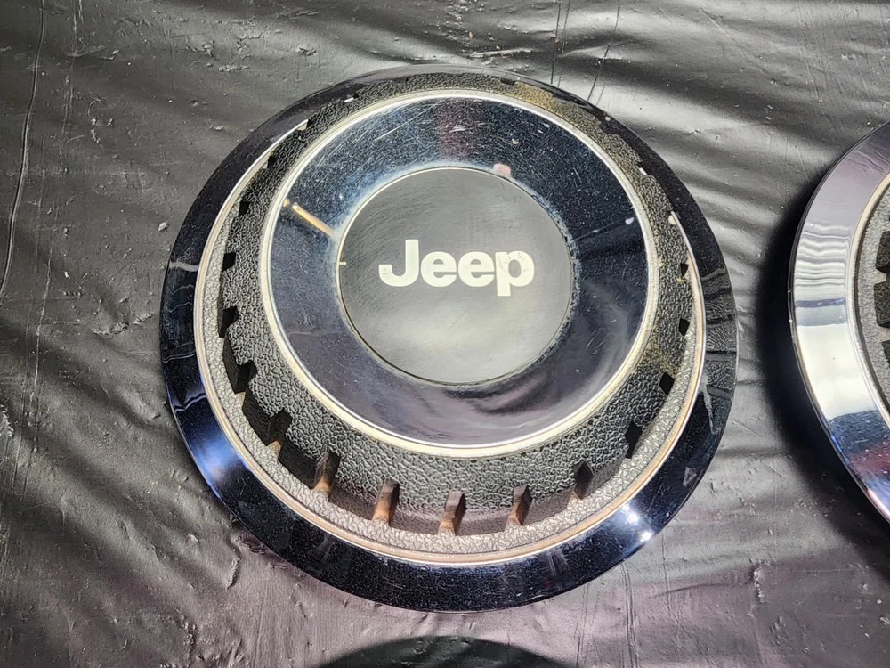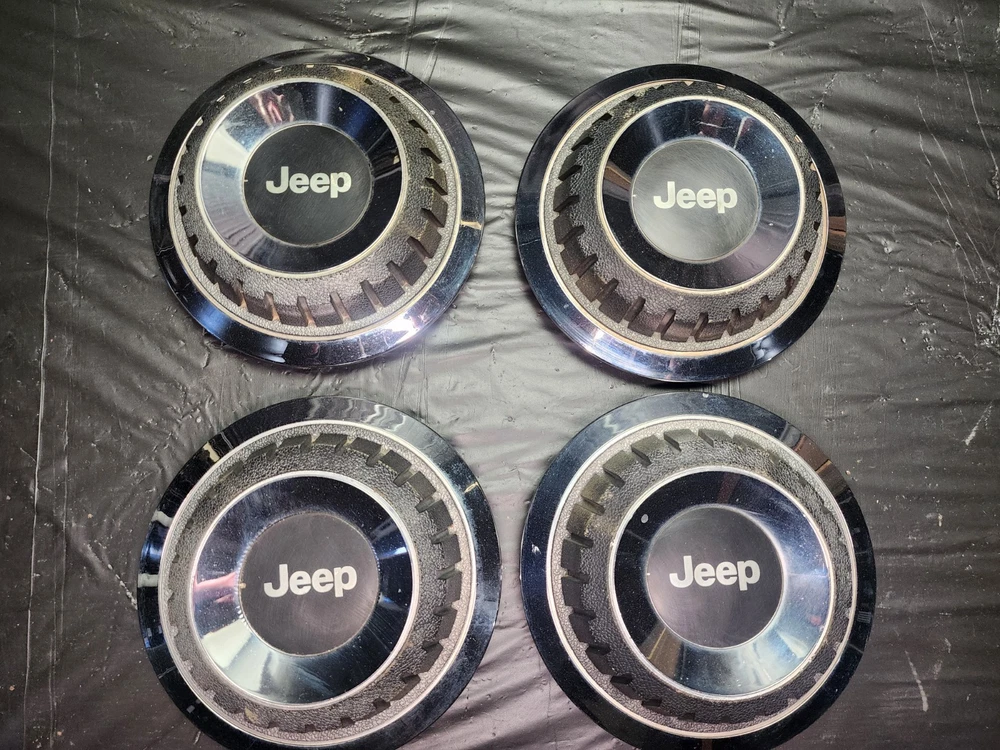 Vintage 40s 50s 60s 70s hub caps. 1984-1991 jeep set of 4 Original OEM Factory OE hubcaps wheel covers center caps. in good condition considering their age and being used. These are Used hubcaps off of old classic cars that were driven on the road and used, so please see photos for complete condition as they are not all perfect. Most have some fading, dings, scuffing, mineral staining, etc could use a good polishing to bring em back to full shine, but otherwise in beautiful condition. Check out more of my ebay page as we are going through and listing a ton of classic / vintage hubcaps from the the 20's 30's 40's 50's 60's 70's 80's 90's 00's and up. all different makes and models such as Ford Chevy Chevrolet GM Cadillac GMC camero nova Chevelle Nomad Bel Air Mercury Corvette Mustang Oldsmobile Pontiac Lincoln Dodge Plymouth Buick Chrysler Mopar Fairlane Volkswagen Cheiftain Challanger Charger 1500 4x4 muscle car hot rod rat rod Cars and Trucks 15in 14in 16in and so much more from full sets to sets of 2 and singles, you name it check us out!