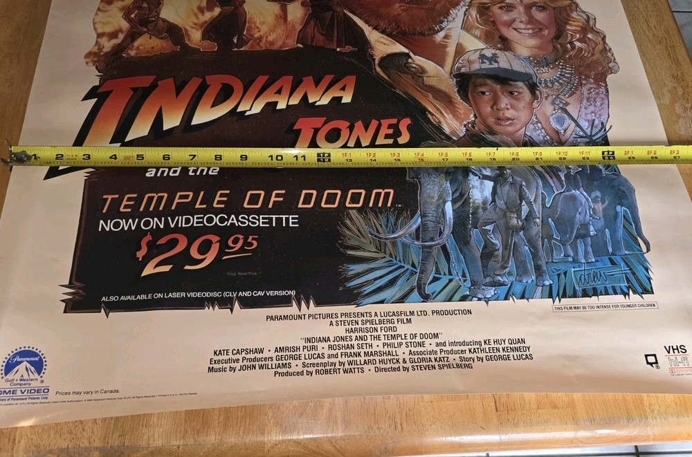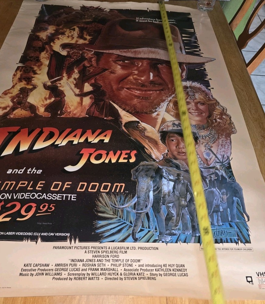 This 1984 Indiana Jones and the Temple of Doom movie promo poster measures 27 x 40 inches and is an original piece from the United States film industry. Perfect for movie memorabilia collectors, this poster captures the essence of the iconic adventure film starring Harrison Ford as Indiana Jones. With its authentic design and nostalgic appeal, this poster is a must-have for fans of the franchise or those looking to add a piece of cinematic history to their collection. Poster has a few flaws on the white border only. One tear and some creasing around the border. Poster is rolled but has never been folded. Pics shows the flaws.